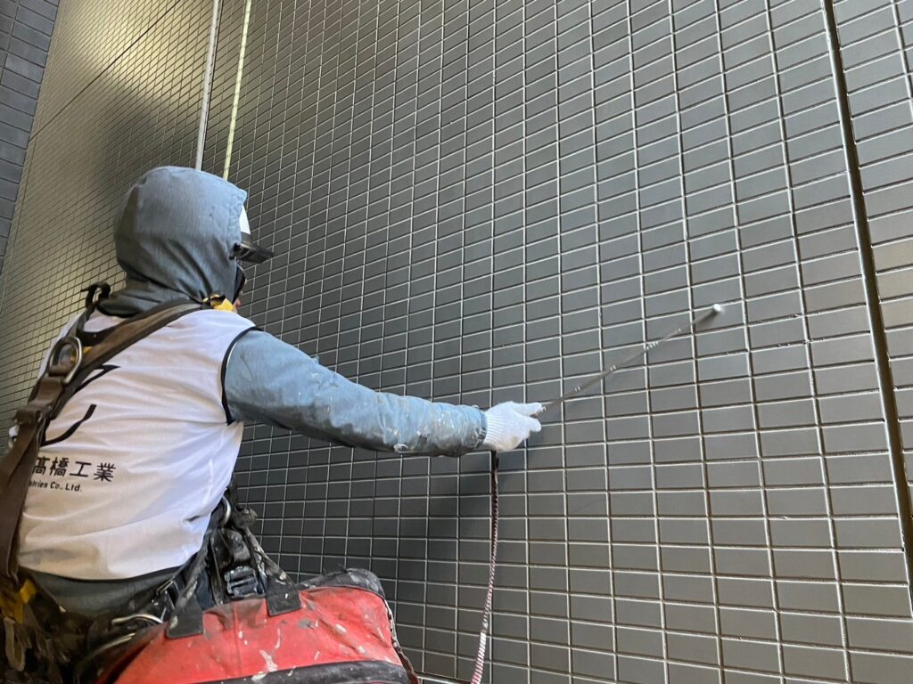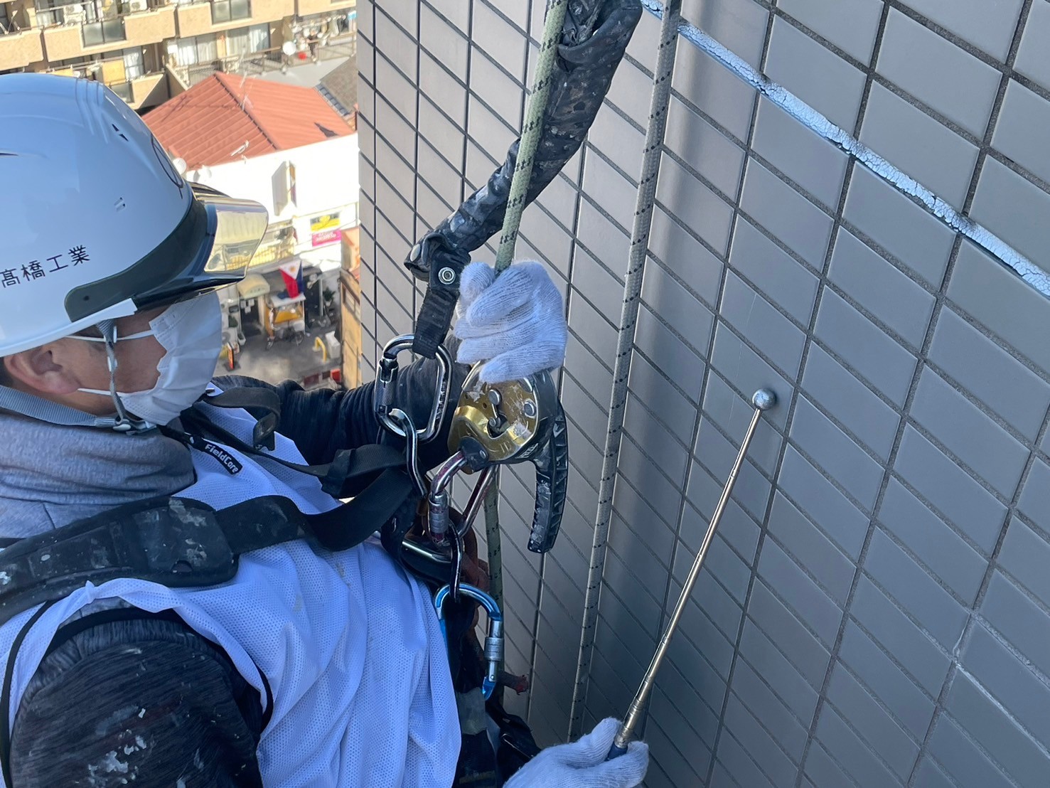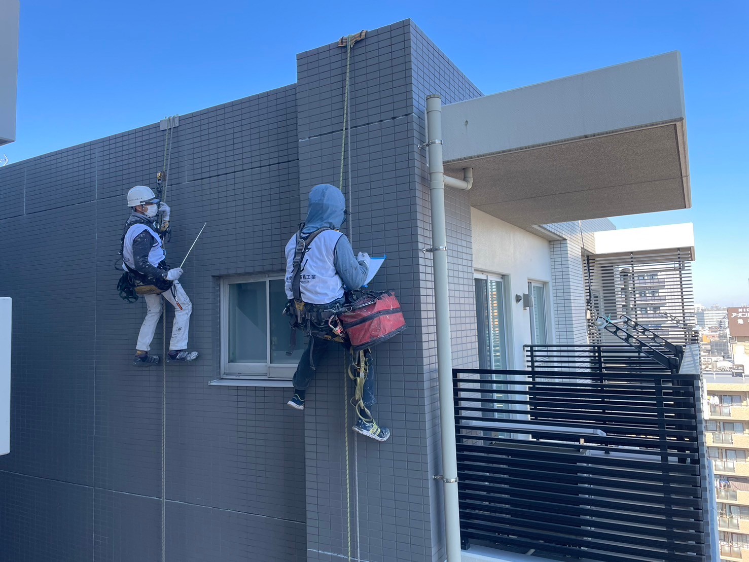 2月26日にロープアクセス(ブランコ)でタイルの調査を行いました。