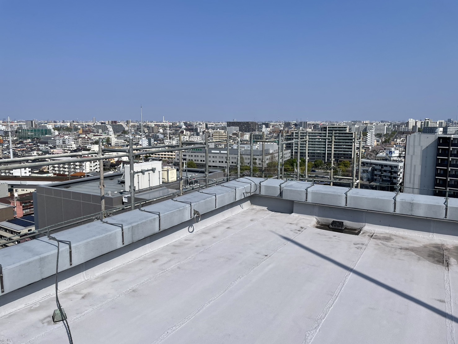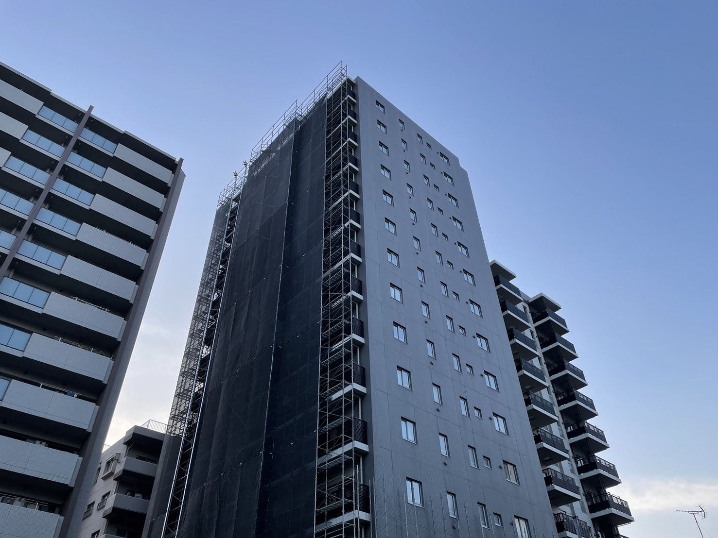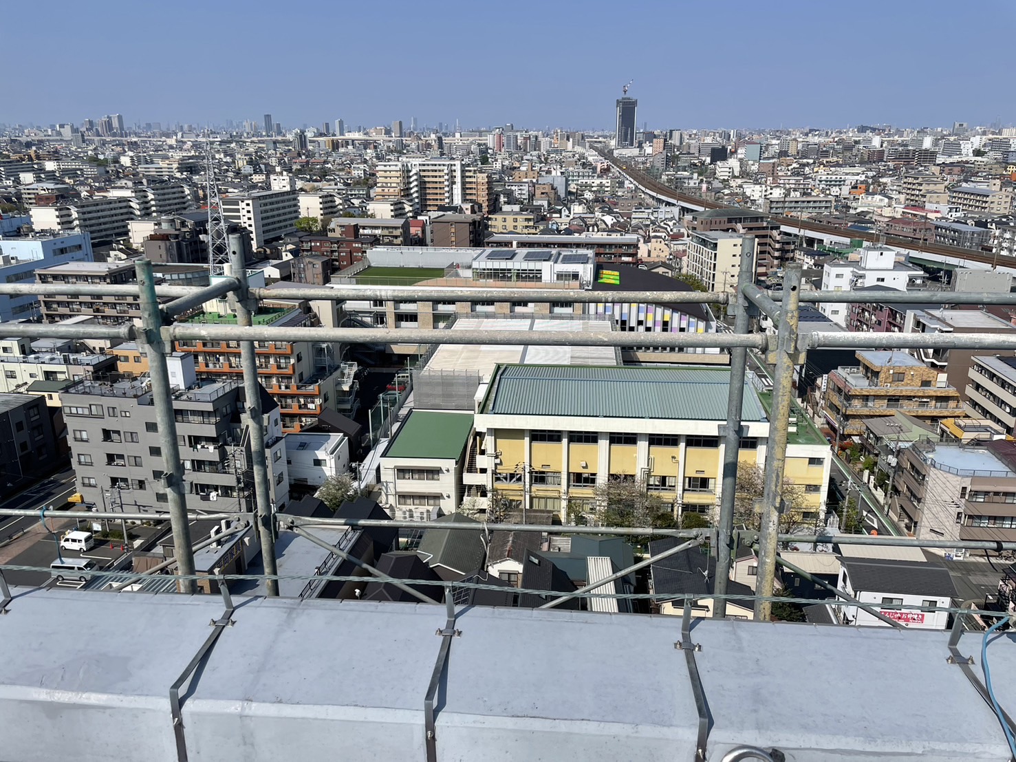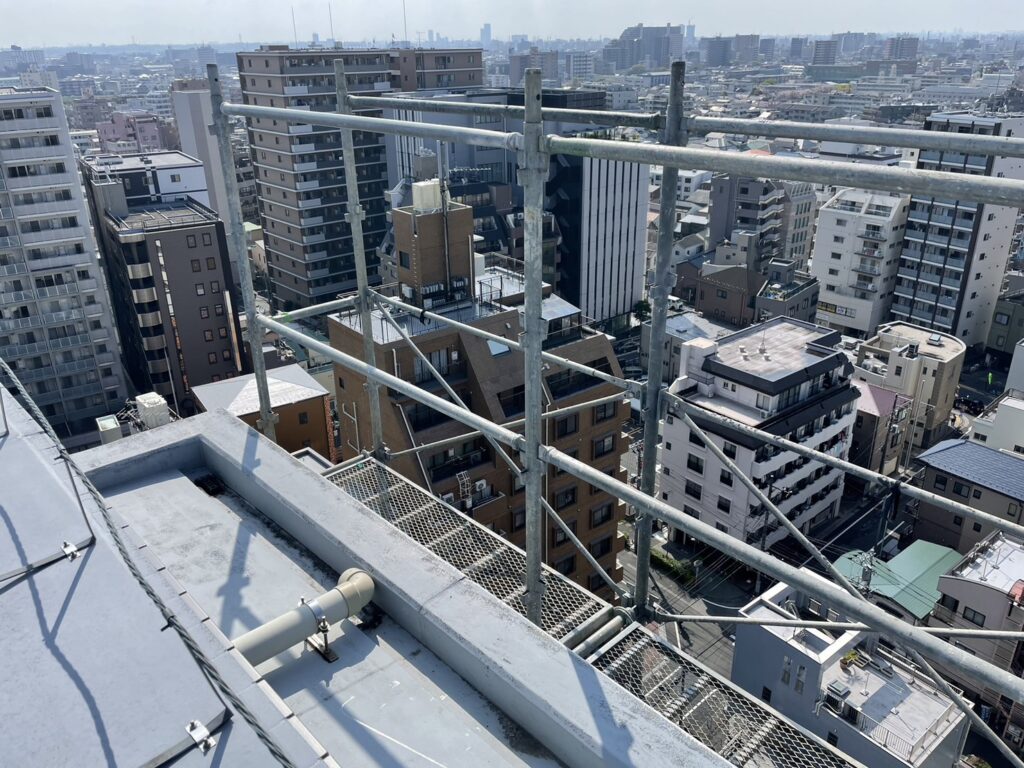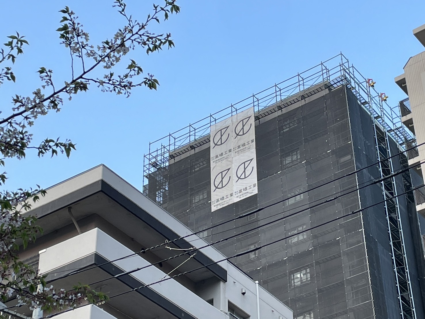 A棟西面、南面の屋上への壁つなぎ固定、飛散養生メッシュや看板シートの設置、東面と北面の組立工事をおこないました。