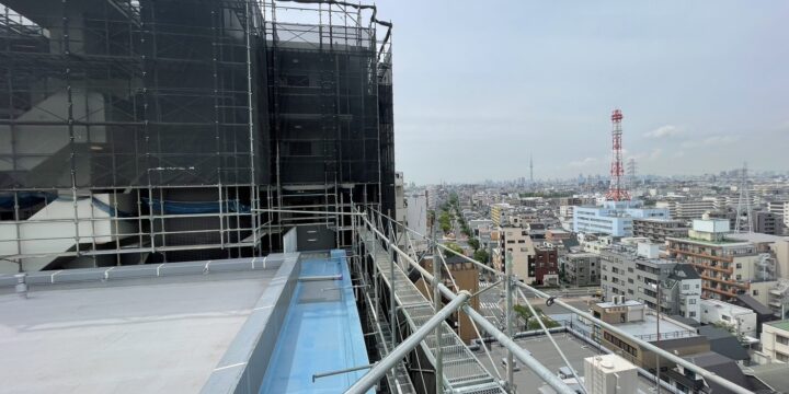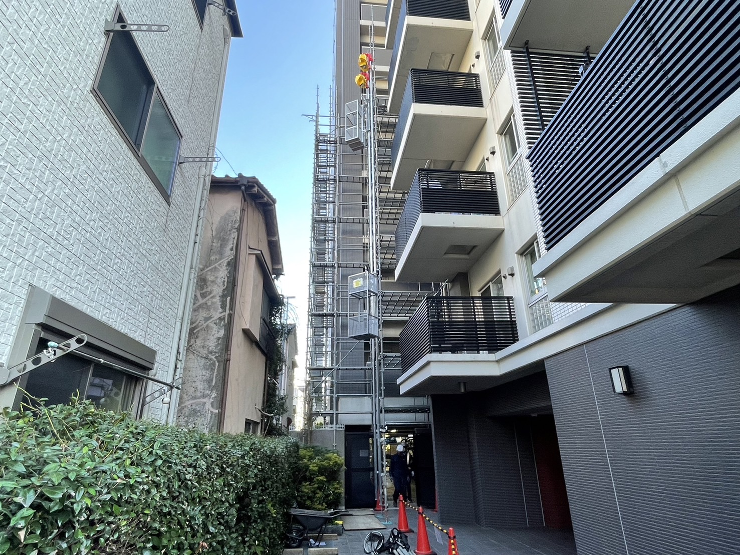 A棟共用廊下、エレベーター周りを5階と6階の間まで組みあがりました。