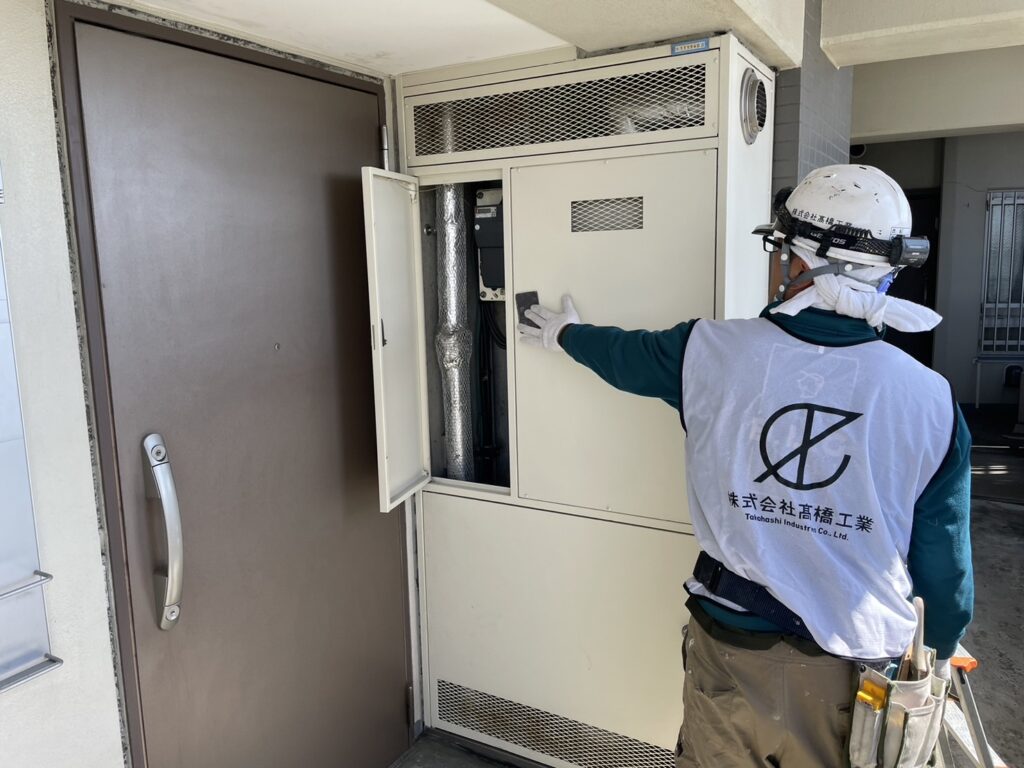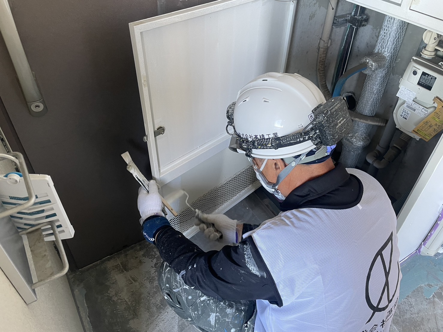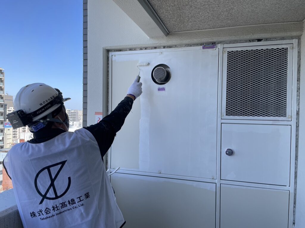 共用廊下の15階~13階まで錆止め作業をいたしました。