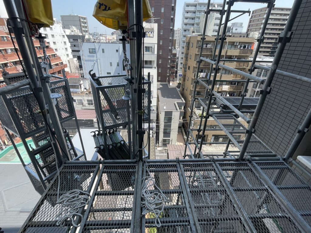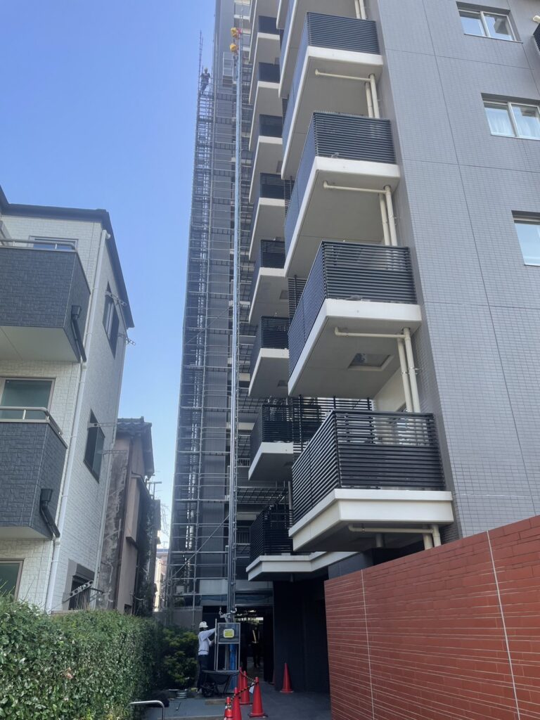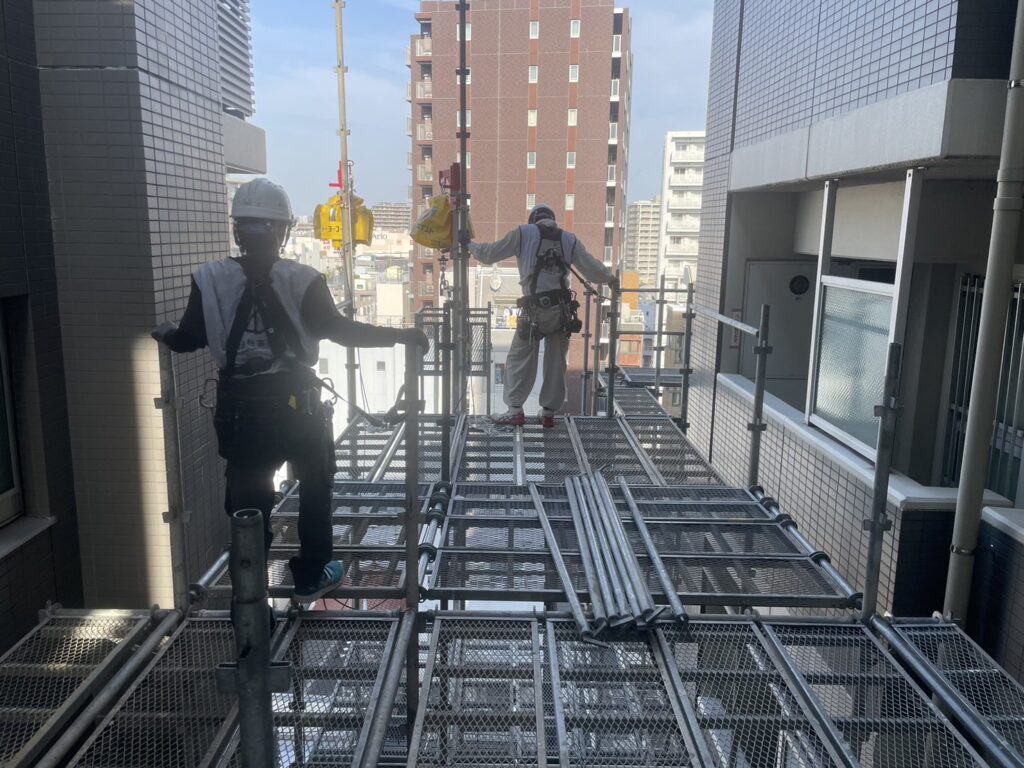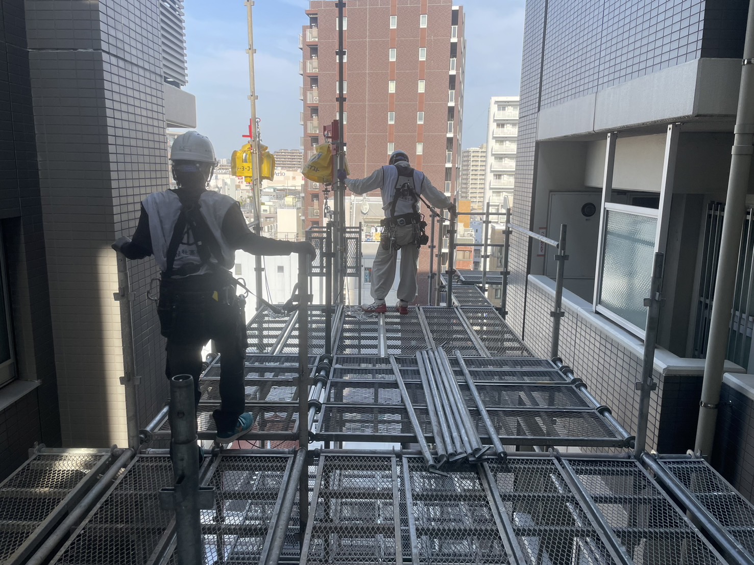 A棟北面、B棟南面の足場は10階まで立ち上がりました。