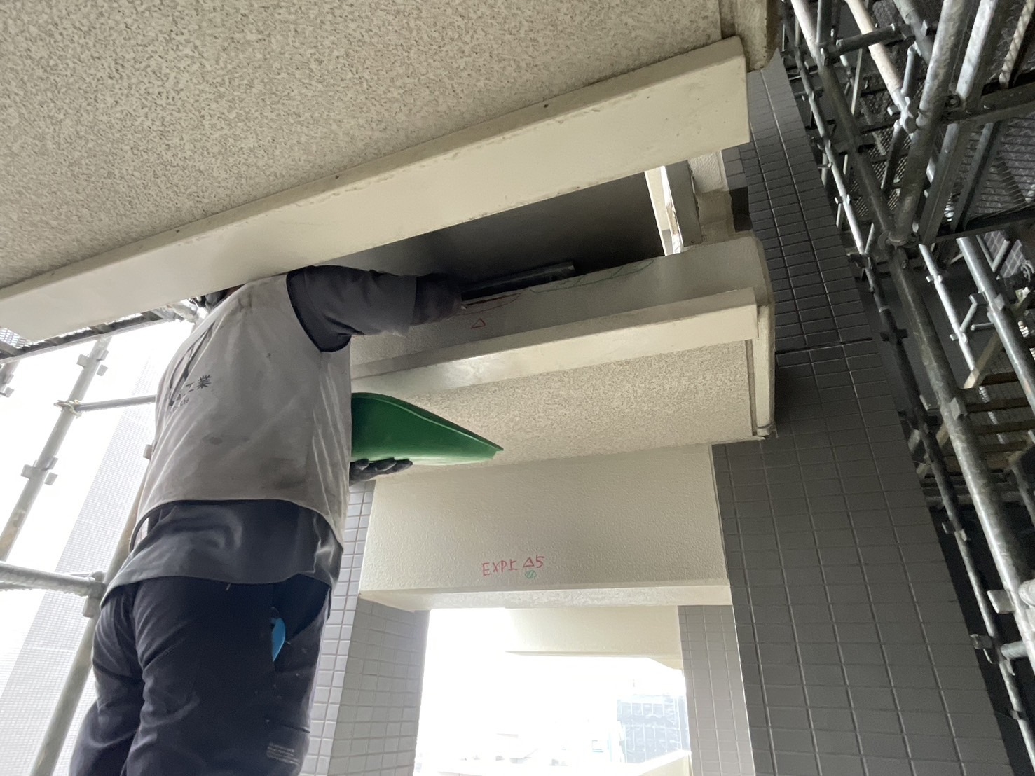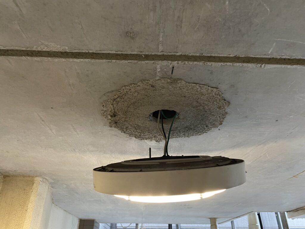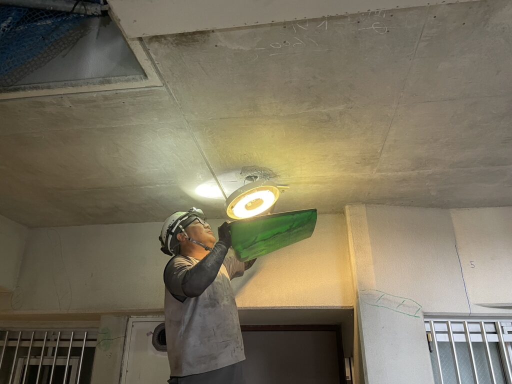 共用廊下に内の天井、壁の欠損・爆裂、浮き等の剥がれ落ちてくるリスクのある壁の剥がし・斫りをおこないました。