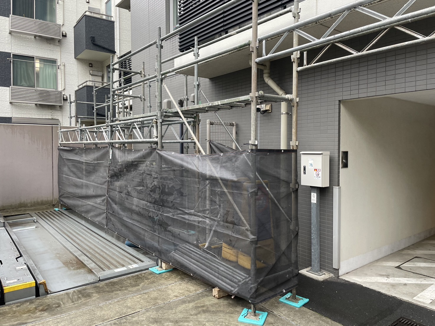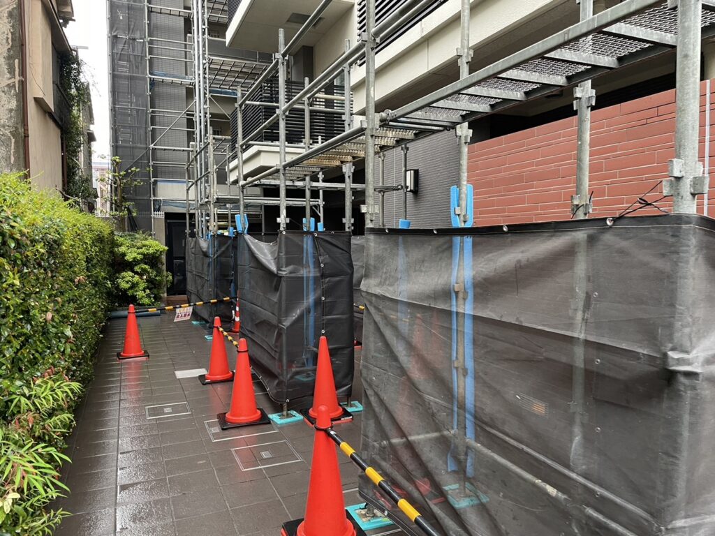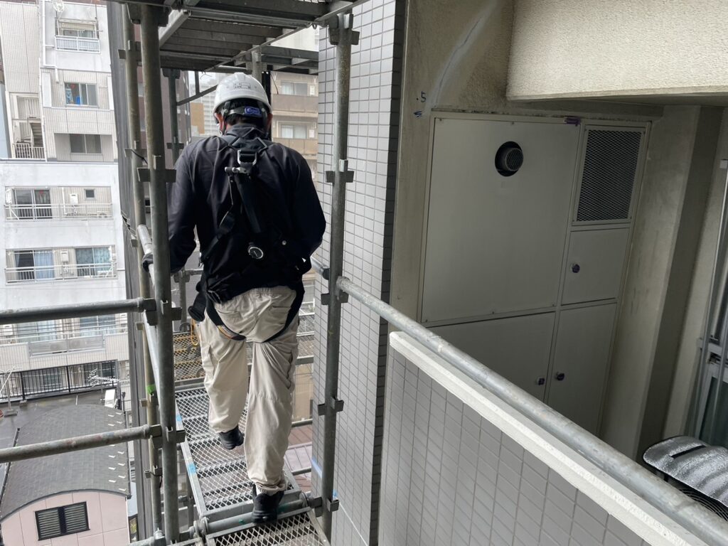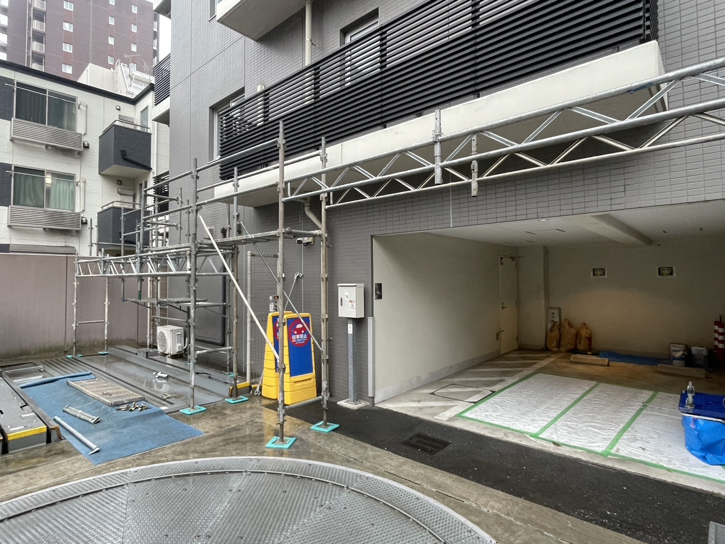 共用廊下に内の天井、壁の欠損・爆裂、浮き等の剥がれ落ちてくるリスクのある壁の剥がし・斫りをおこないました。