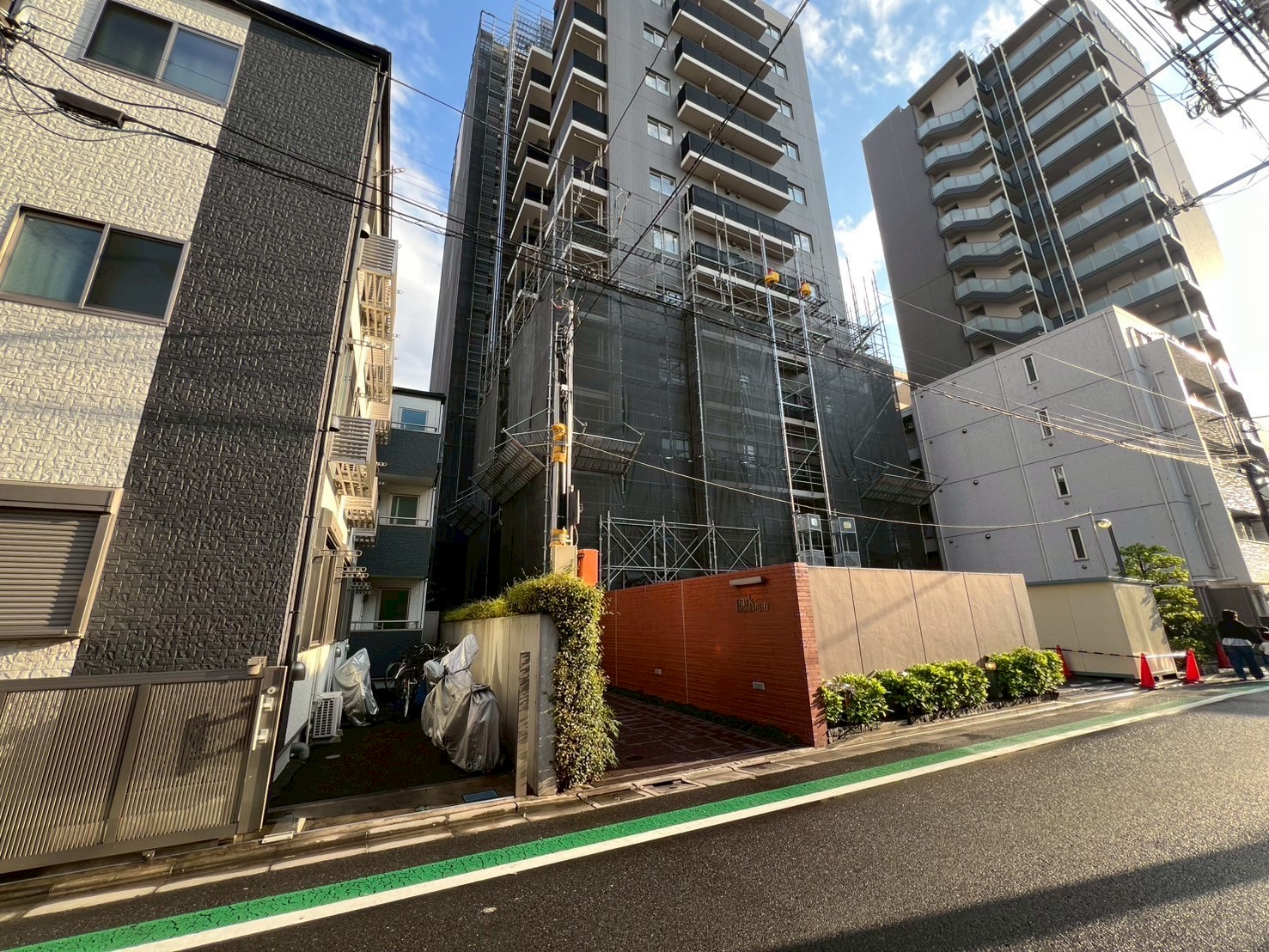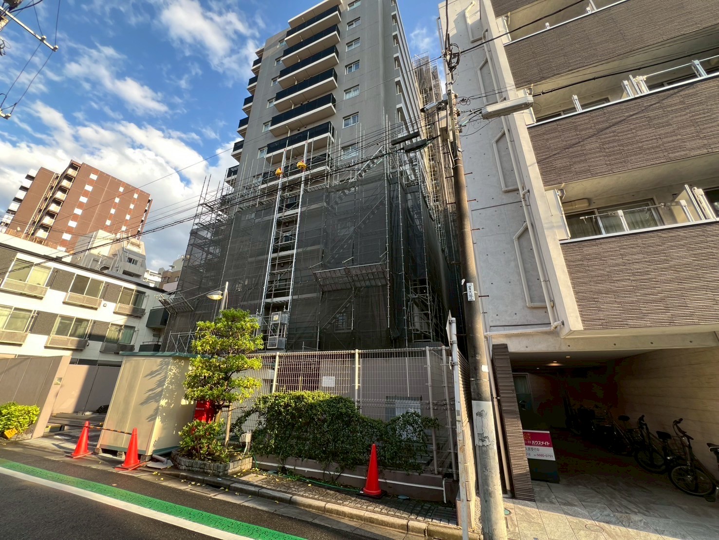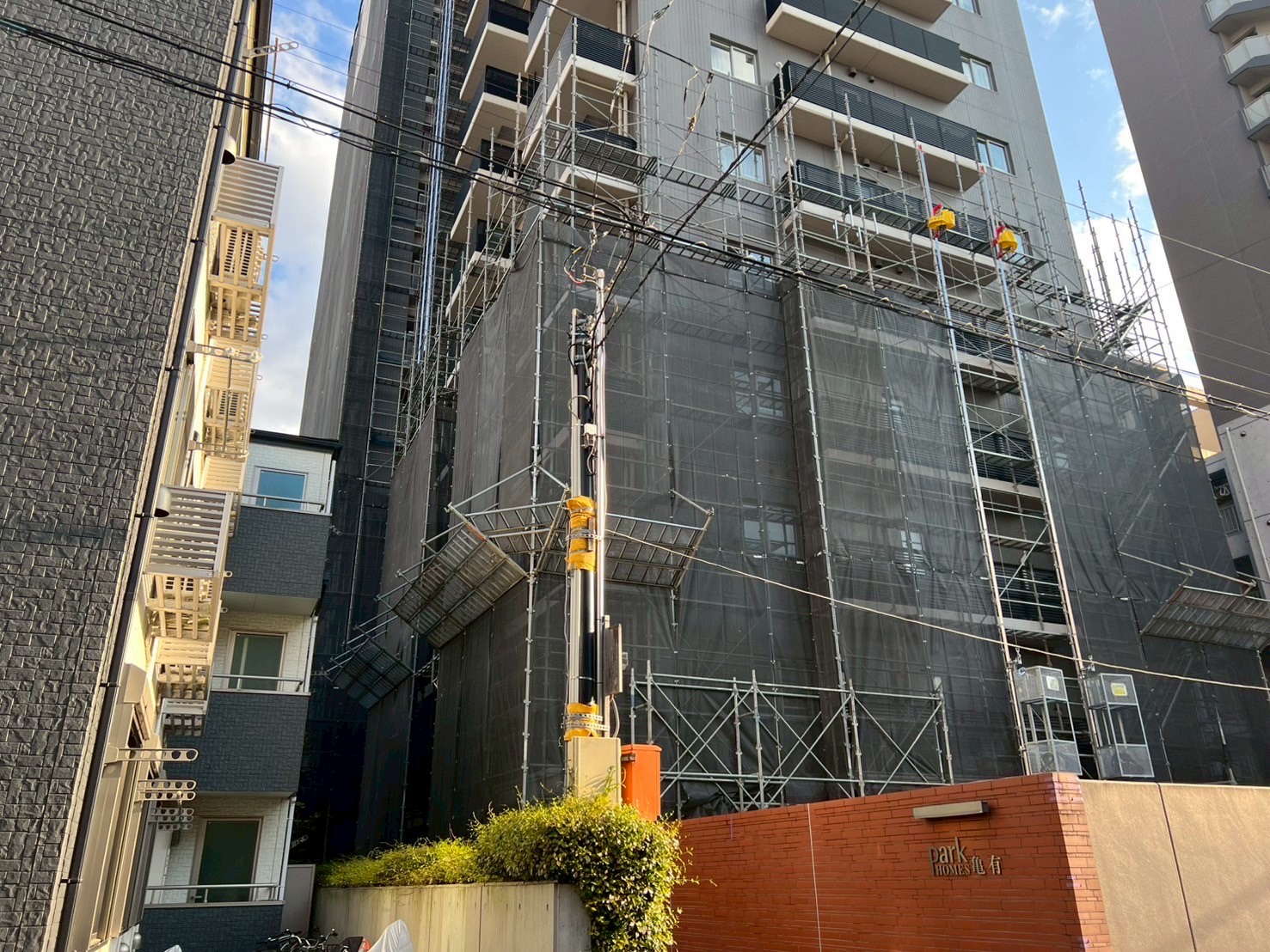 1階エントランス周り(エントランスポーチ)に朝顔(落下防止養生)を設置いたしました。