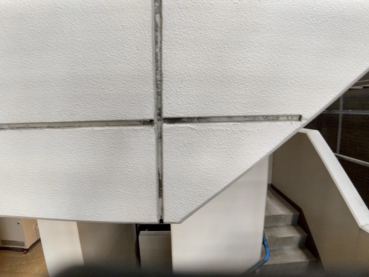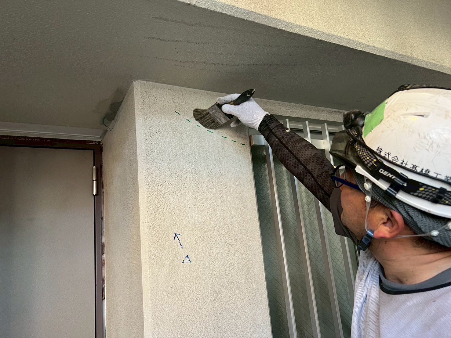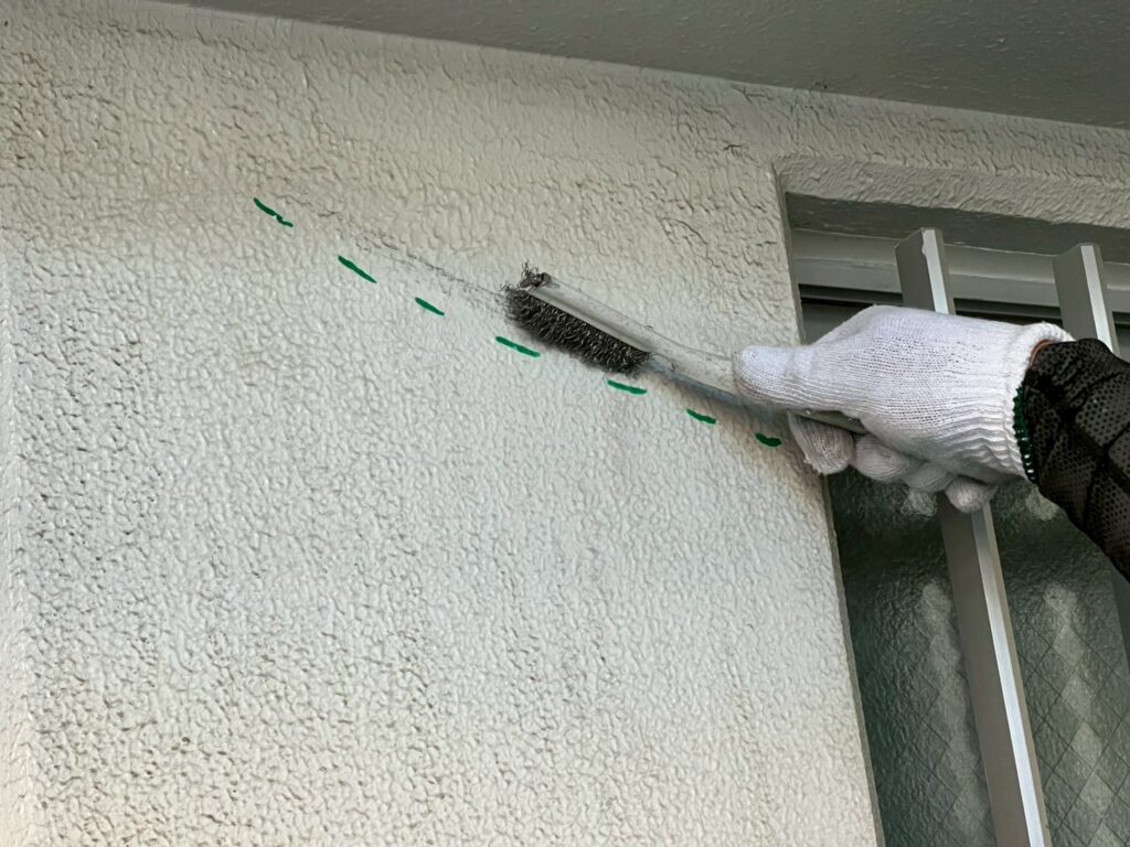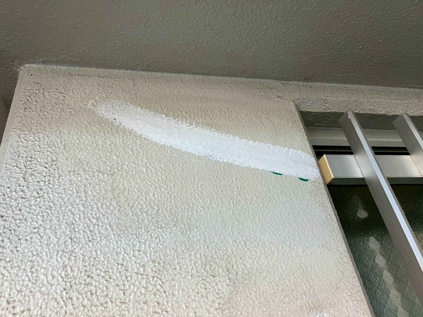 共用部、A棟北面外壁の経年劣化によりブリードした補修跡(経年劣化により材料に含まれる可塑剤の影響で表面に滲み出て塗料の汚れに反応し黒ずみする現象)の補修をおこないました。軽度の箇所はブリードを防ぐ専用プライマーで補修、ブリードが重度の箇所は全て電動工具で斫り削り補修をして綺麗で長持ちする壁に仕上げていきます。