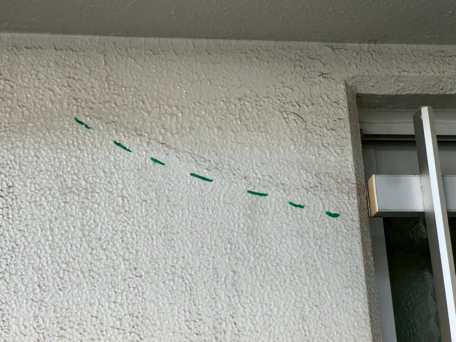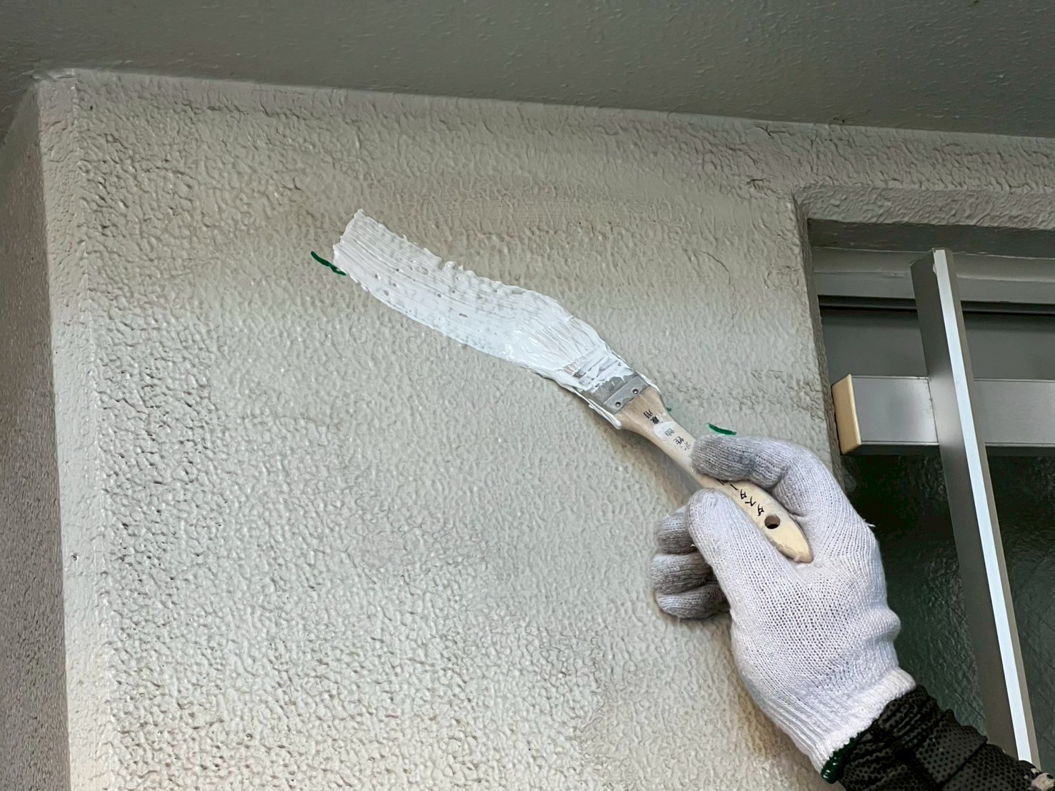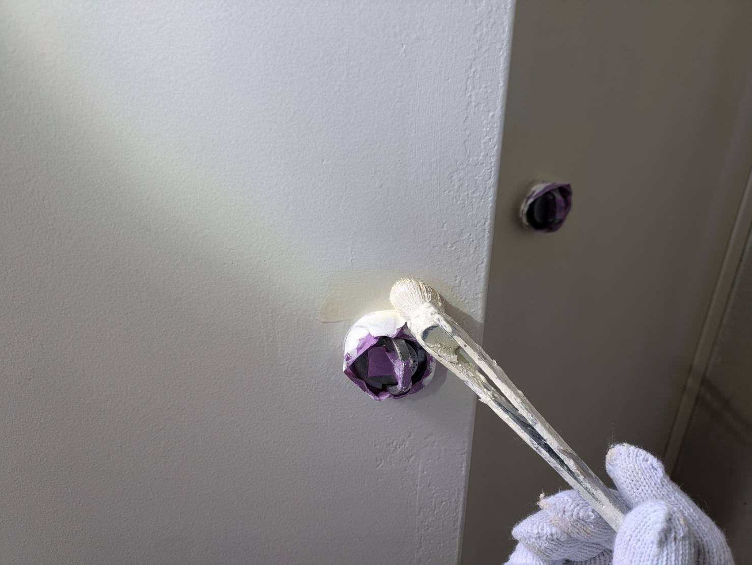共用部、A棟北面外壁の経年劣化によりブリードした補修跡(経年劣化により材料に含まれる可塑剤の影響で表面に滲み出て塗料の汚れに反応し黒ずみする現象)の補修をおこないました。軽度の箇所はブリードを防ぐ専用プライマーで補修、ブリードが重度の箇所は全て電動工具で斫り削り補修をして綺麗で長持ちする壁に仕上げていきます。