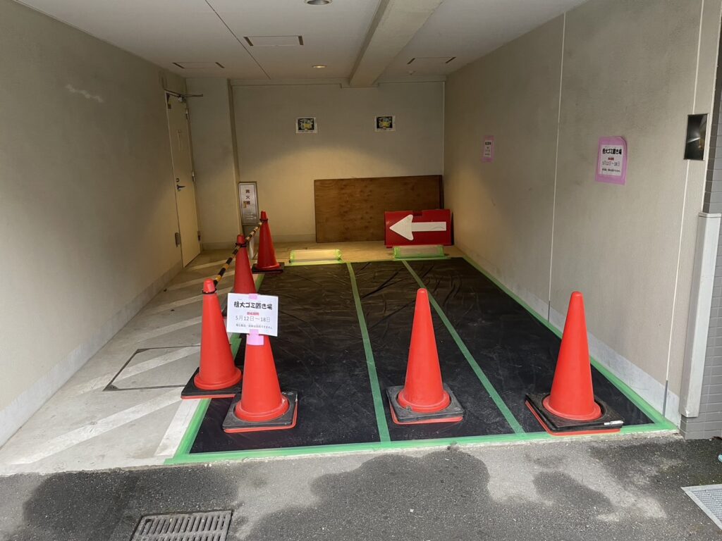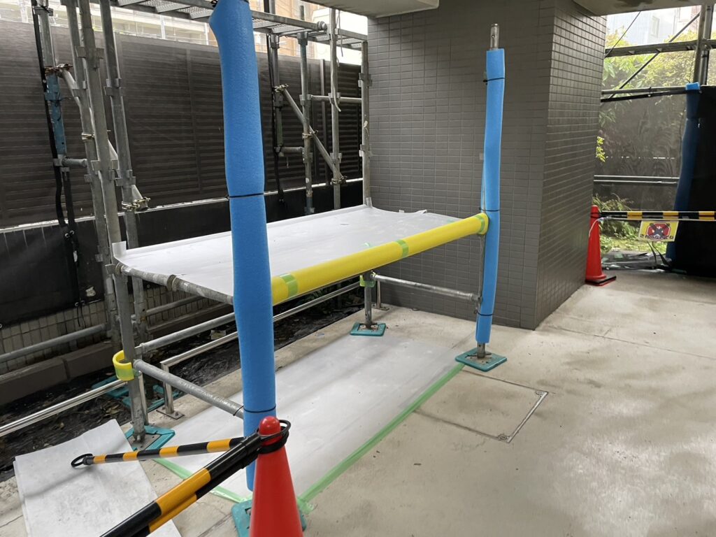 飛散防止養生、落下防止養生、北側駐車場内に棚の設置、ゲートの設置をおこないました。