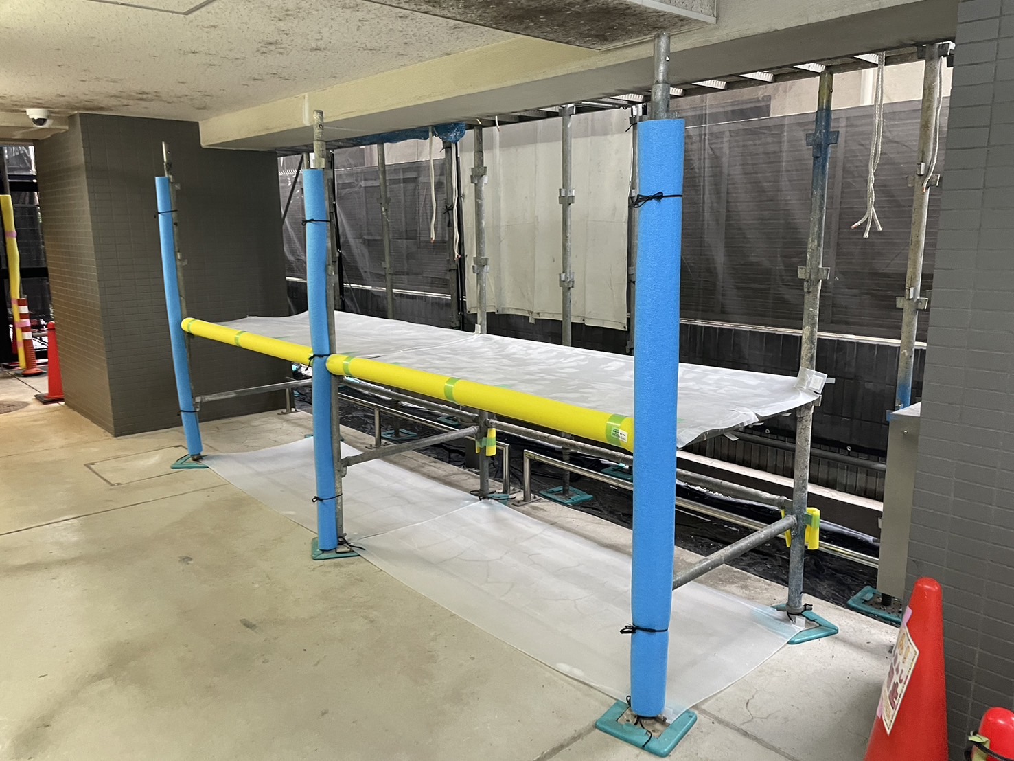 飛散防止養生、落下防止養生、北側駐車場内に棚の設置、ゲートの設置をおこないました。