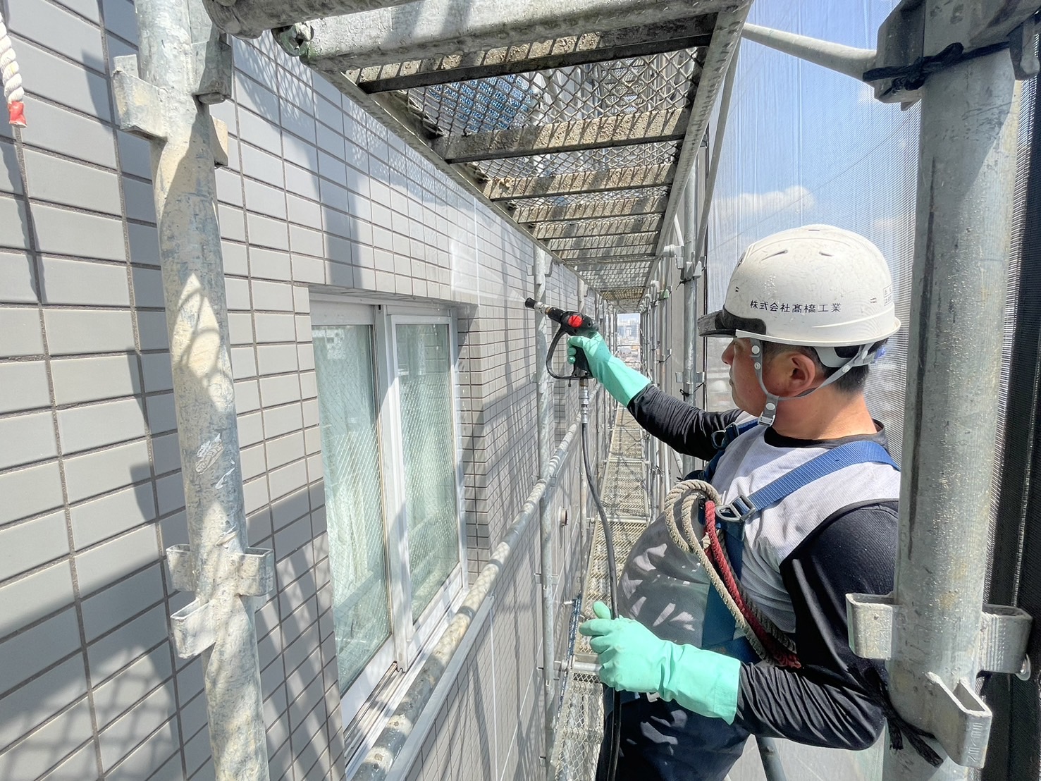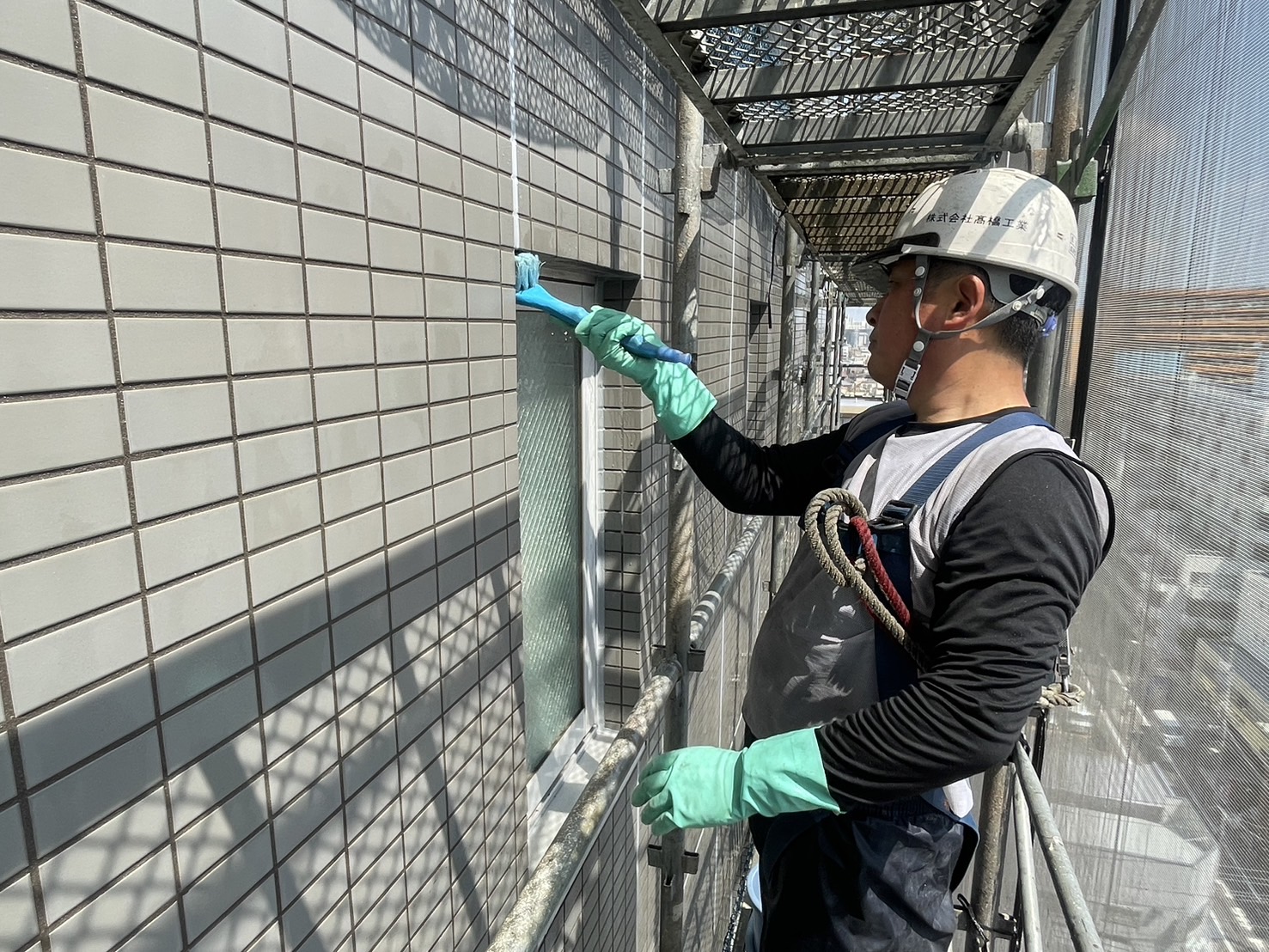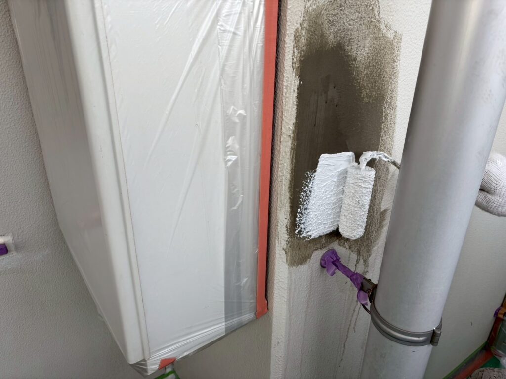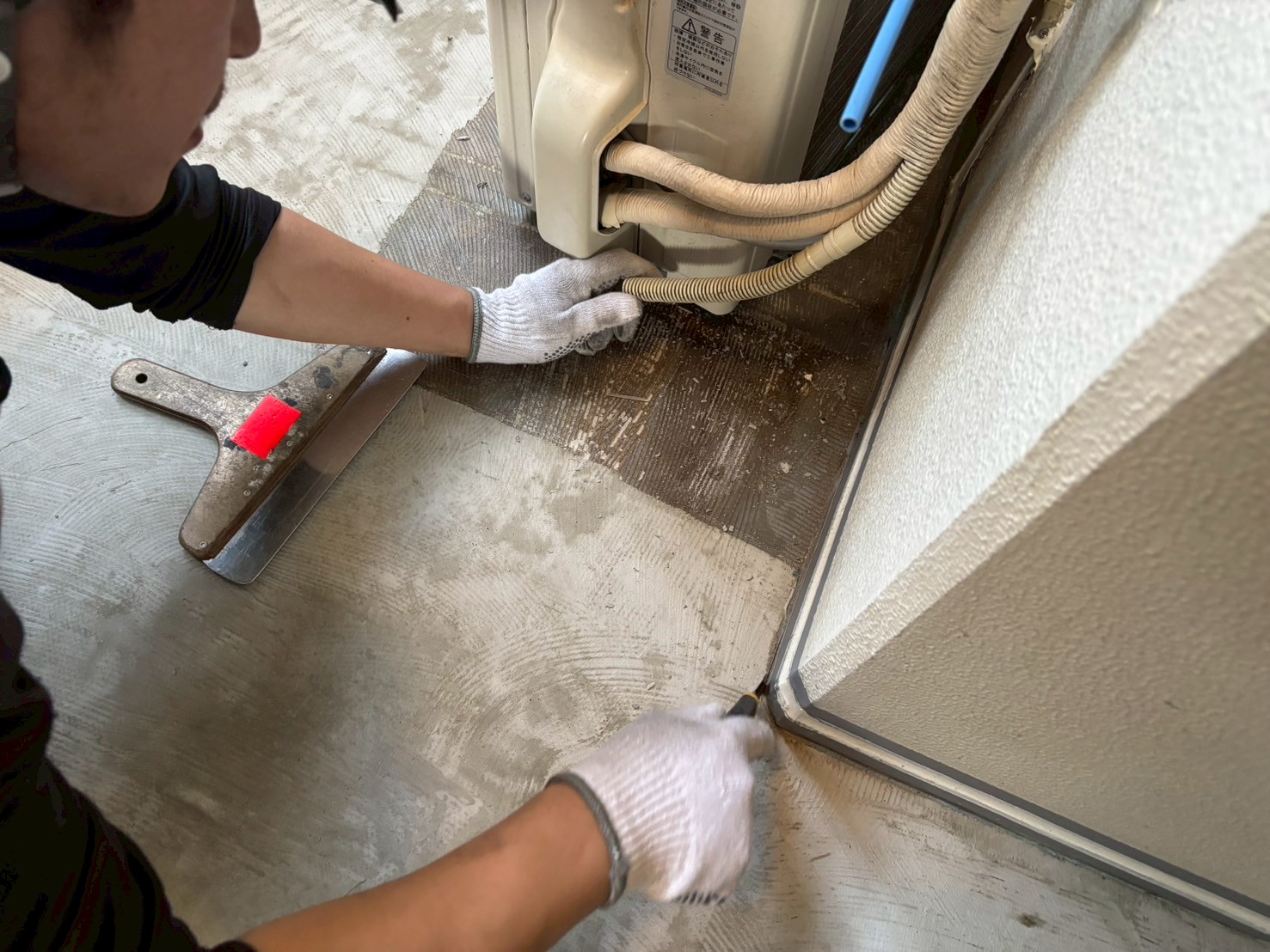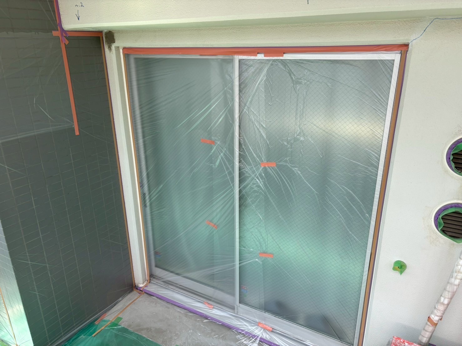 天井や外壁の補修箇所の肌合わせ作業やサッシ(窓)の養生作業をいたしました。