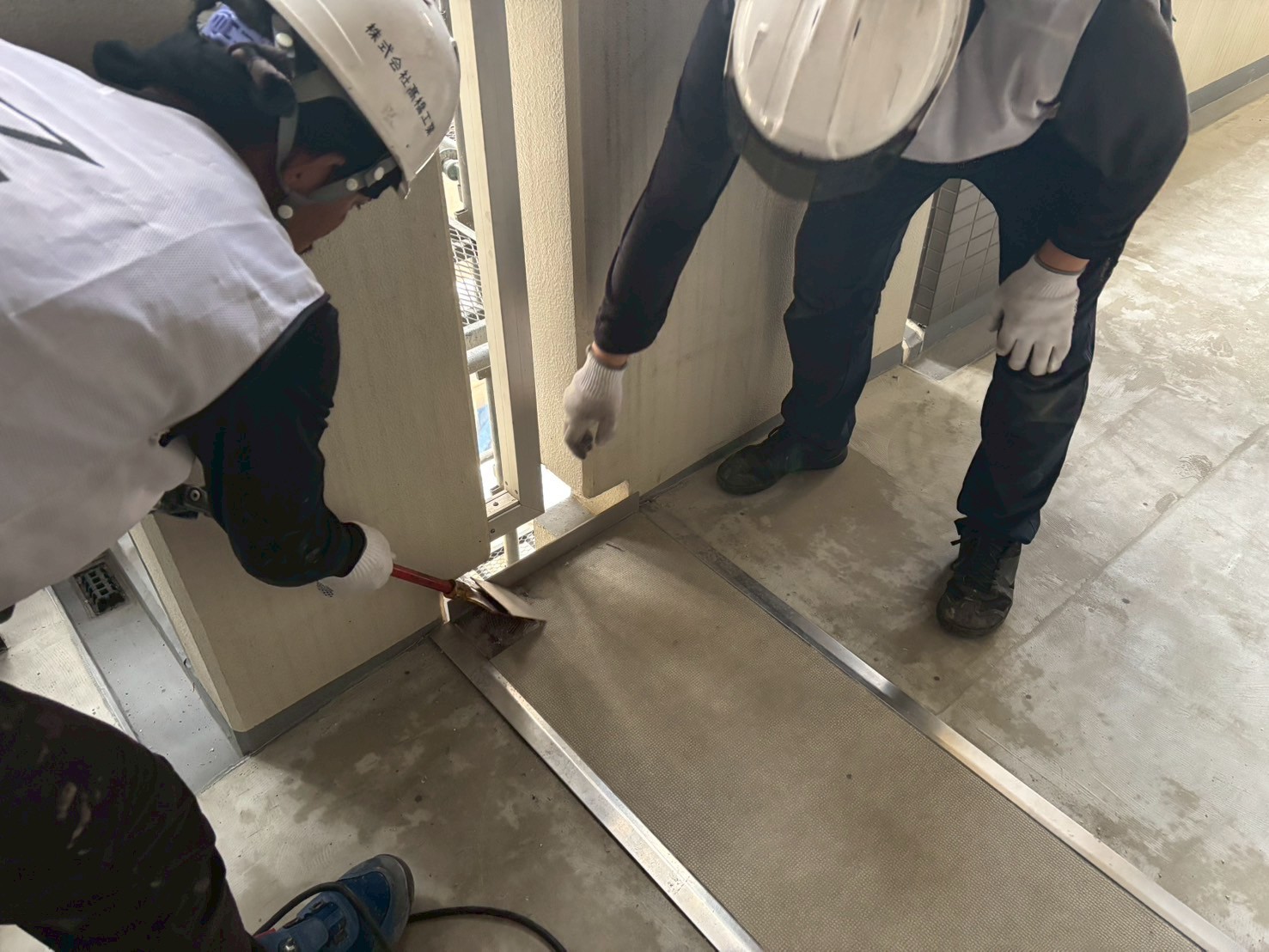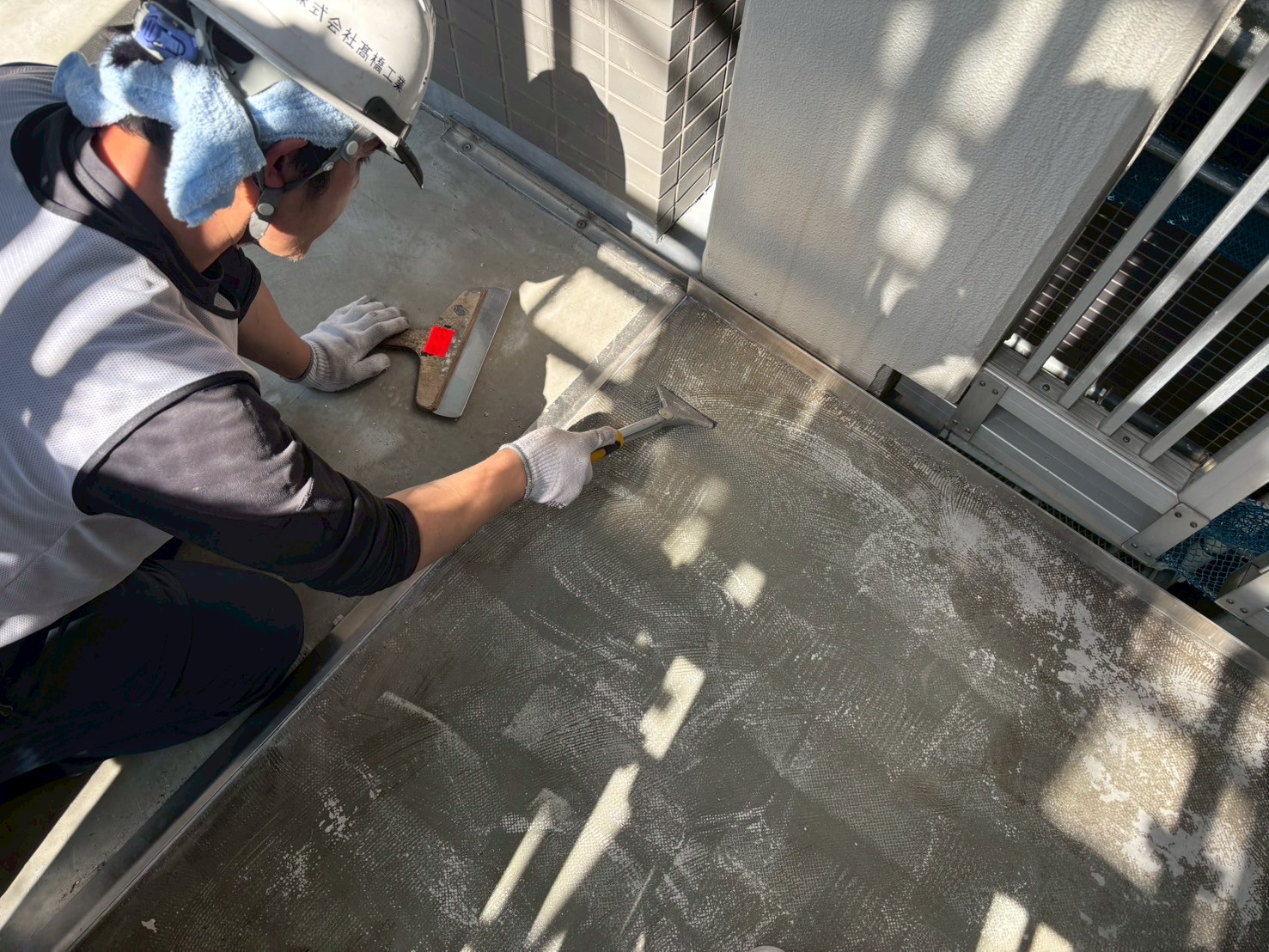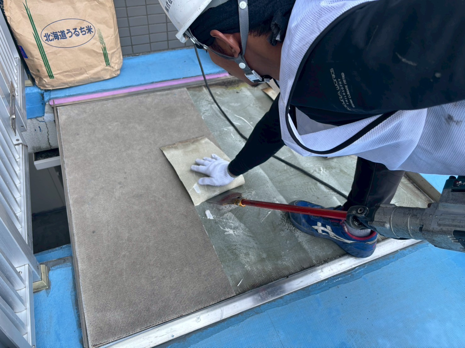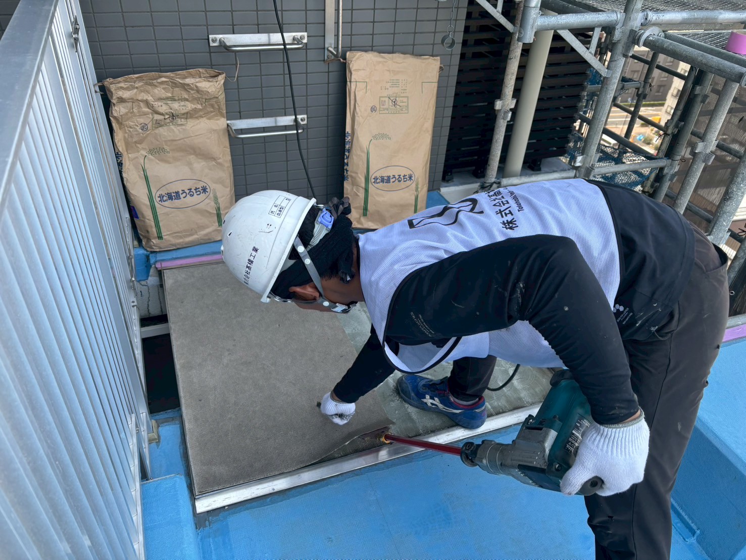 B棟バルコニー、共用廊下の長尺剥がしと下地調整をおこないました。