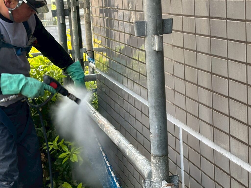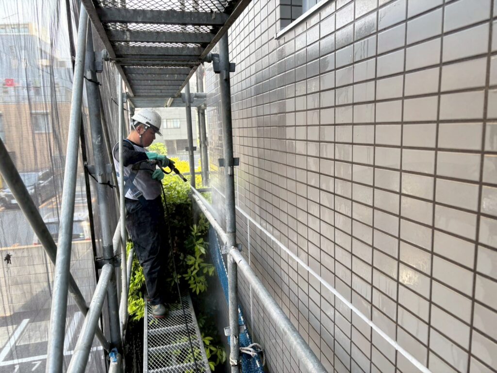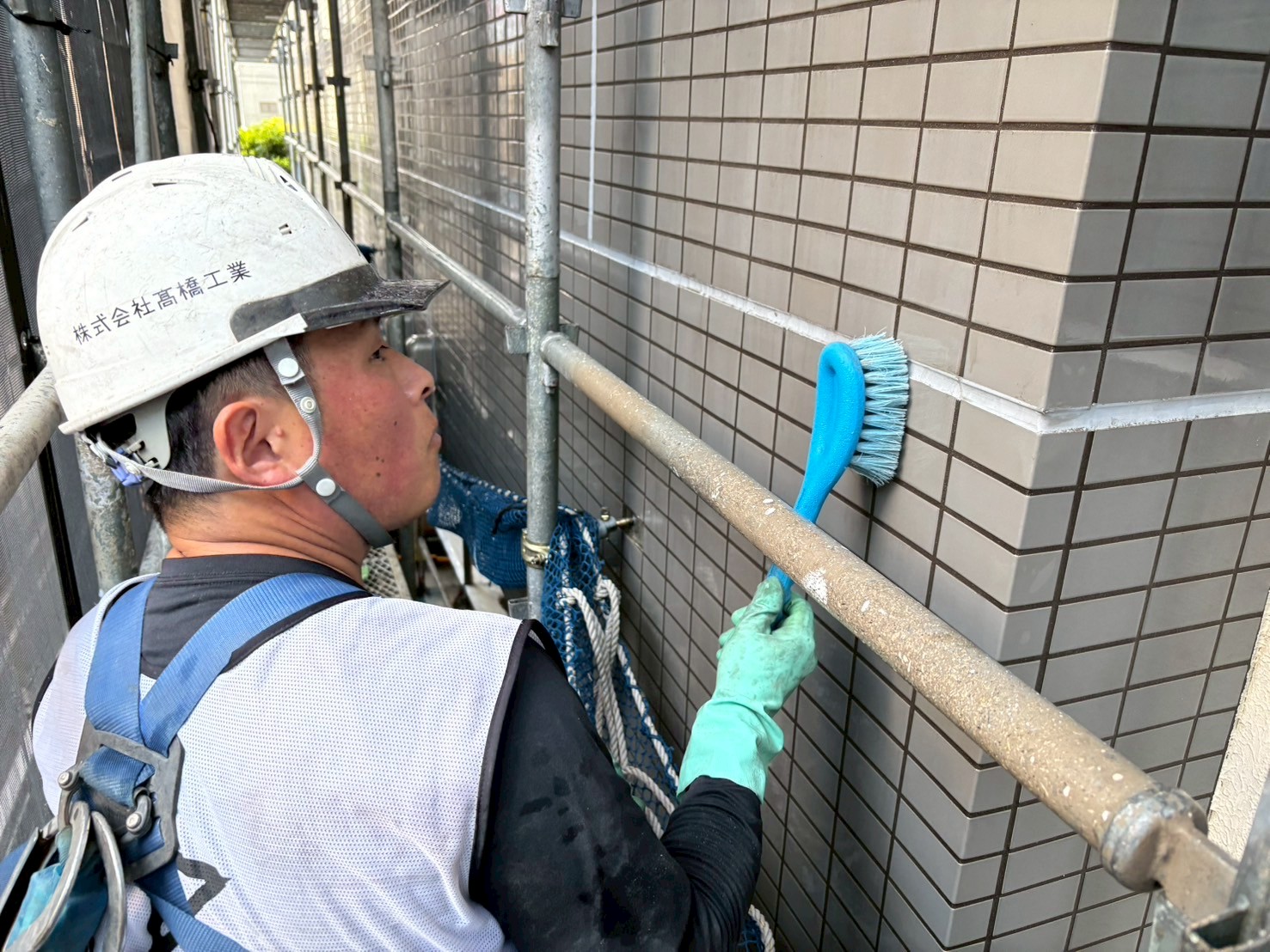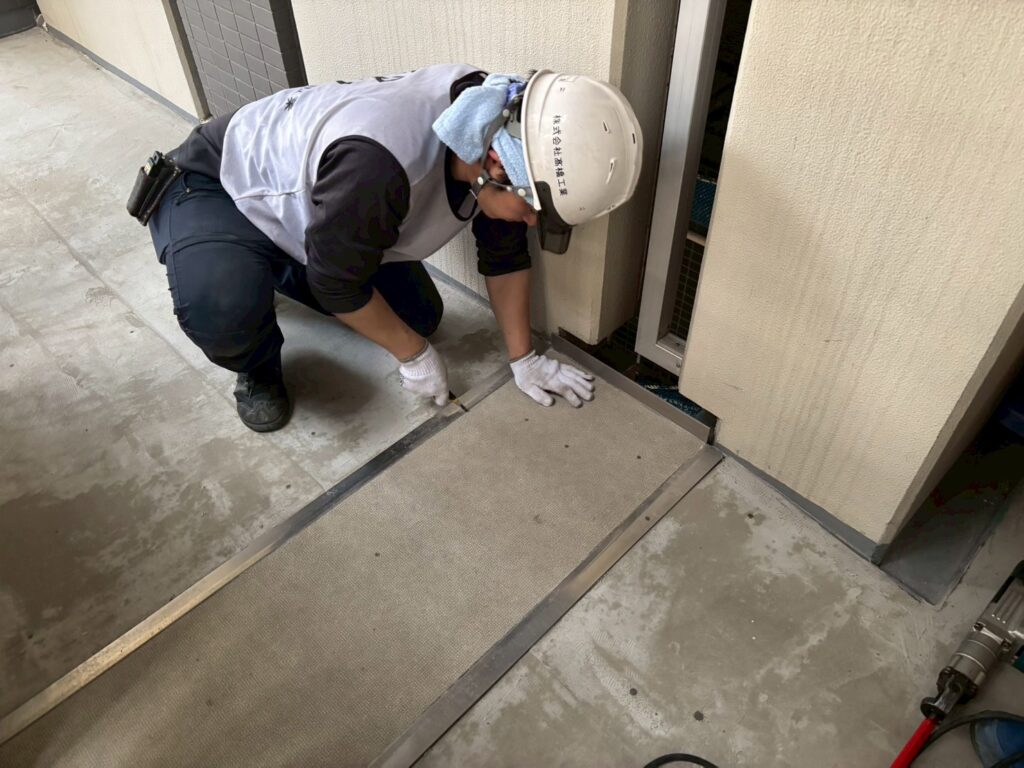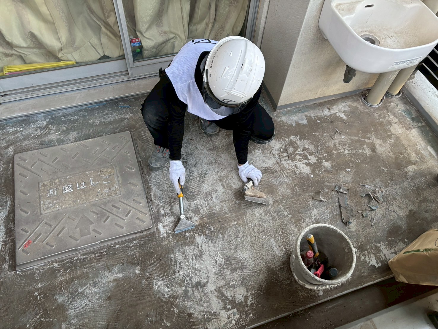 B棟バルコニー、共用廊下の長尺剥がしと下地調整をおこないました。