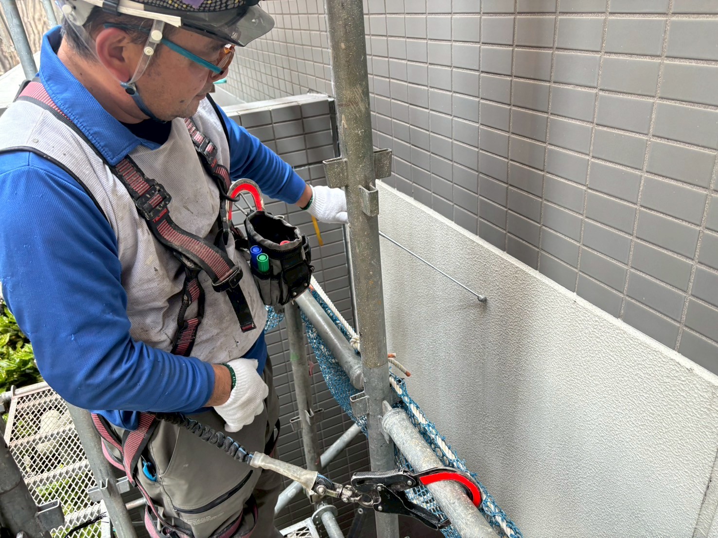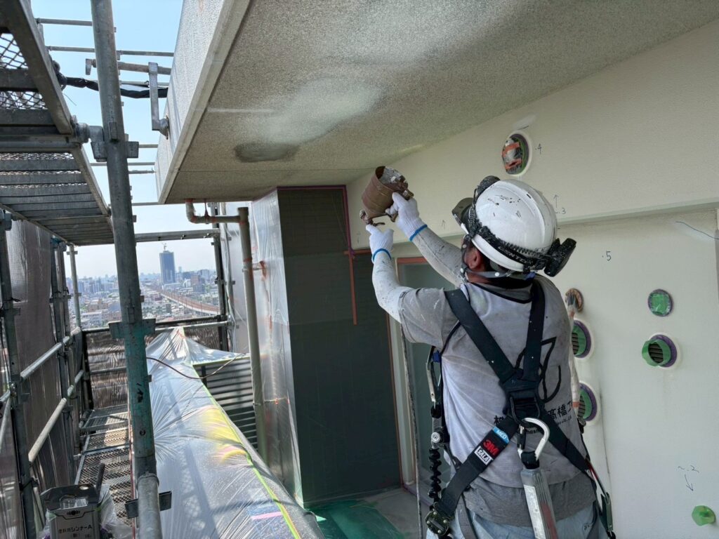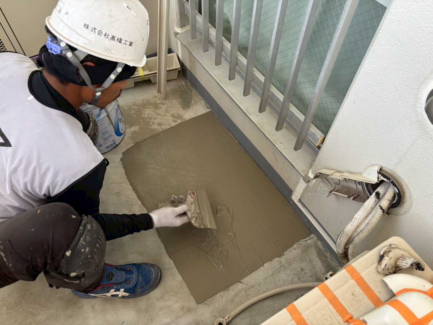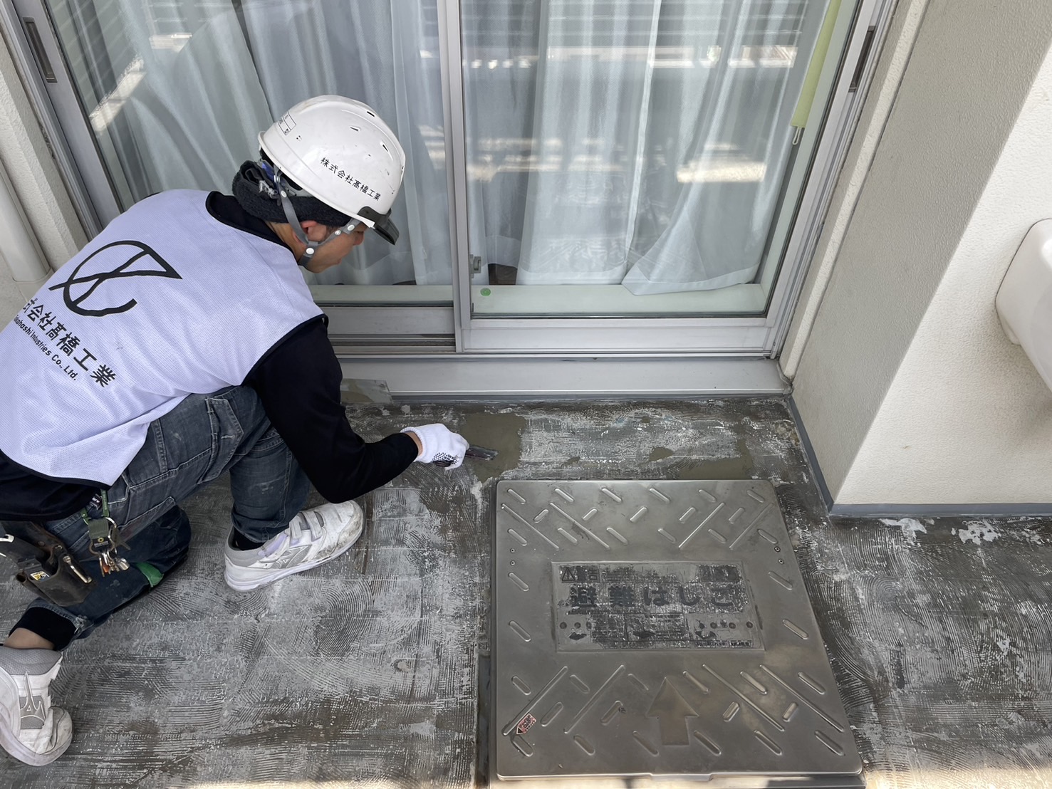 A棟バルコニーの養生作業、塗装工事をおこないました。