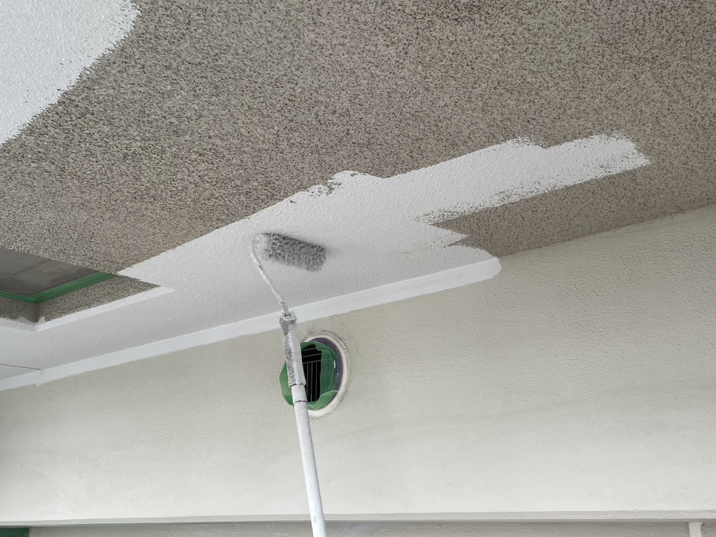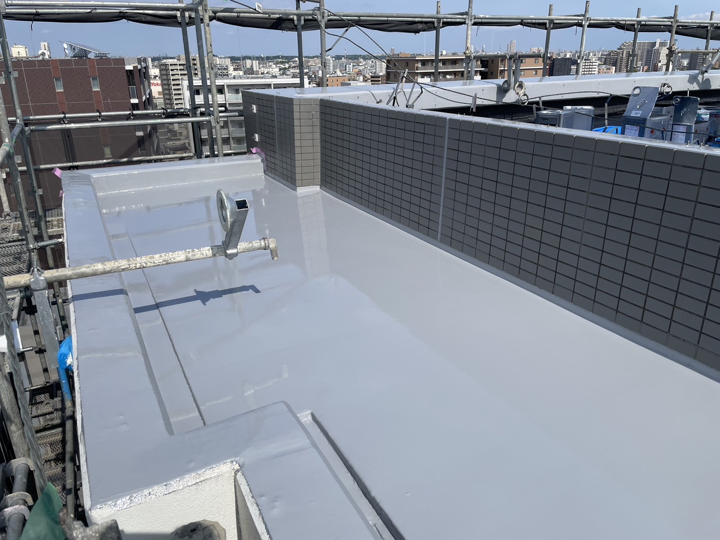 A棟の庇を2回ウレタン防水を塗布した後にトップコートを塗布して仕上げをしてました。