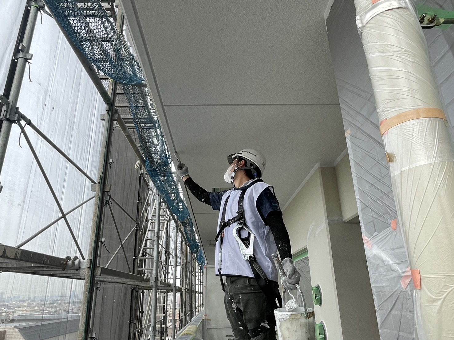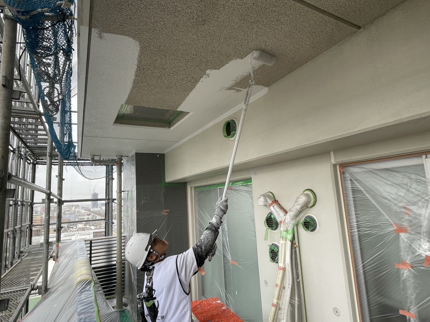 15階~9階は天井の塗装作業、8階~2階は養生作業をしております。