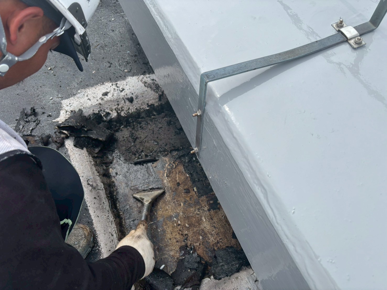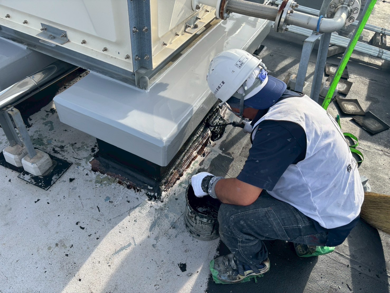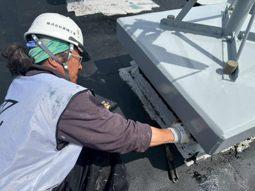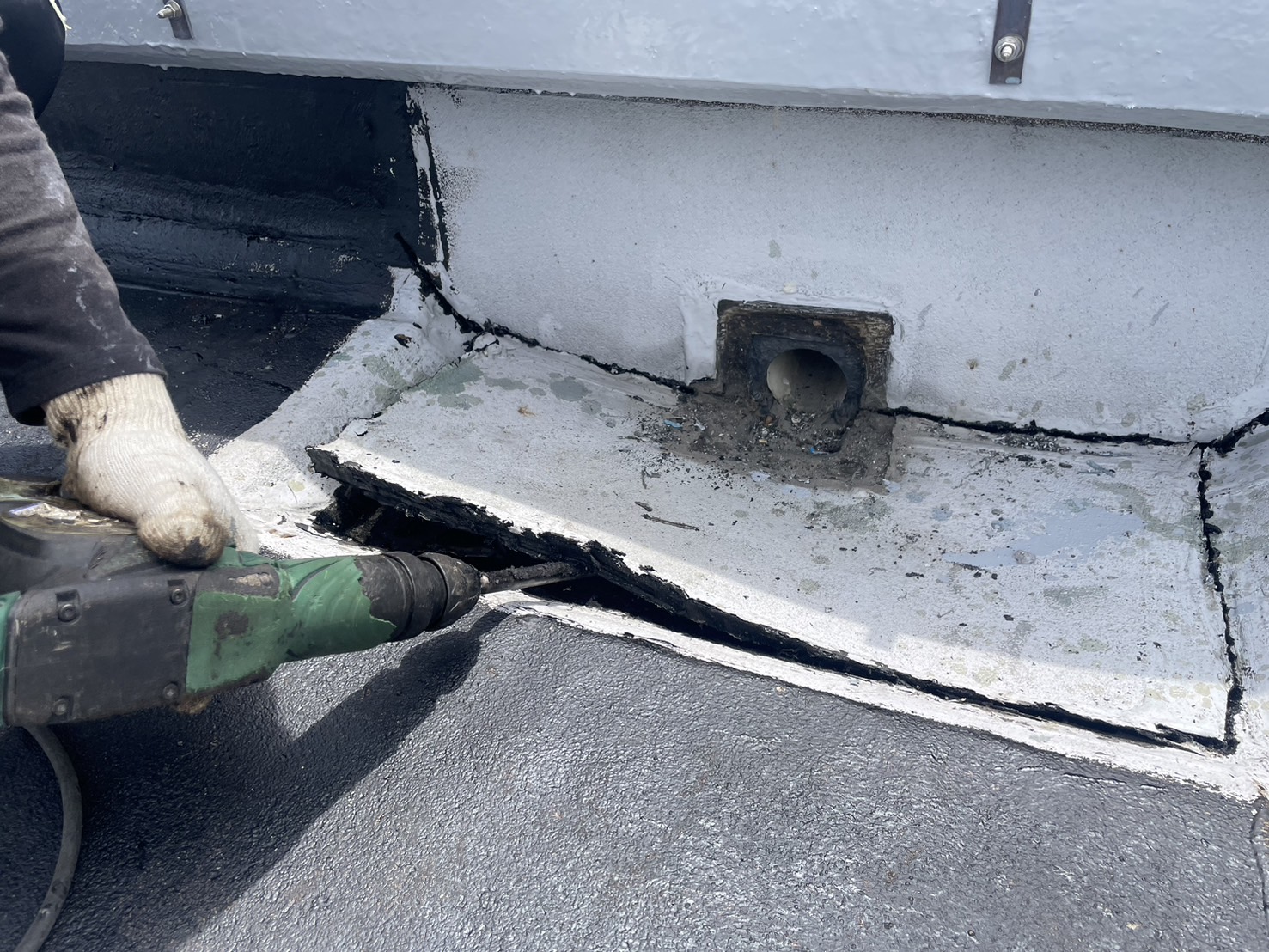 写真はドレン廻りの既存シート防水の撤去、立ち上がりのリベース塗布になります。