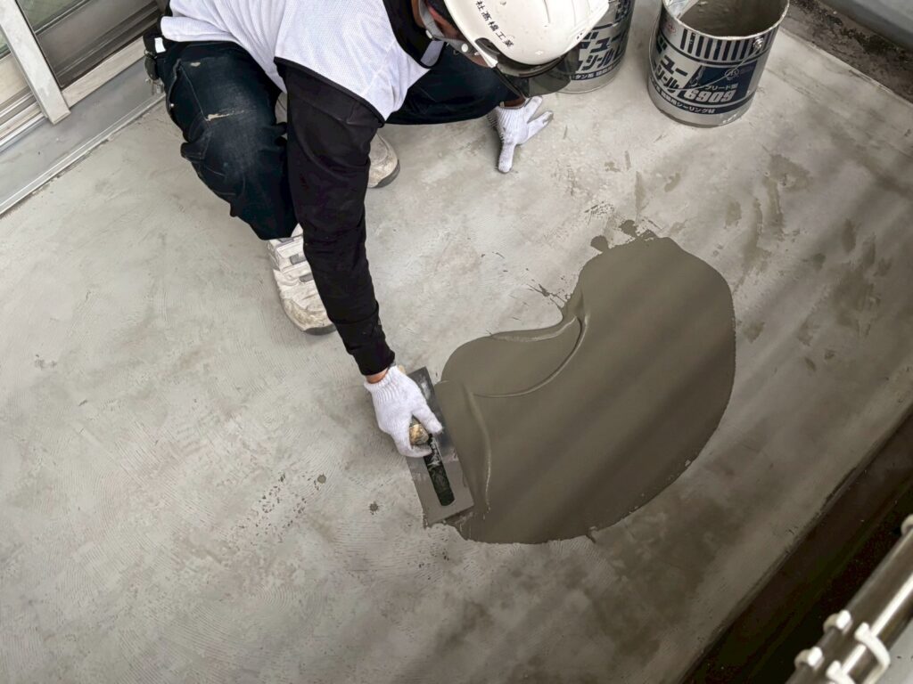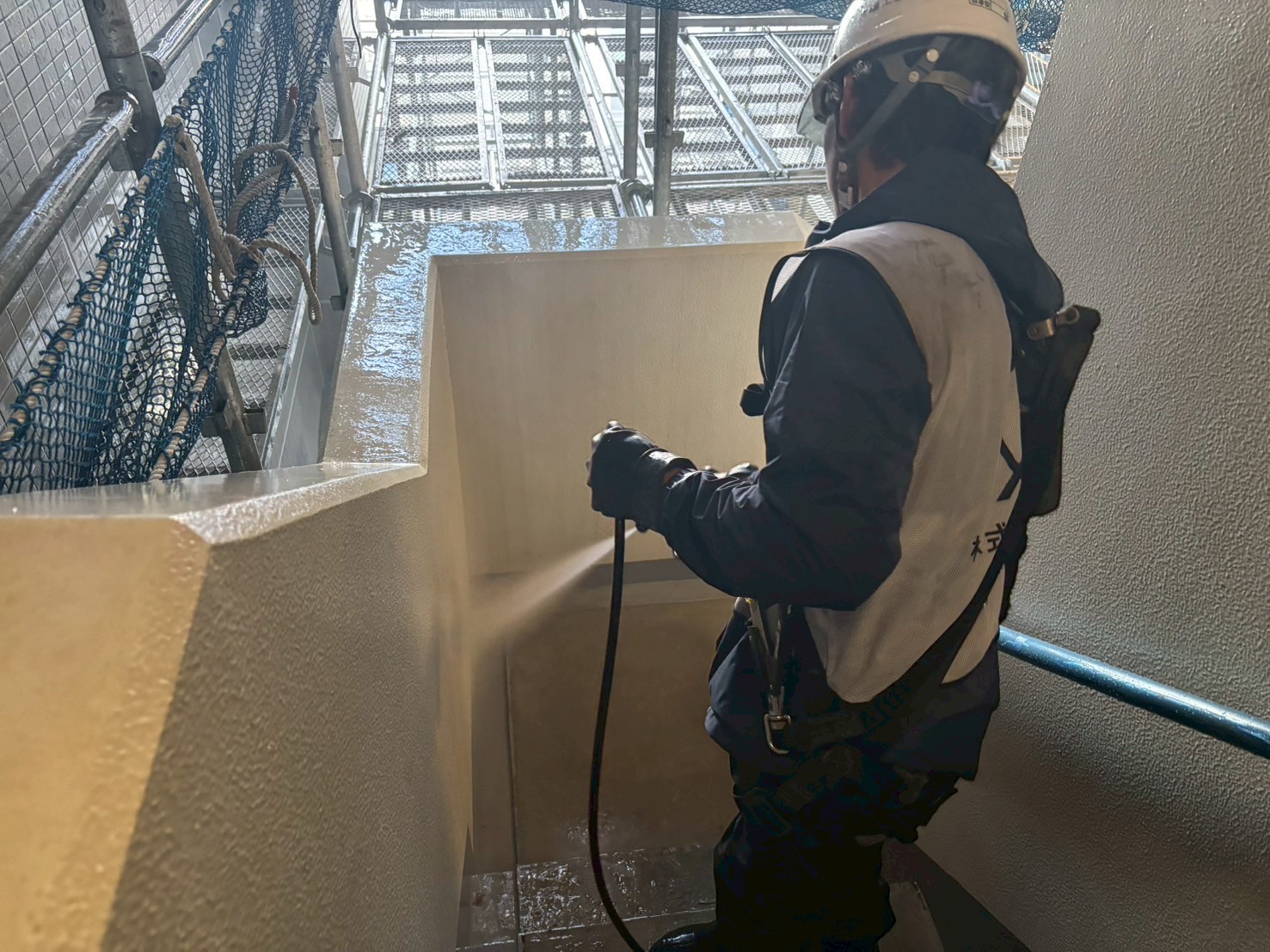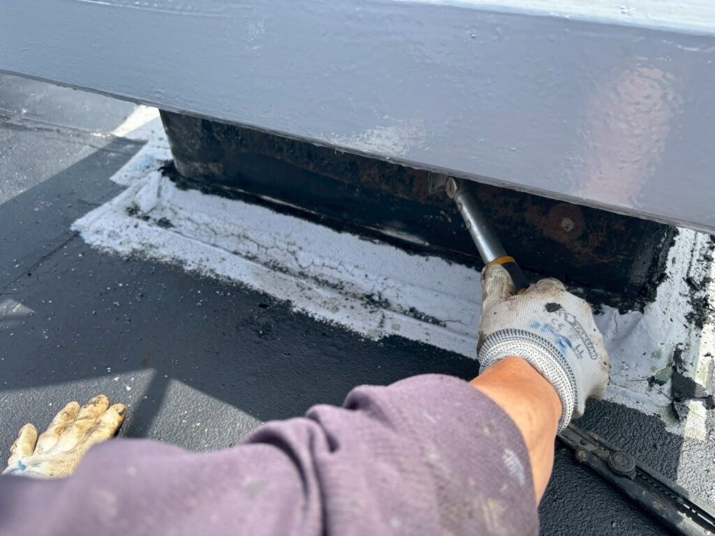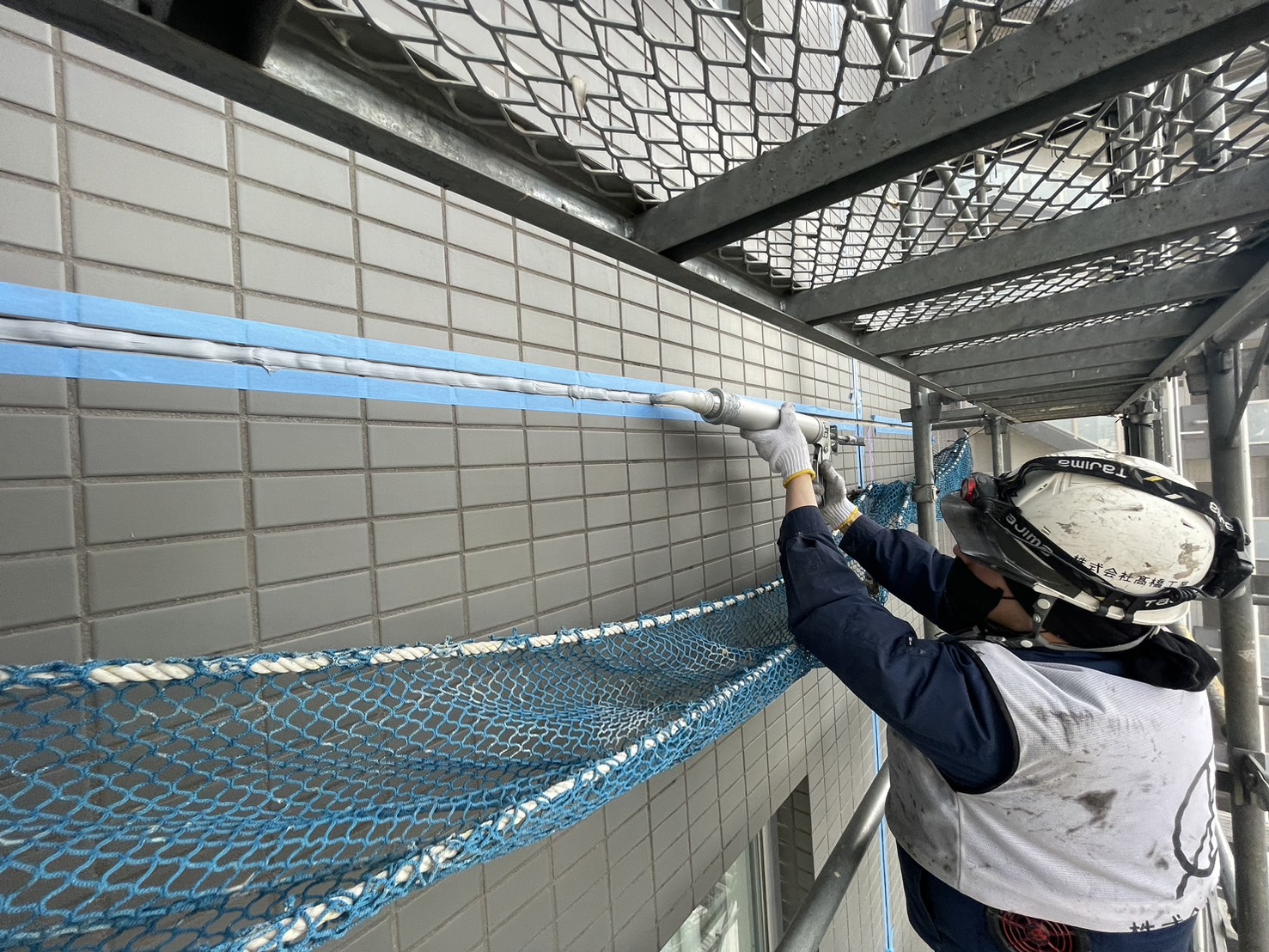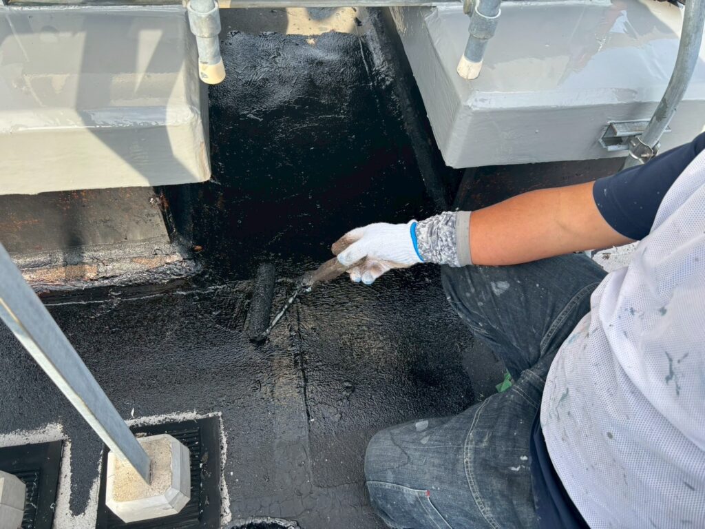 写真はドレン廻りの既存シート防水の撤去、立ち上がりのリベース塗布になります。