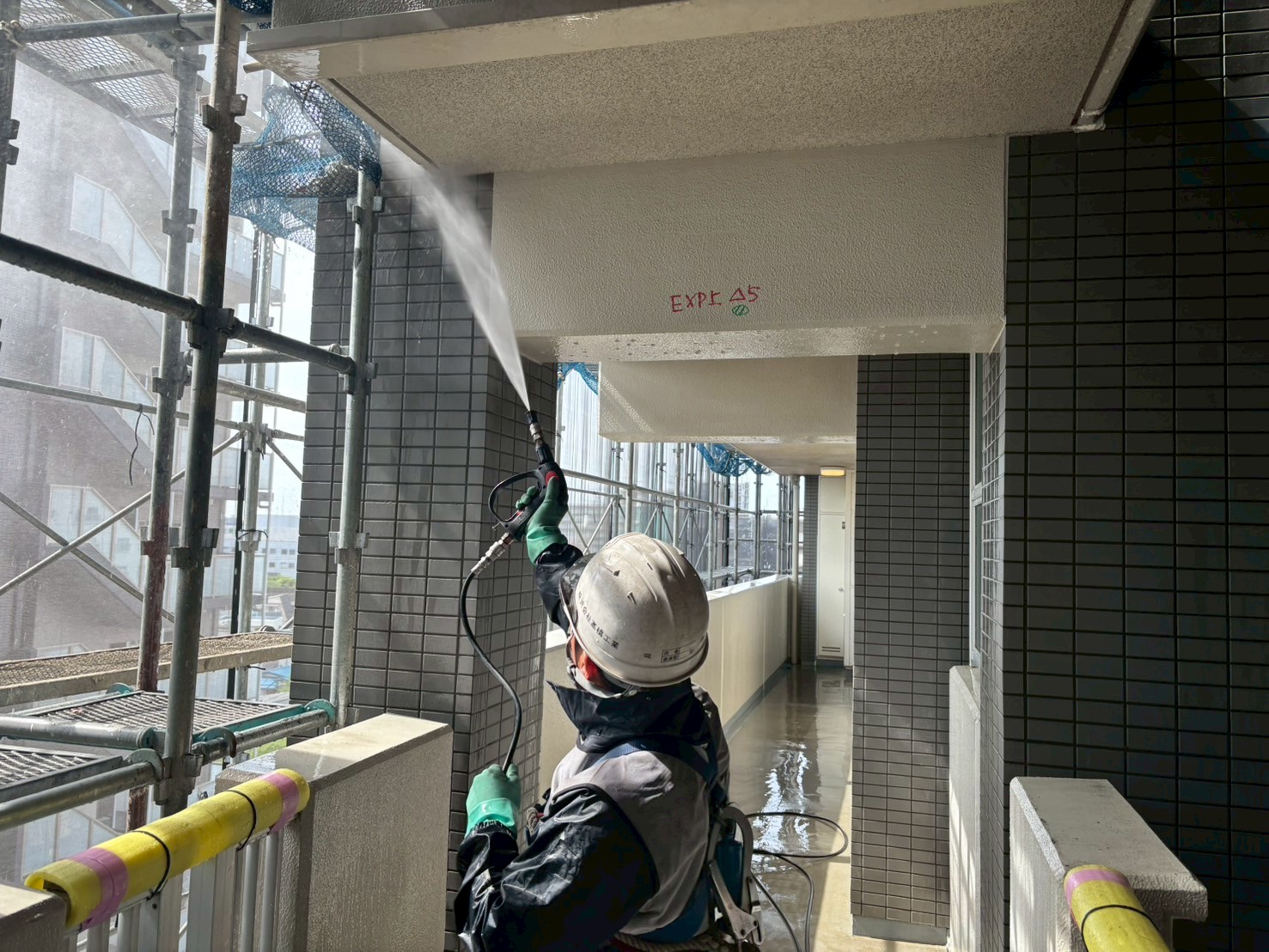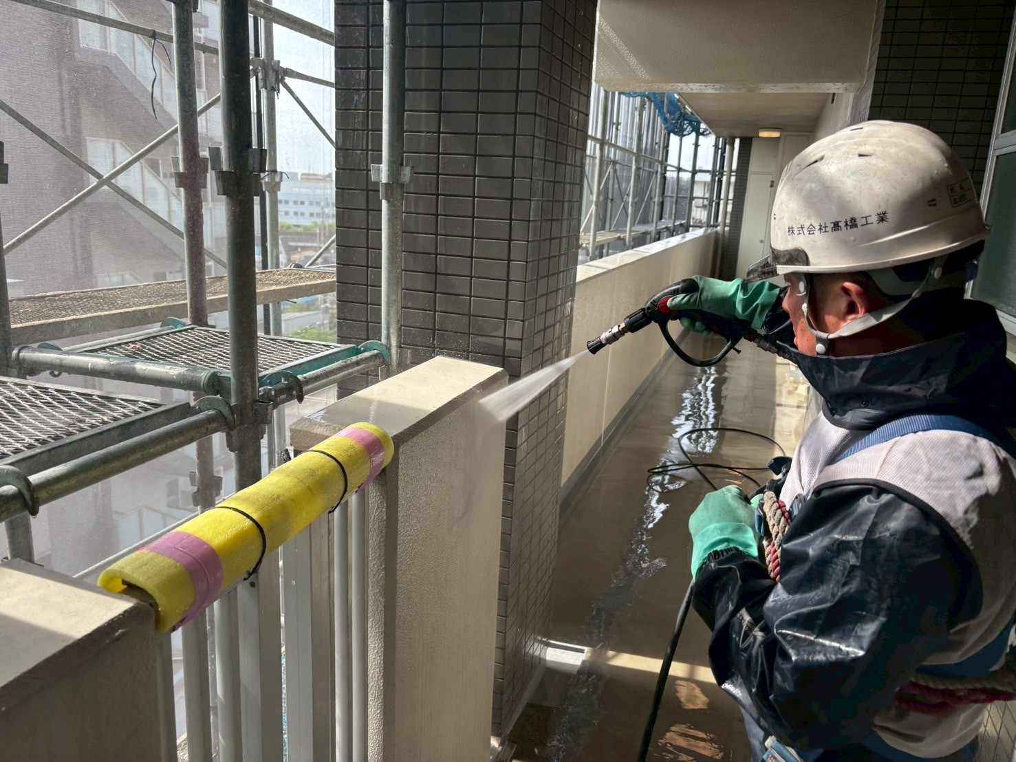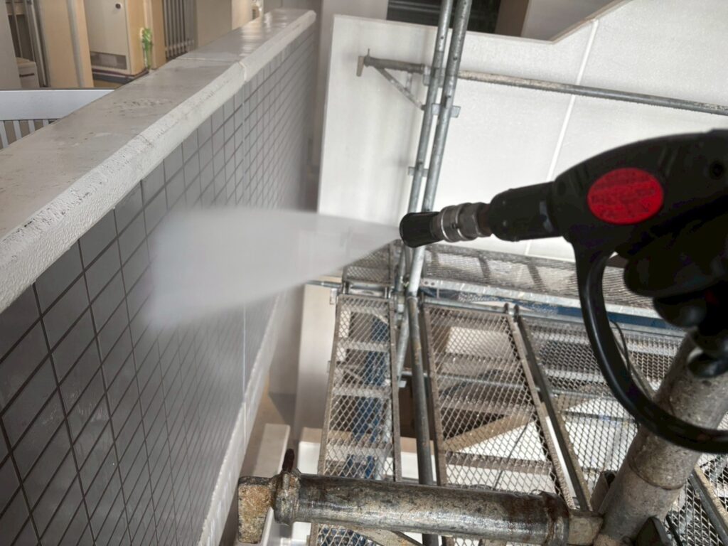 共用廊下、階段の高圧洗浄工事、タイル洗浄工事をおこないました。