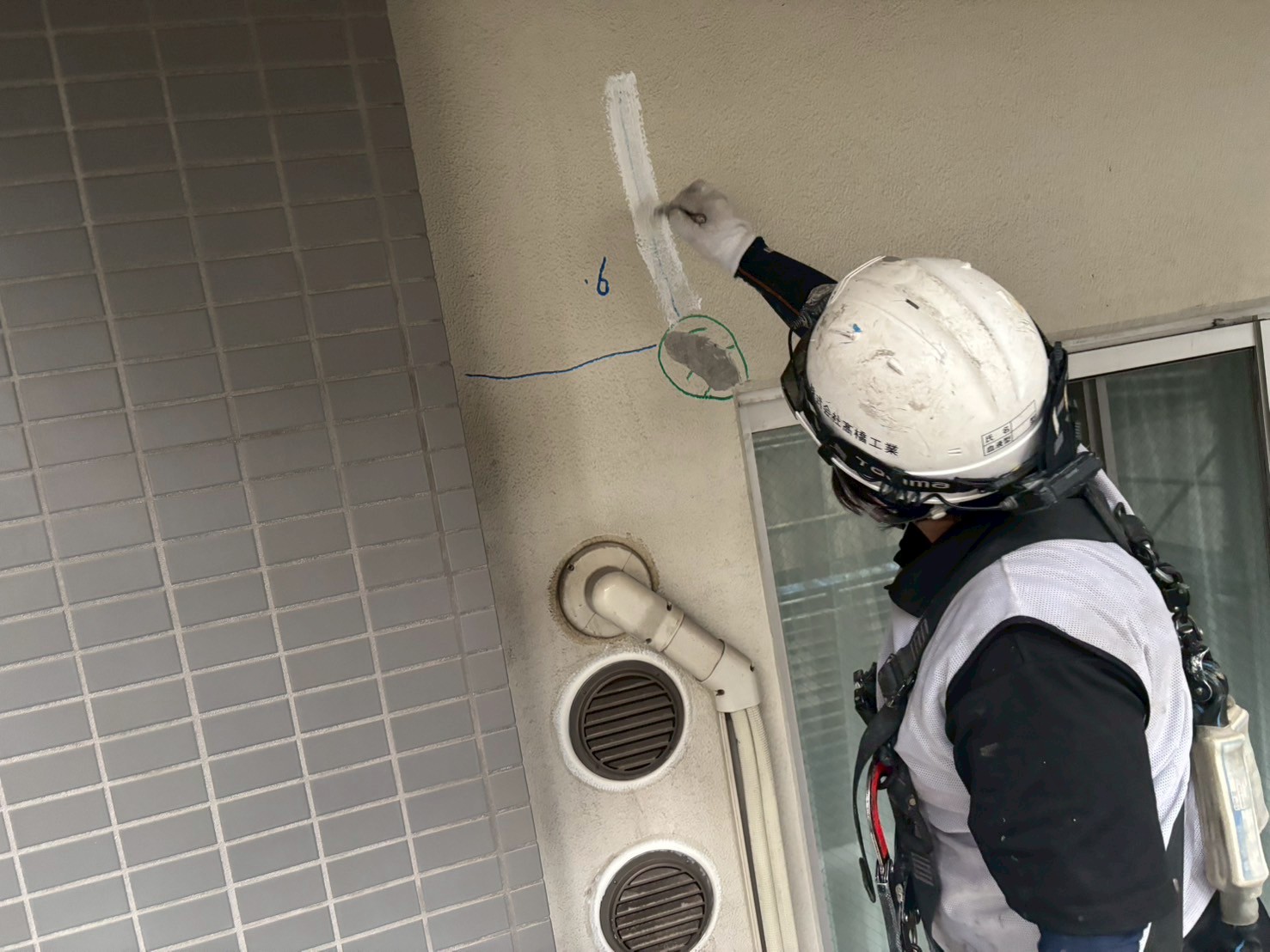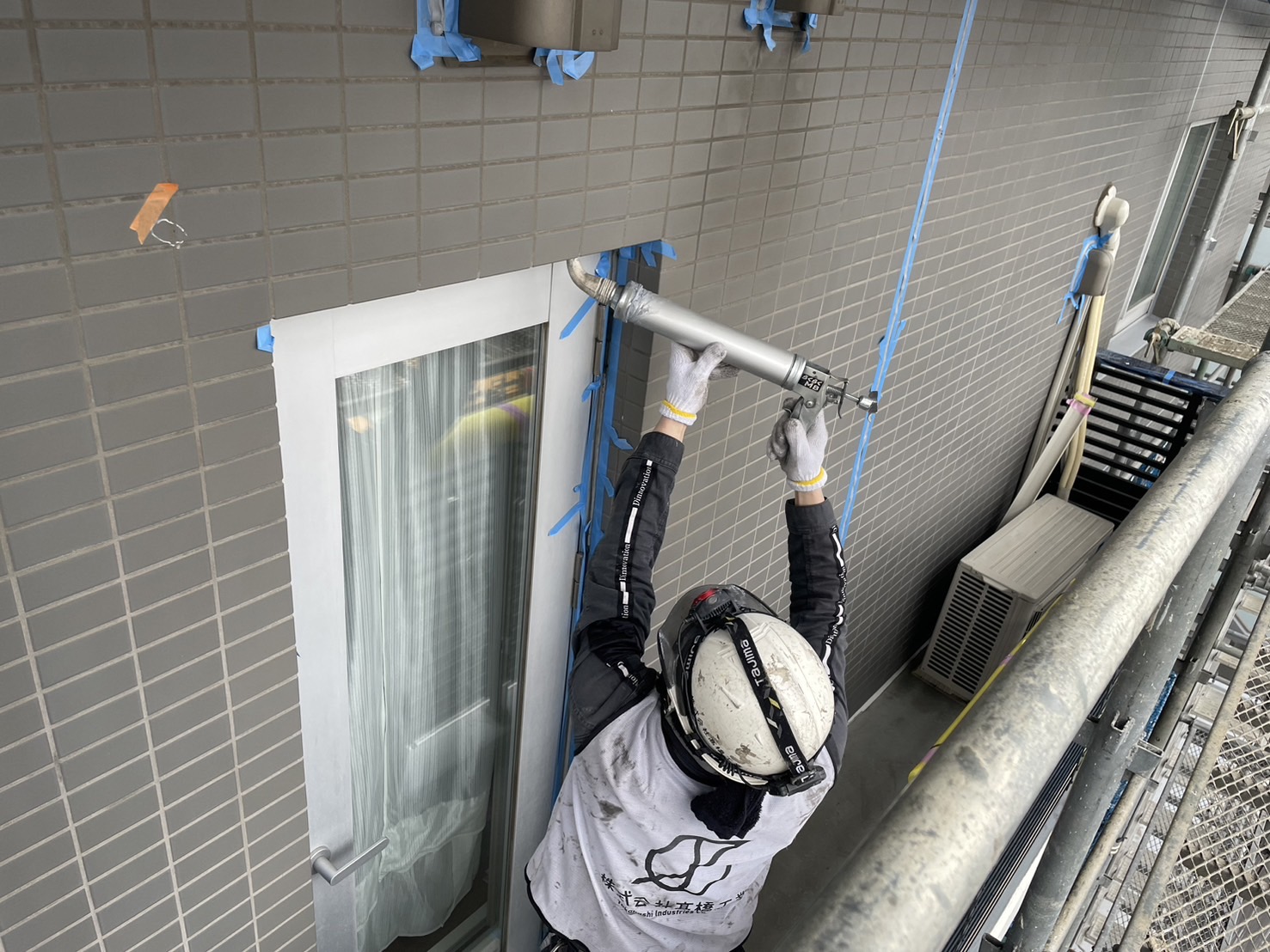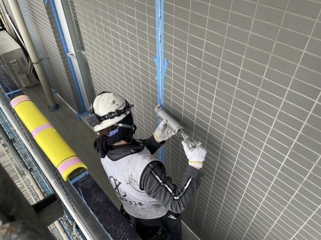 明日から外壁はタイルの斫り作業があり、シーリング工事はタイル作業の兼ね合いで進めていきます。