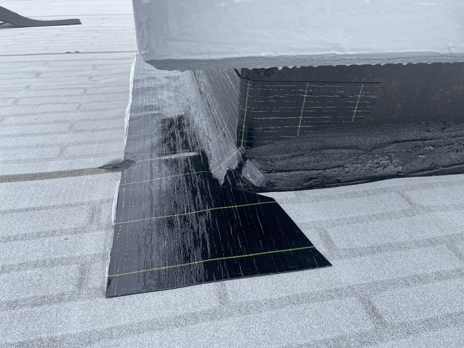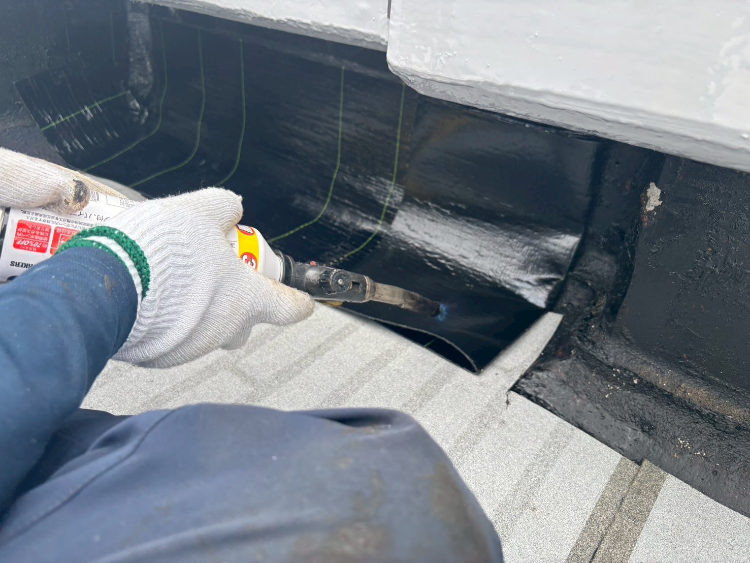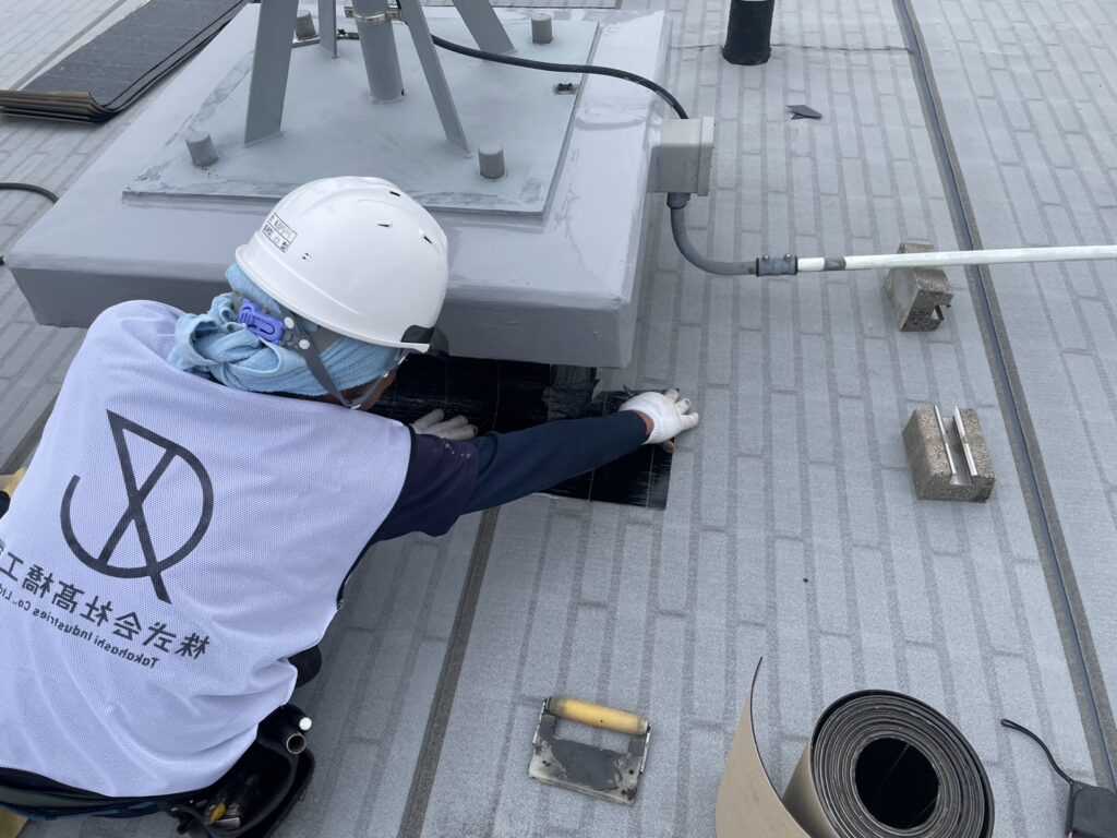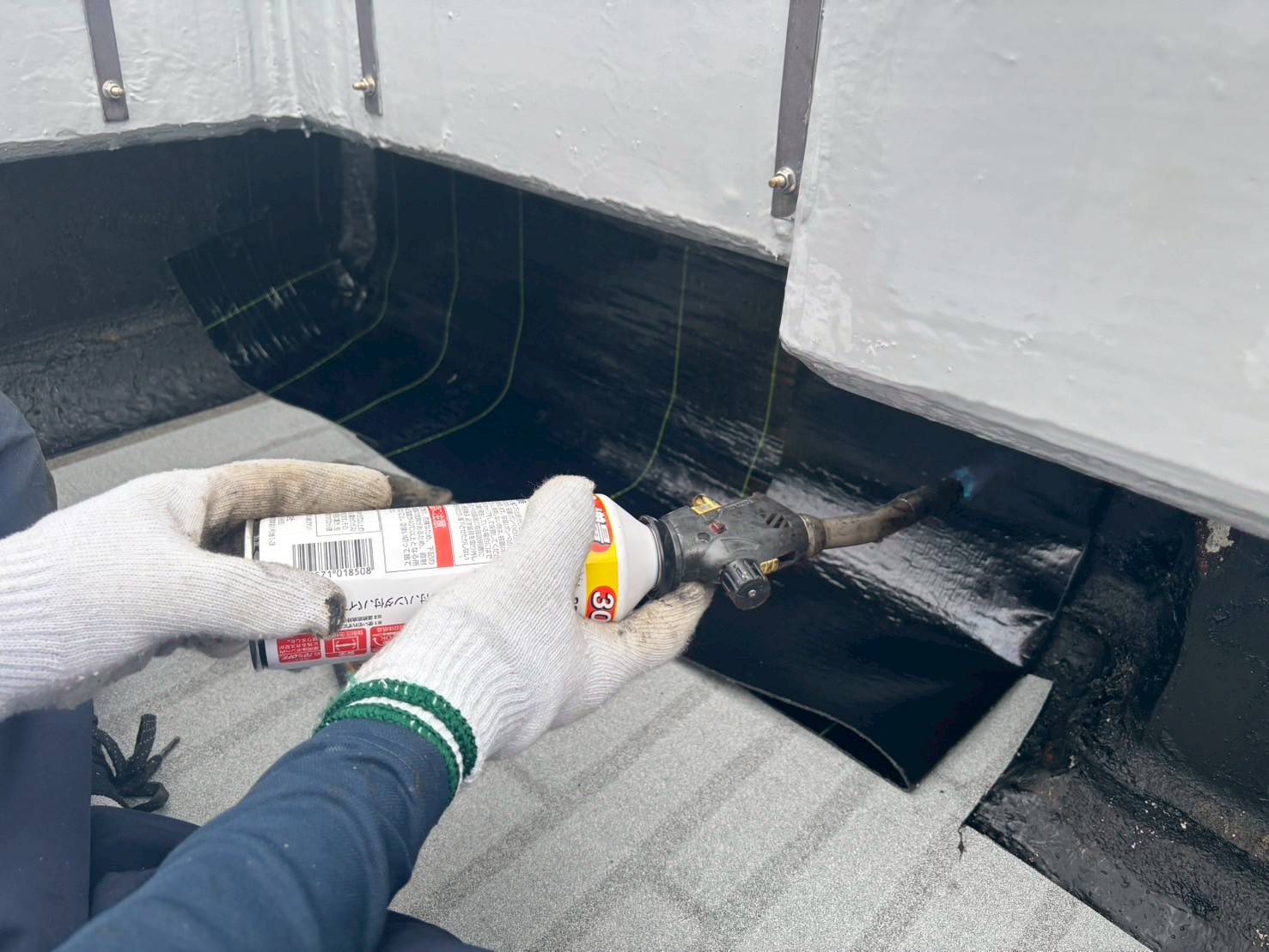 アスファルトをトーチで溶かし接着をおこない1層目の通気シートを設置しました。