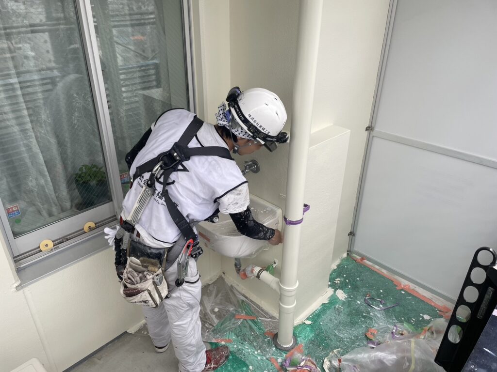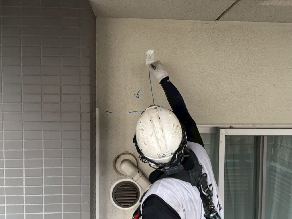 B棟外壁、バルコニー内の壁の欠損、塗膜剥離、ヒビの補修工事をおこないました。