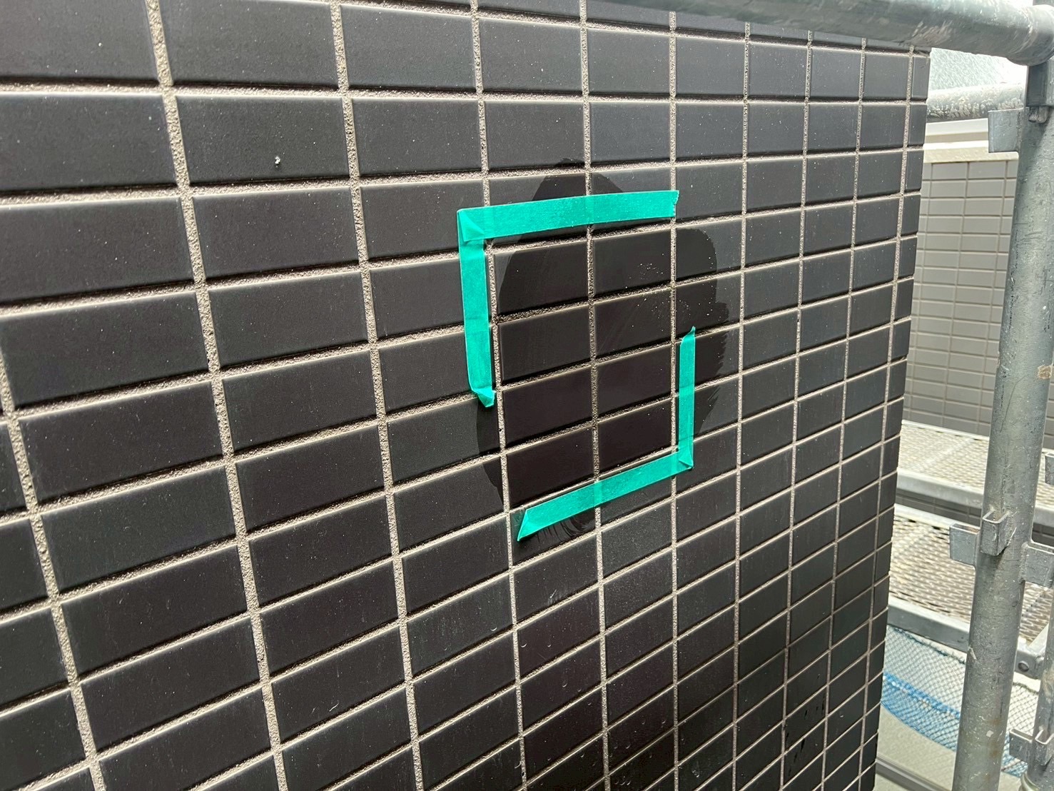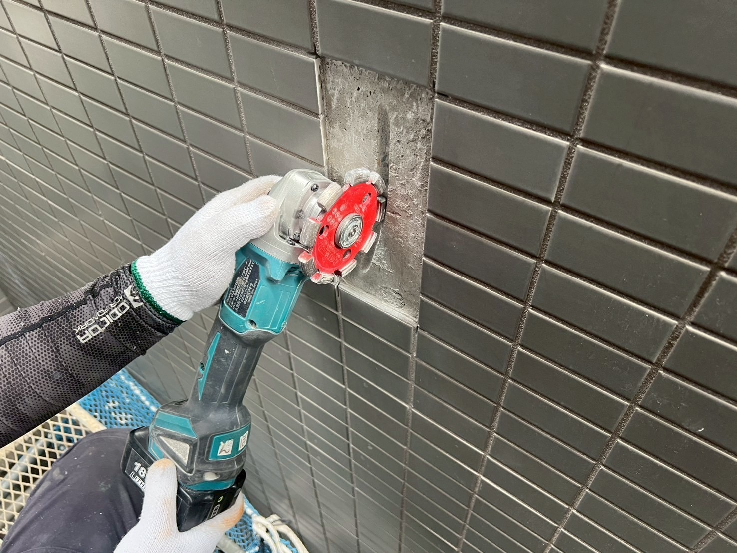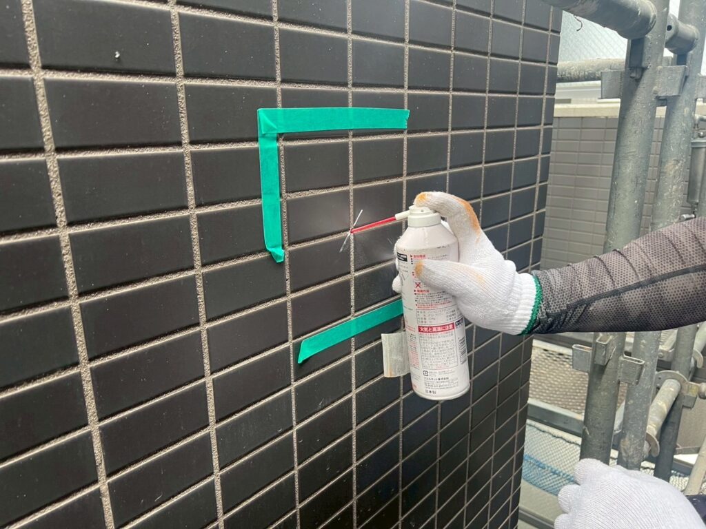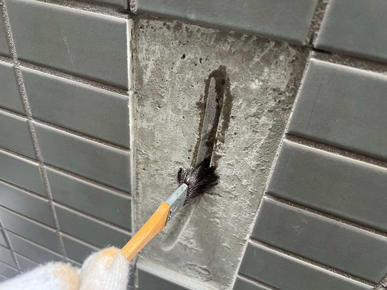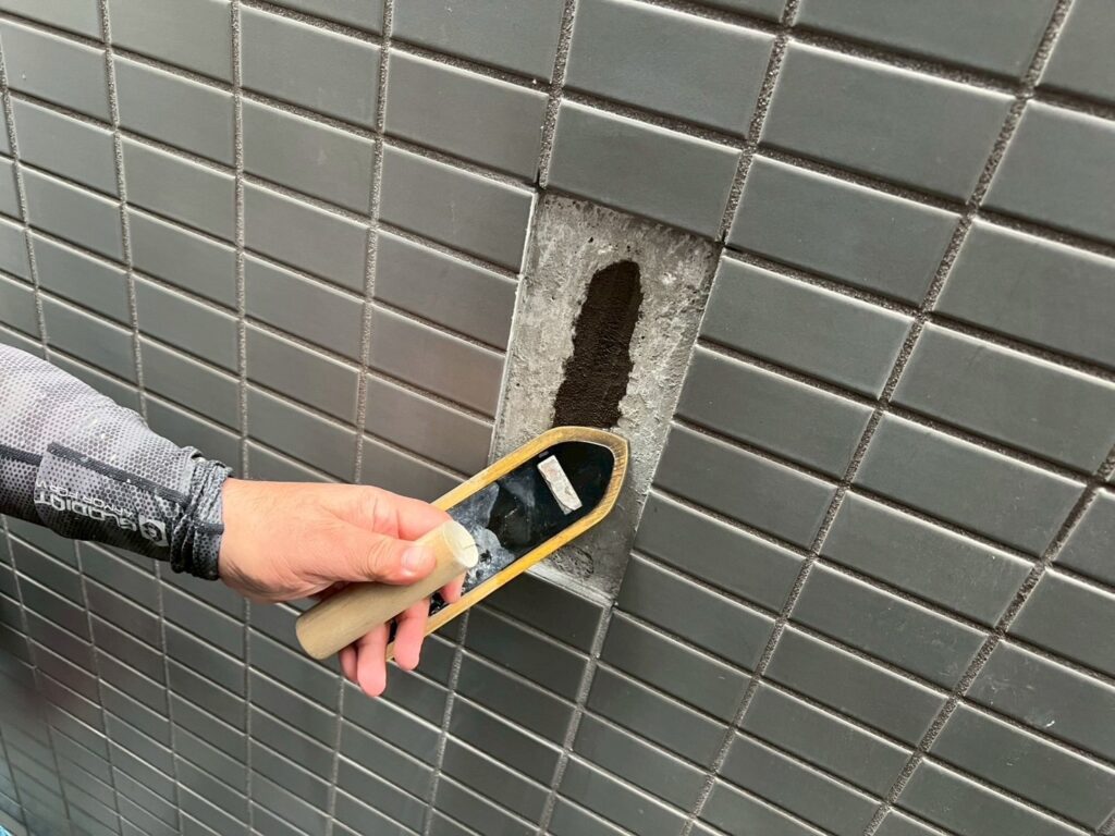 タイルの浮き箇所にエポキシ樹脂注入と、タイル下地のヒビ補修をおこないました。