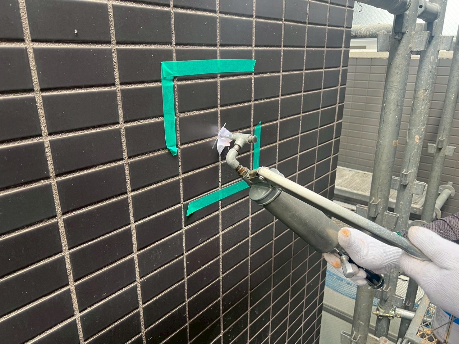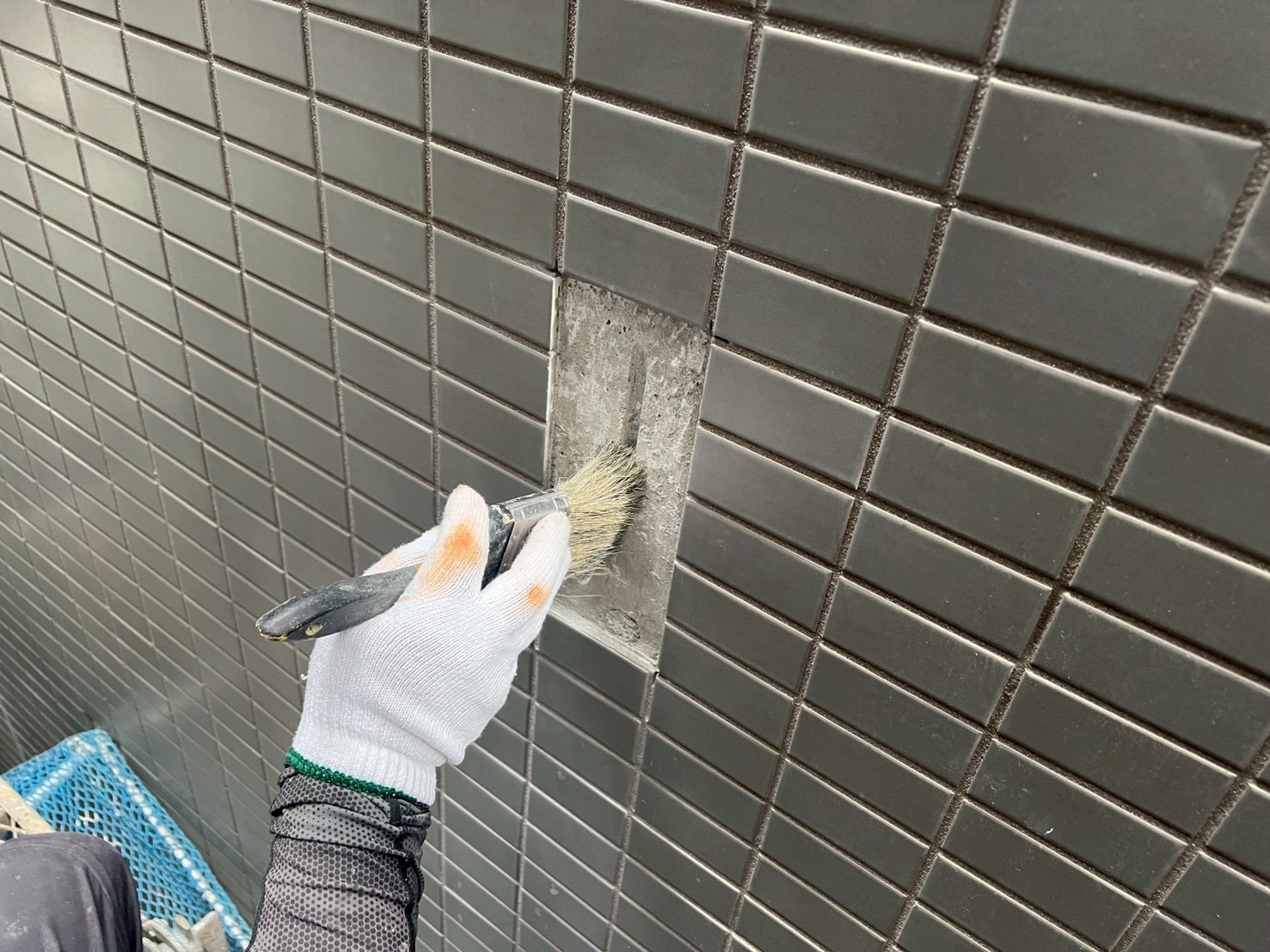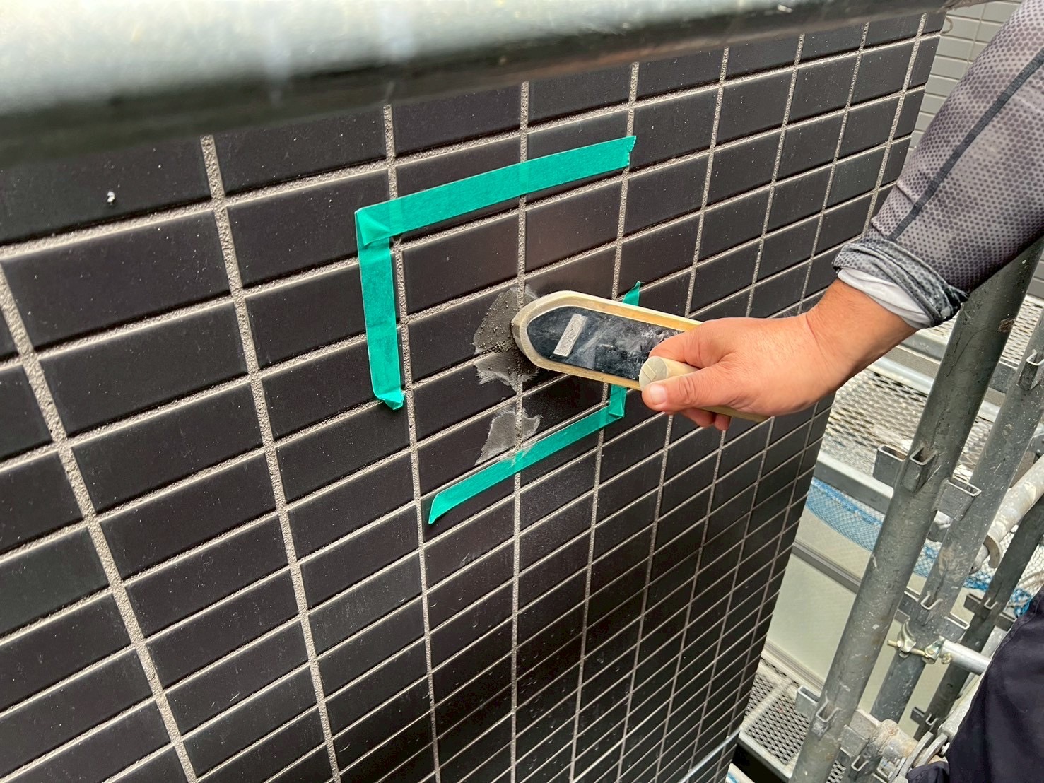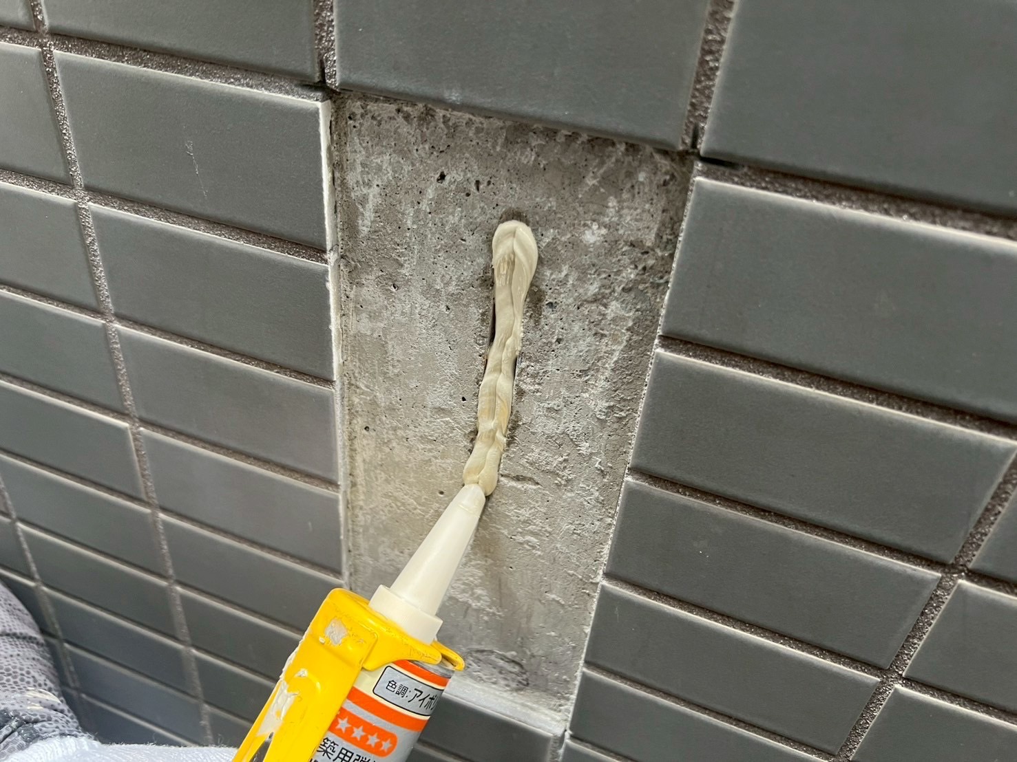 タイルの浮き箇所にエポキシ樹脂注入と、タイル下地のヒビ補修をおこないました。
