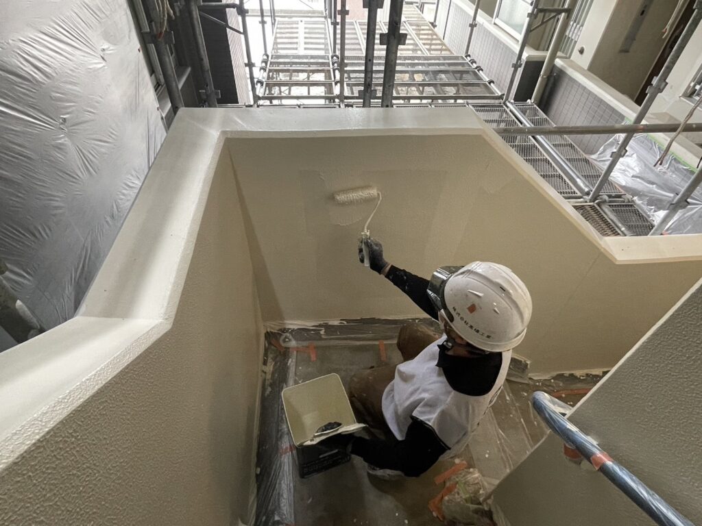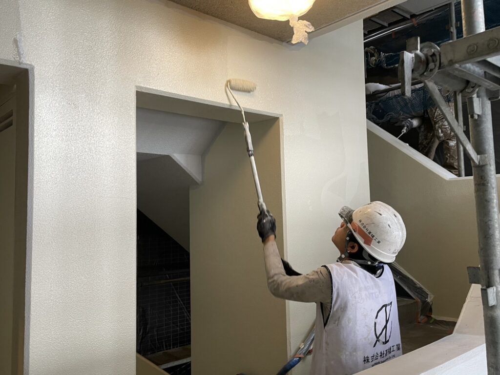 共用階段の壁の上塗り作業、壁は水性塗料で下塗り→中塗り→上塗りの3回塗りで塗装をおこなっております。