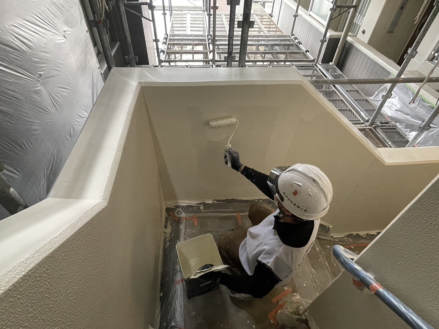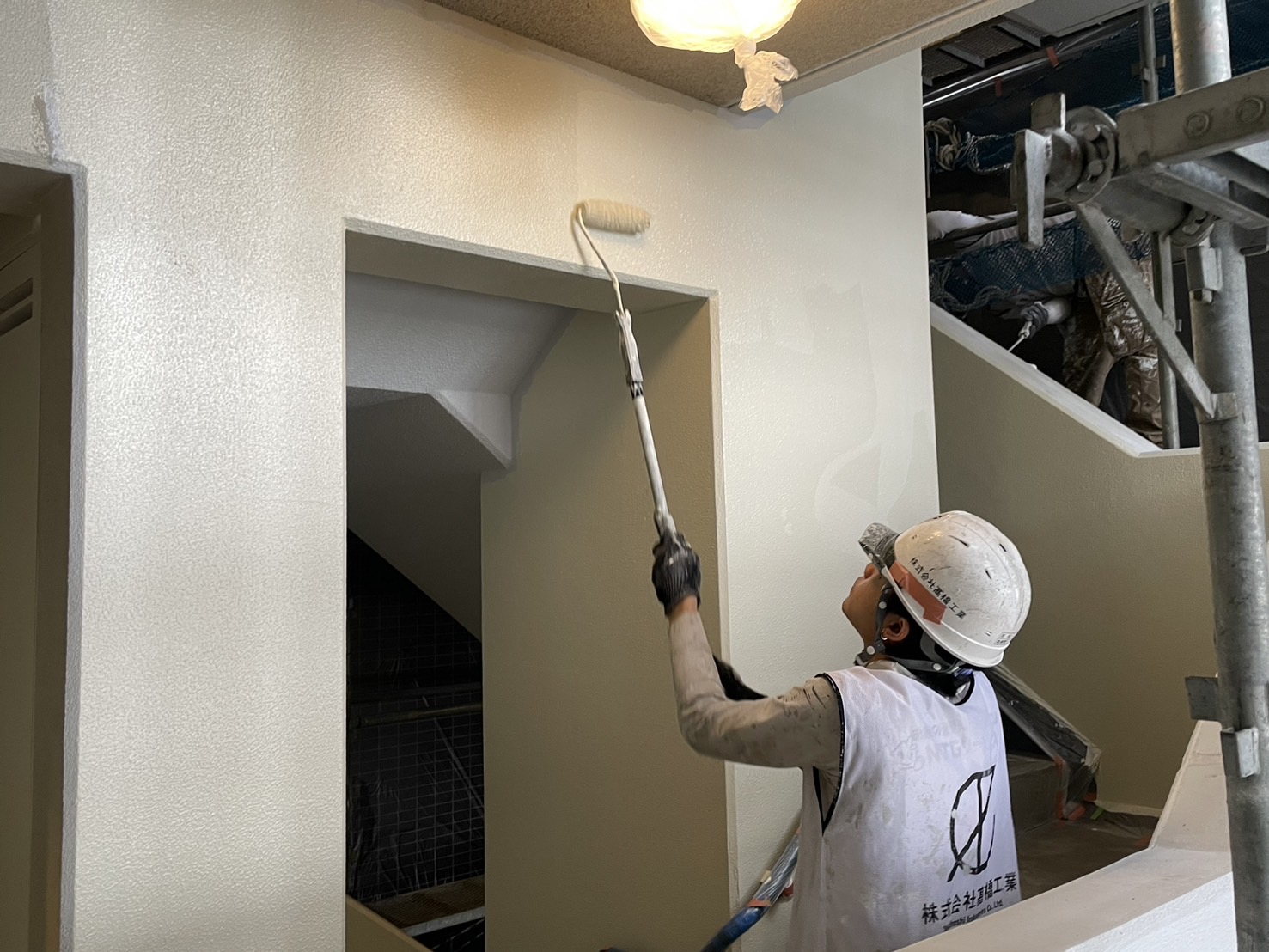 階段塗装は仕上がり、廊下内、足場からの階段壁の塗装を始めていきます。