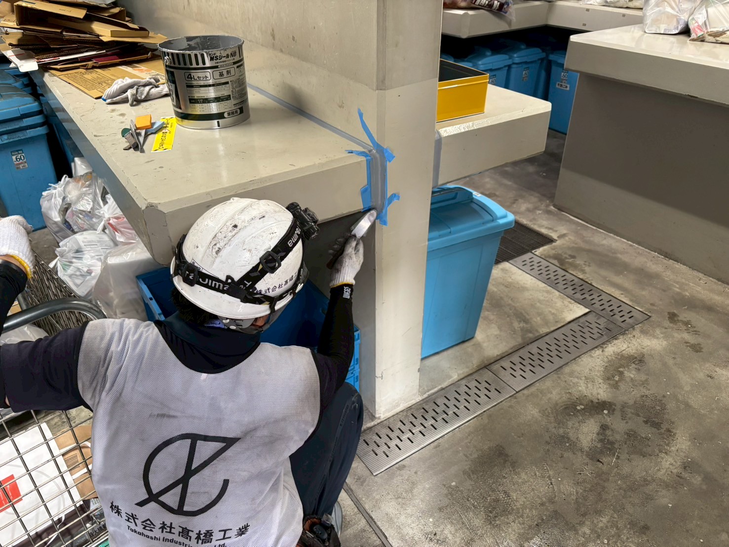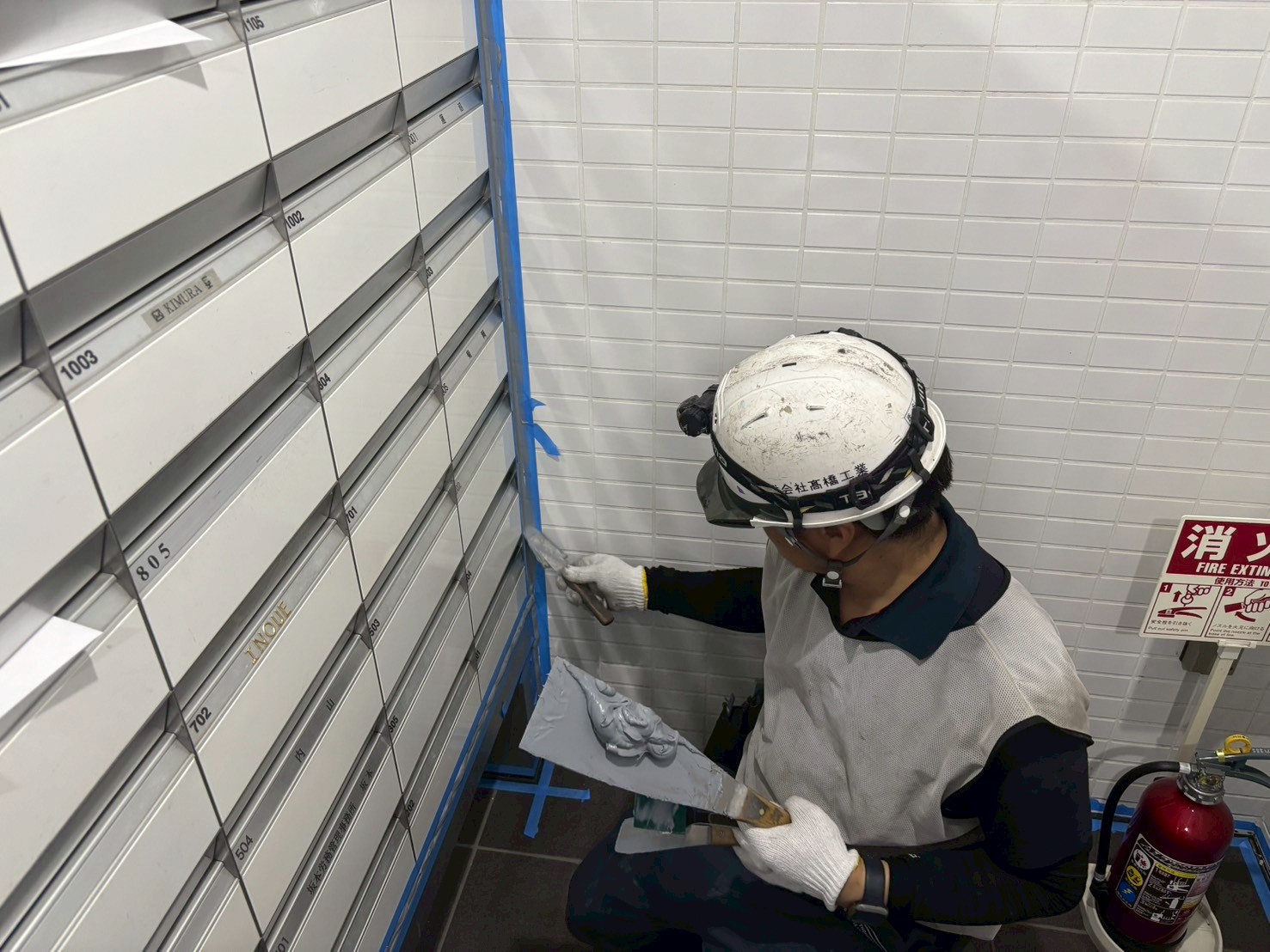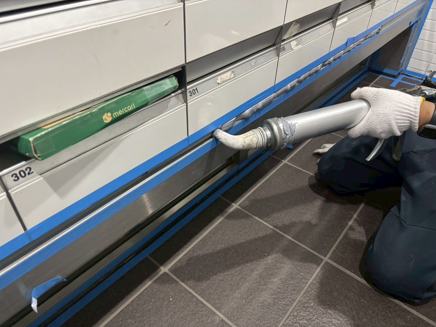 1階鉄部ドア、ポストボックス、ゴミ置き場のシーリング打ち込みをおこないました。