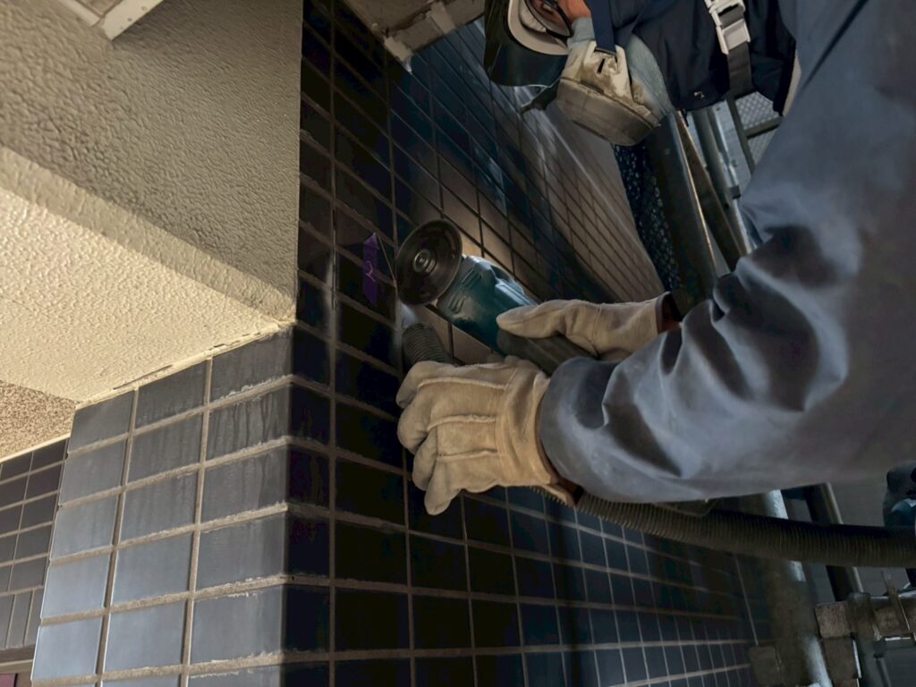 A棟北側・廊下内のタイル斫り工事とA棟東面・西面の1階のタイル貼りをおこないました。