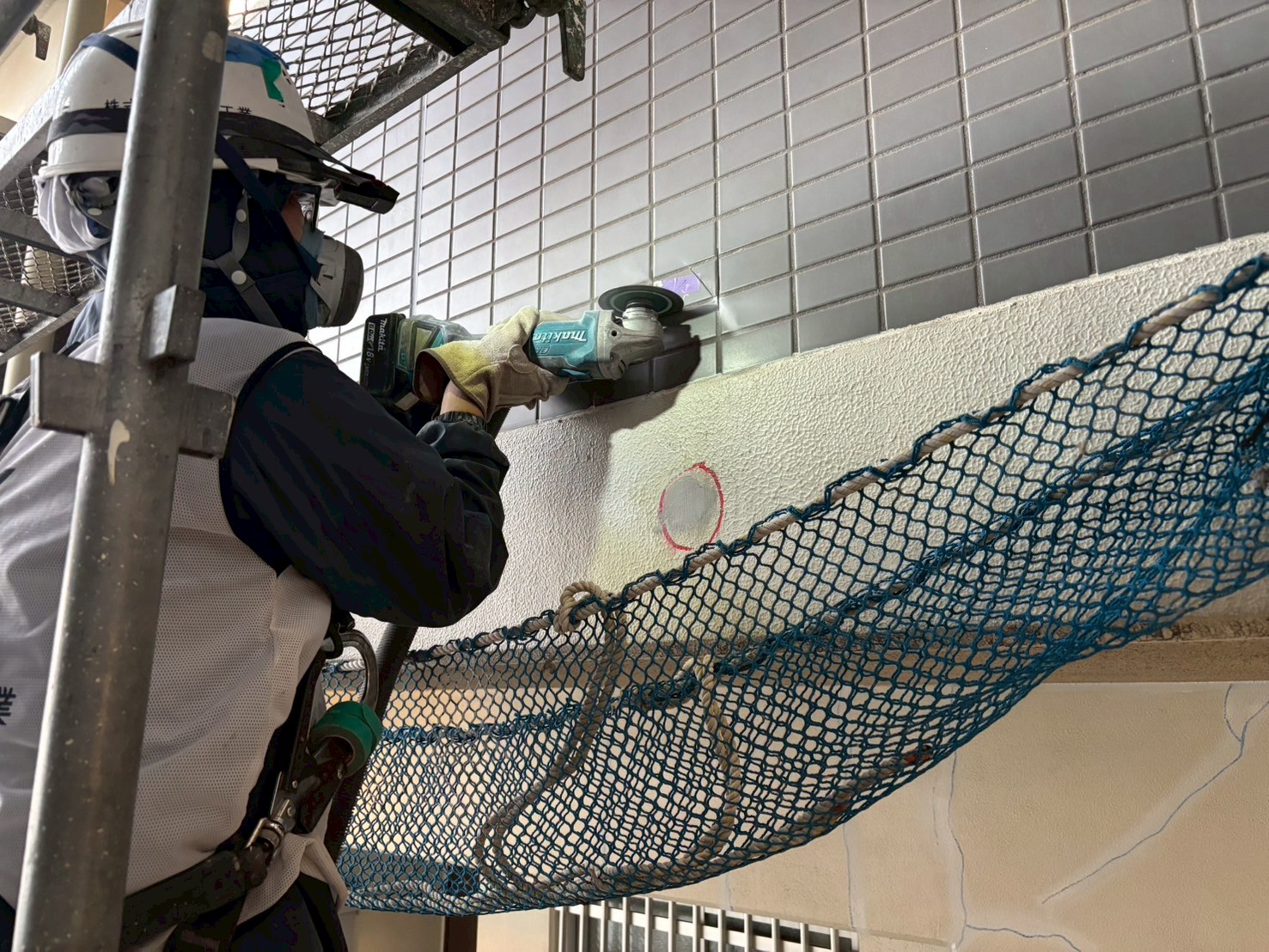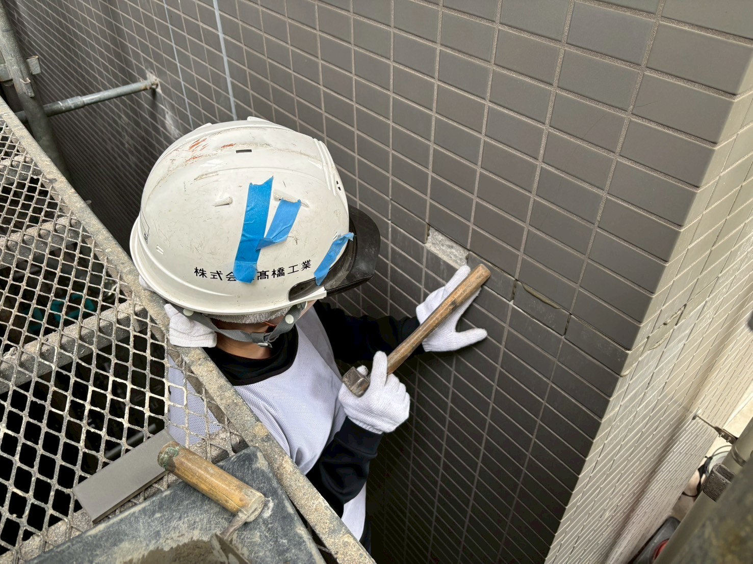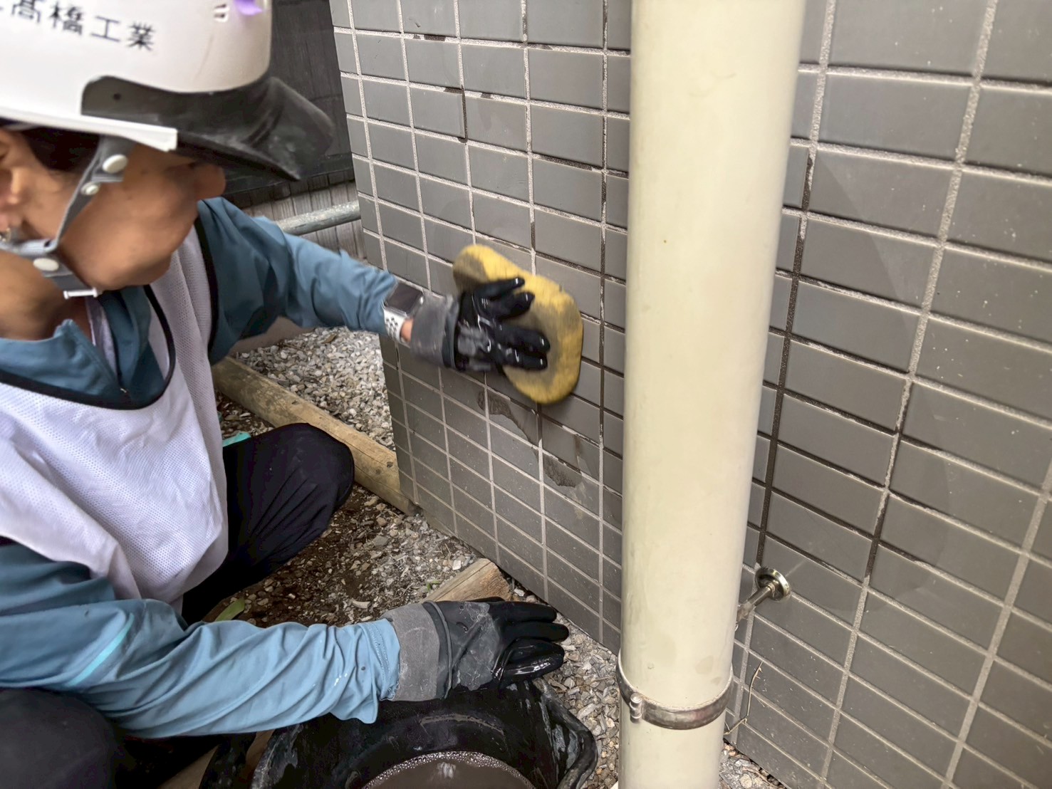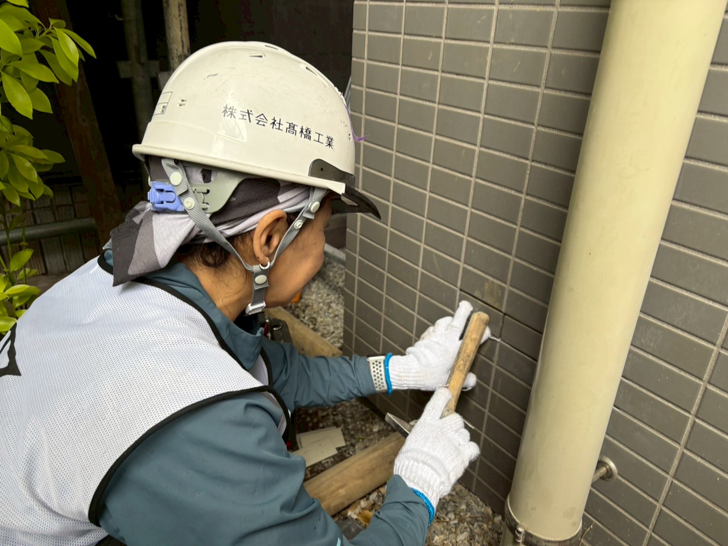 A棟北側・廊下内のタイル斫り工事とA棟東面・西面の1階のタイル貼りをおこないました。