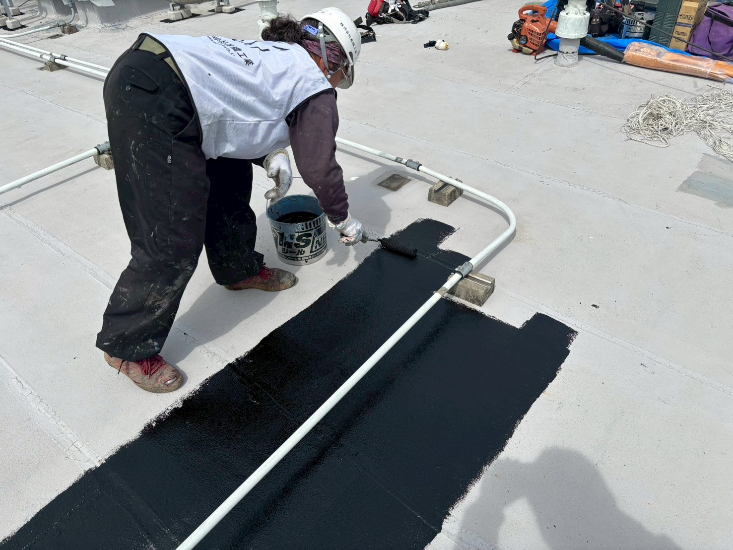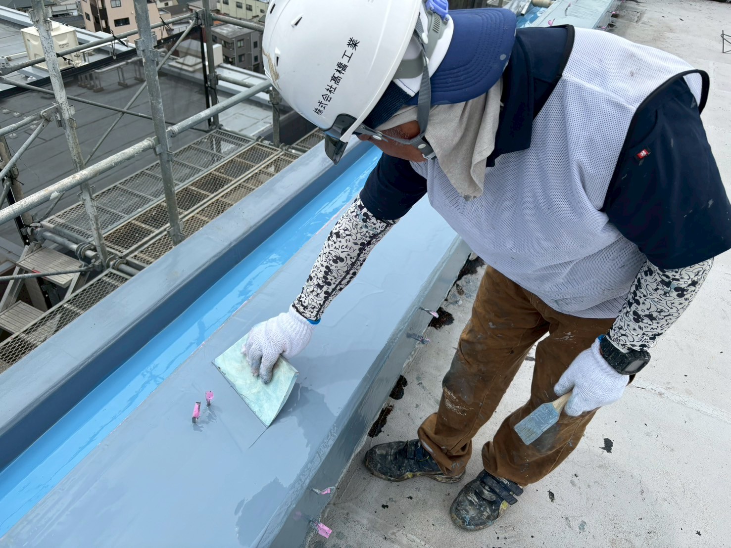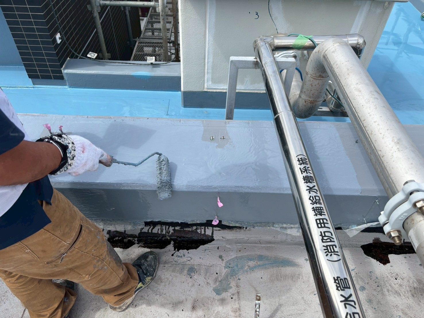 A棟屋上のパラペットのウレタン2層目、B棟屋上の下地調整をおこないました。