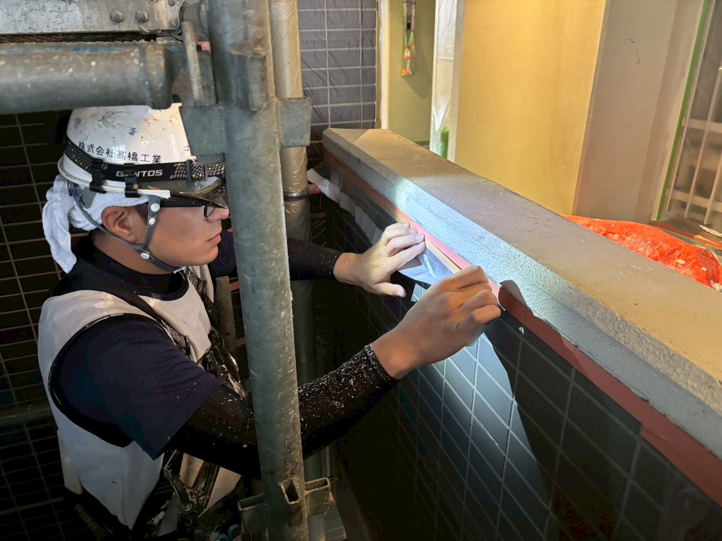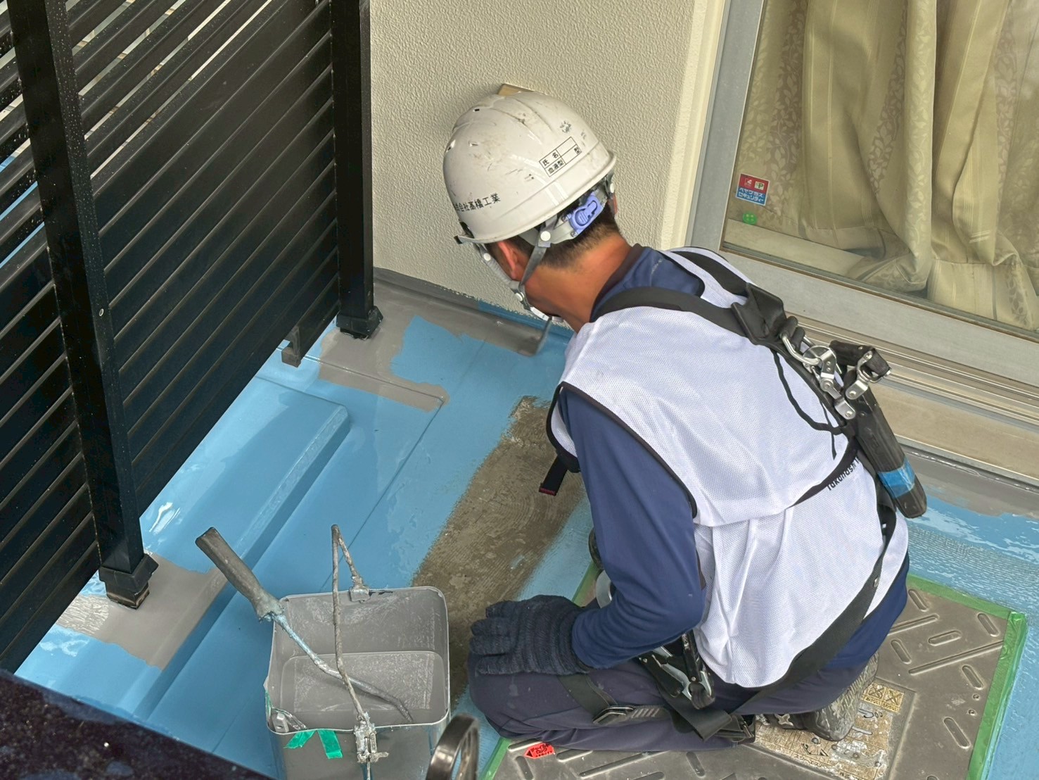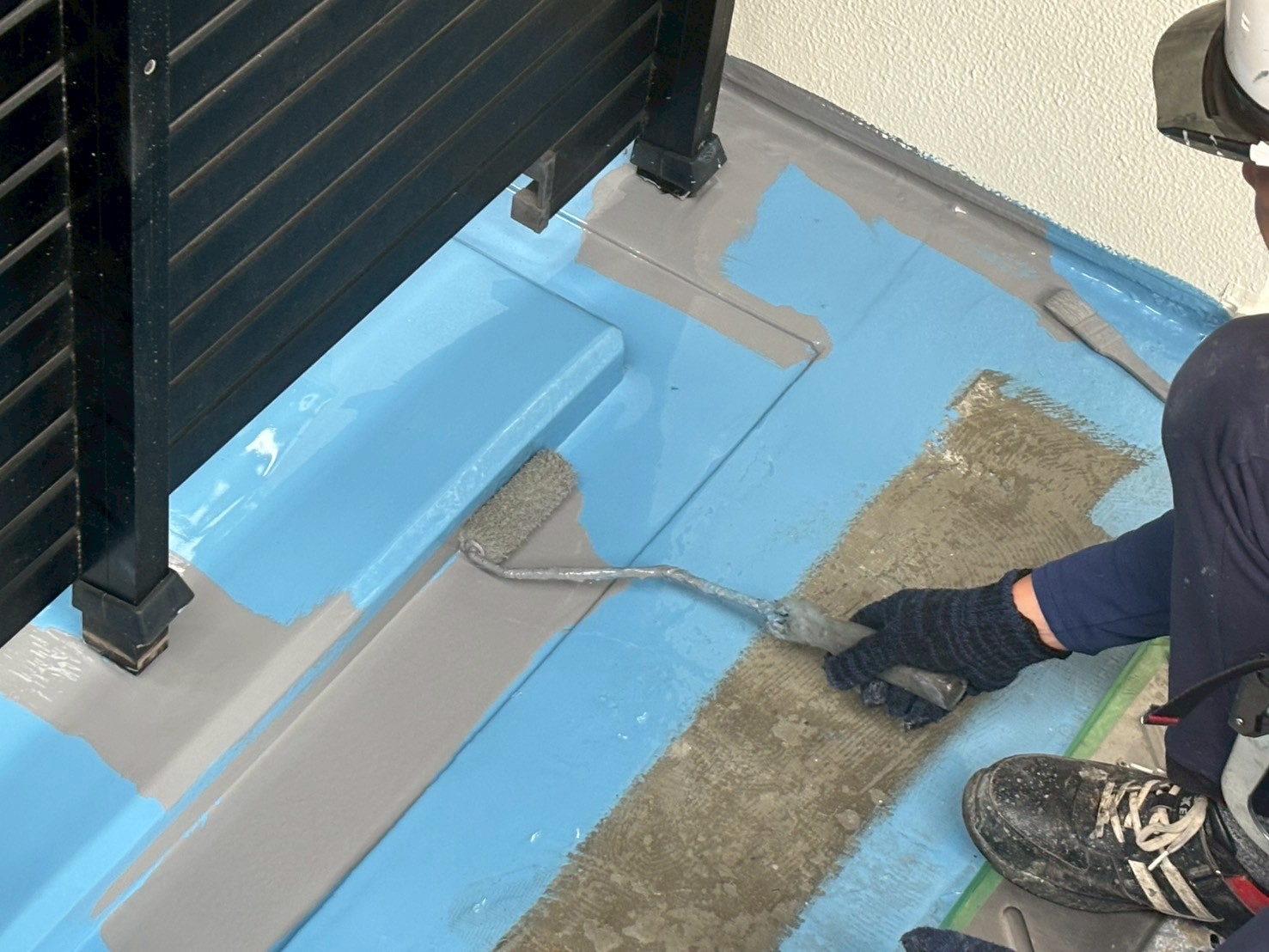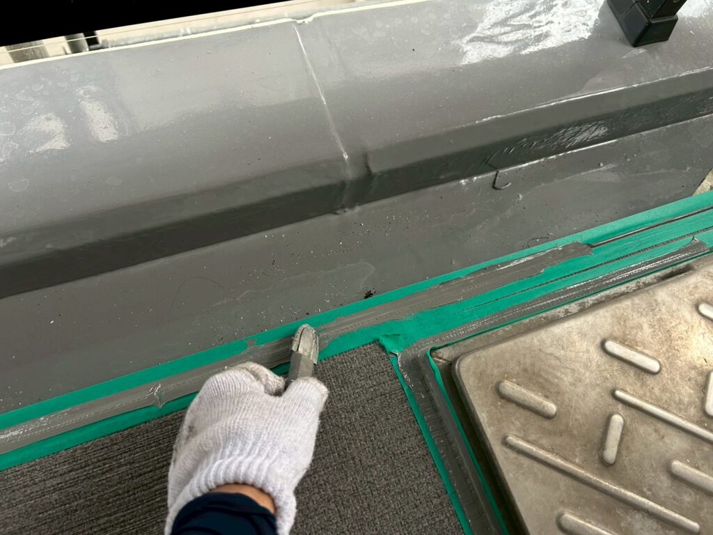 明日はバルコニー内に長尺シート材料の設置をおこない、引き続きウレタン防水工事の仕上げ作業します。