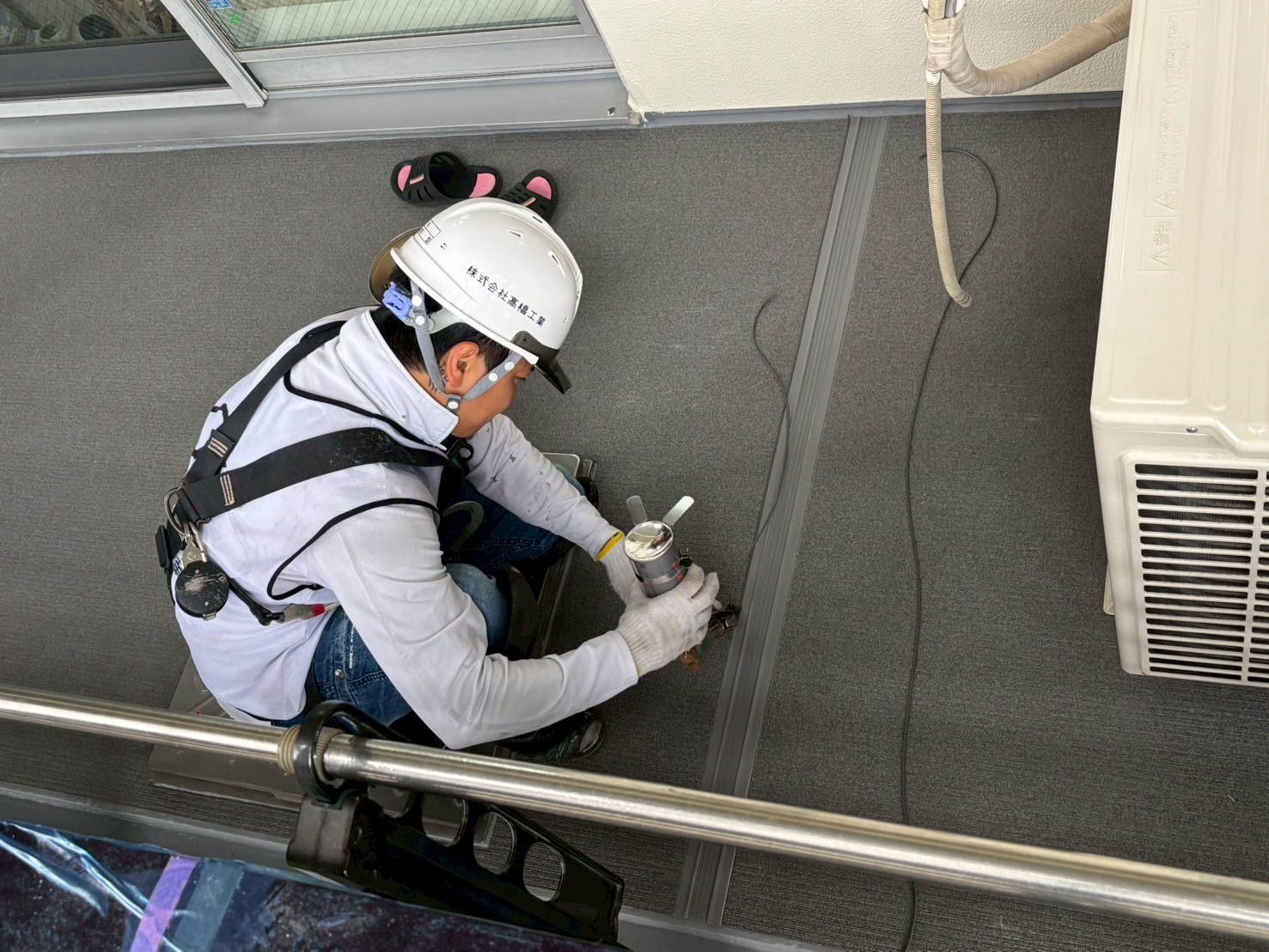 A棟バルコニー5階~2階の溶接接着工事、15階~端末シーリング打ち工事をいたしました。