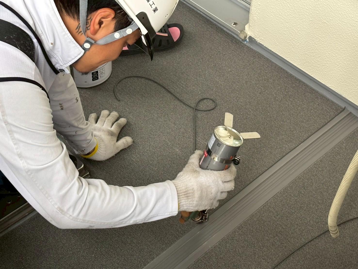 臭気の発生がありご迷惑をおかけいたします。また塗りたての床を踏まない注意して下さい。