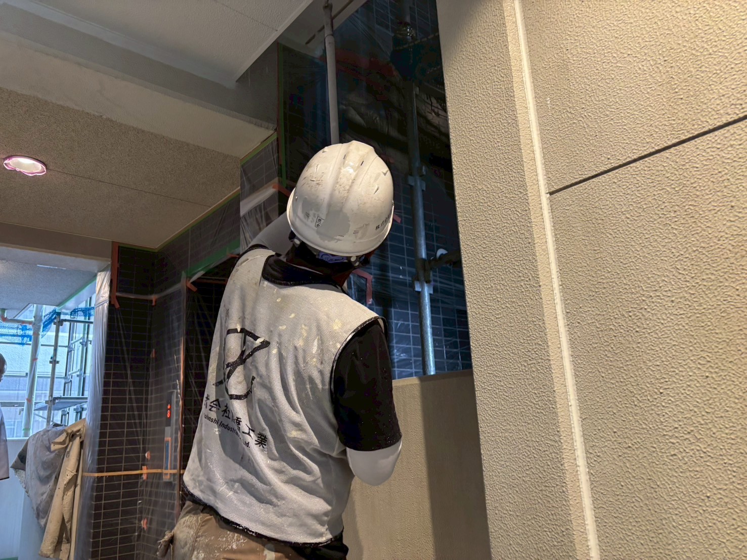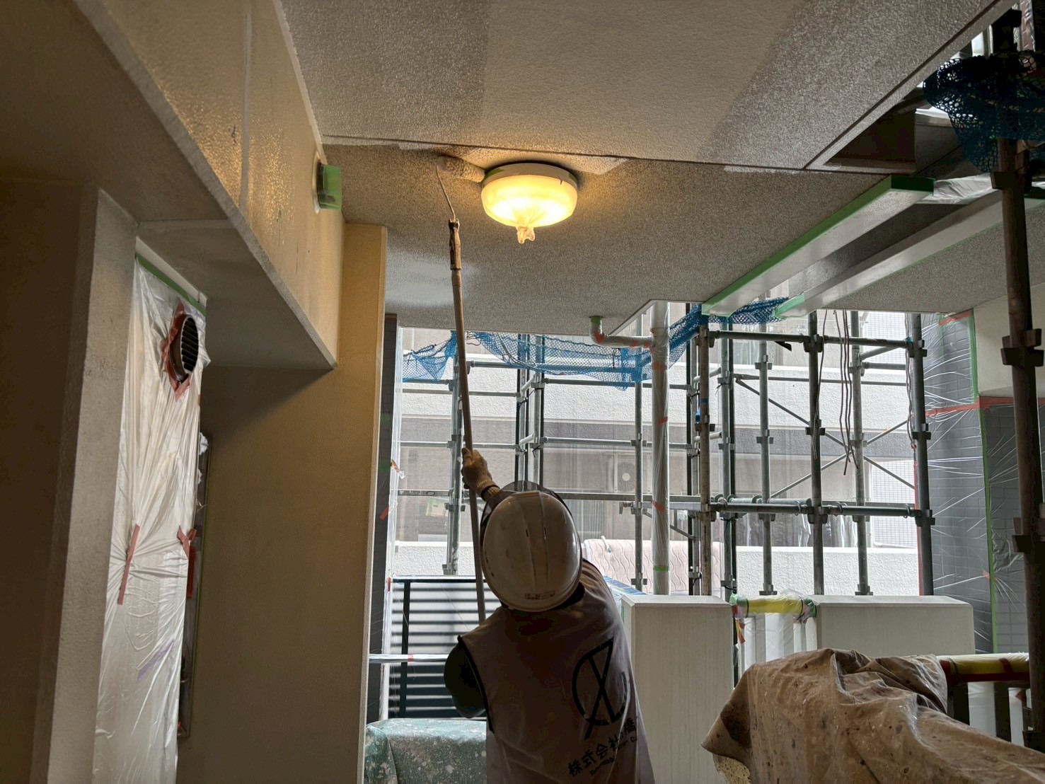 共用廊下9階~2階の天井、壁の塗装、また足場側からの腰壁の塗装をおこないました。