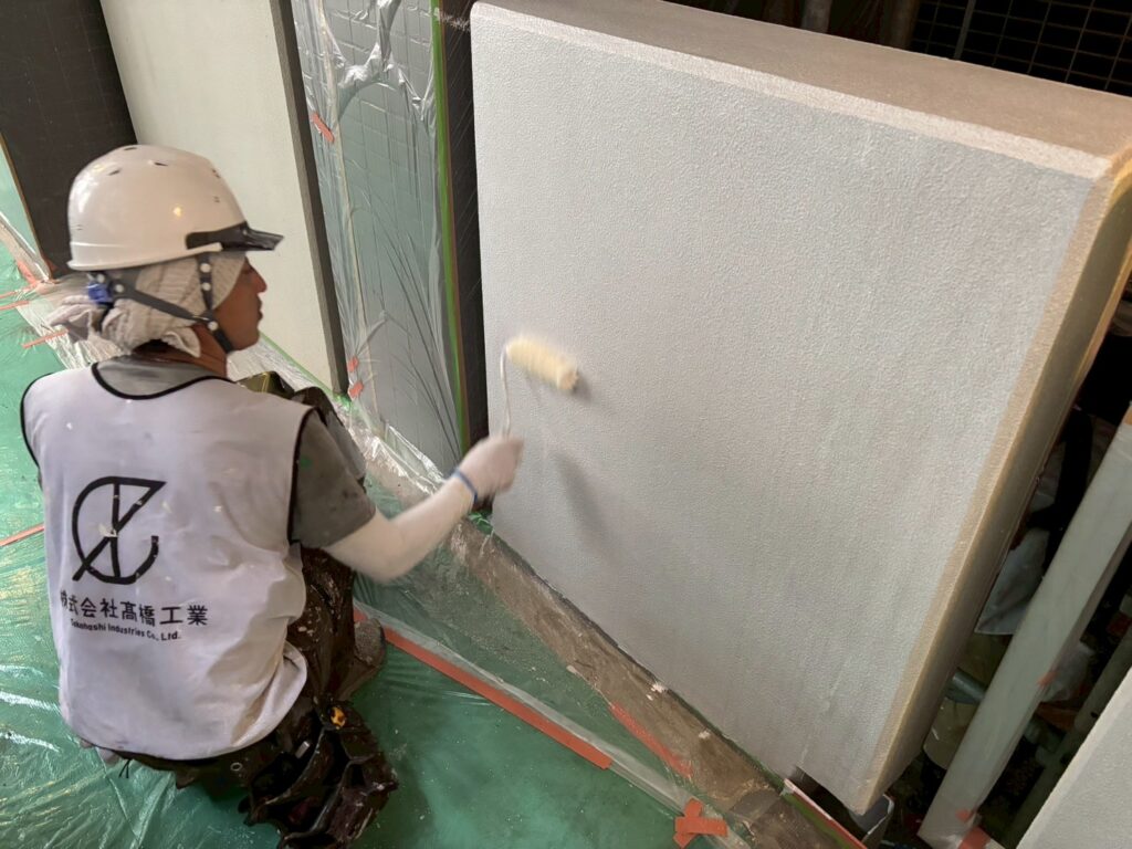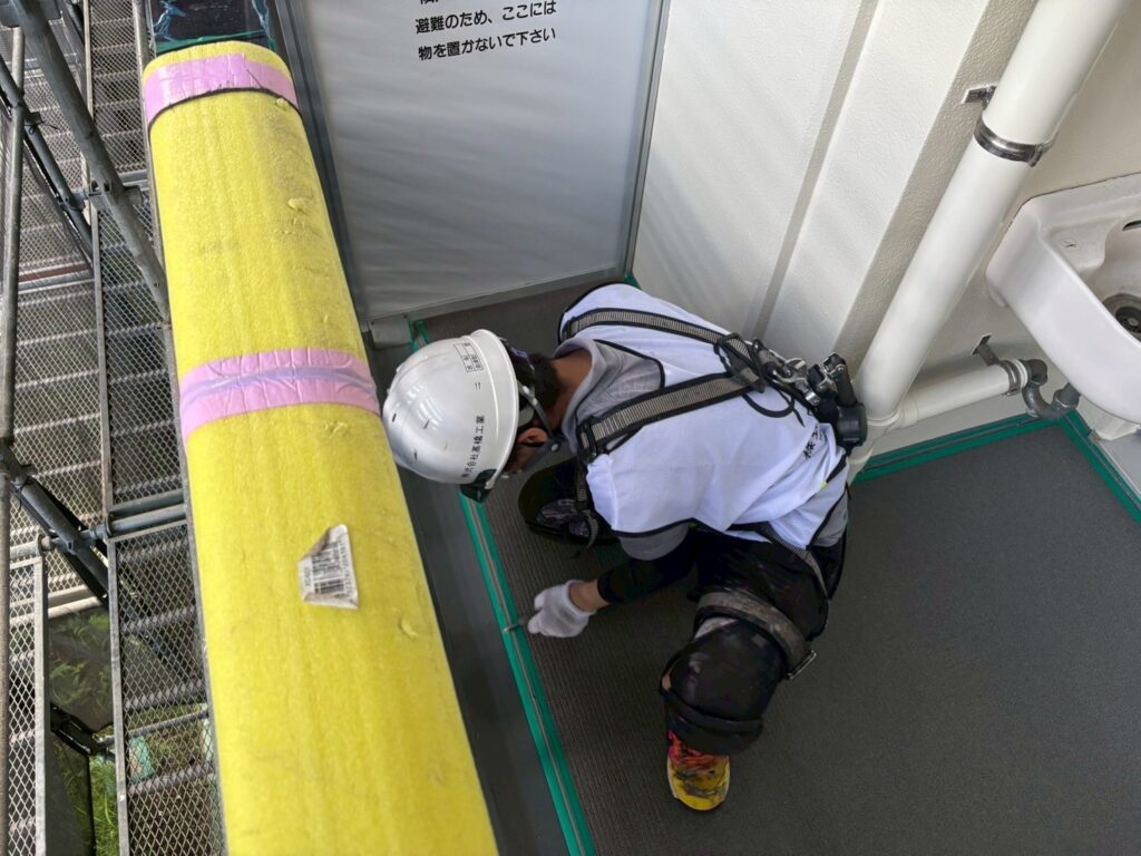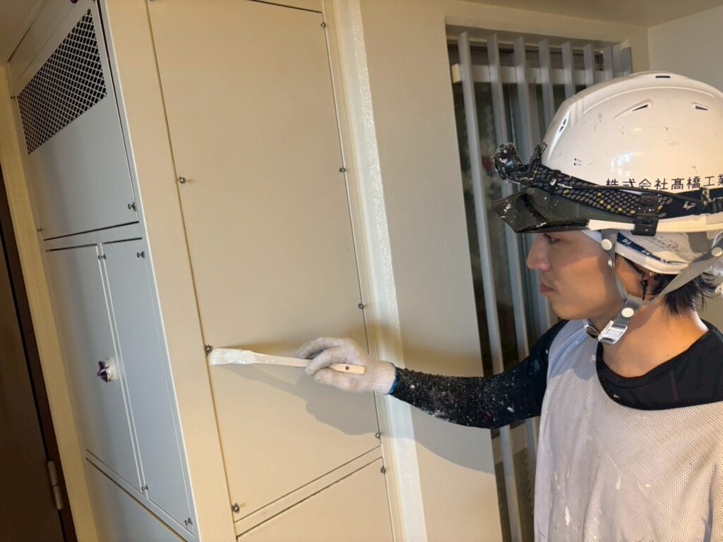 共用廊下8階から2階の壁、天井の塗装工事、15階から9階の足場側からの手直し工事をいたしました。
