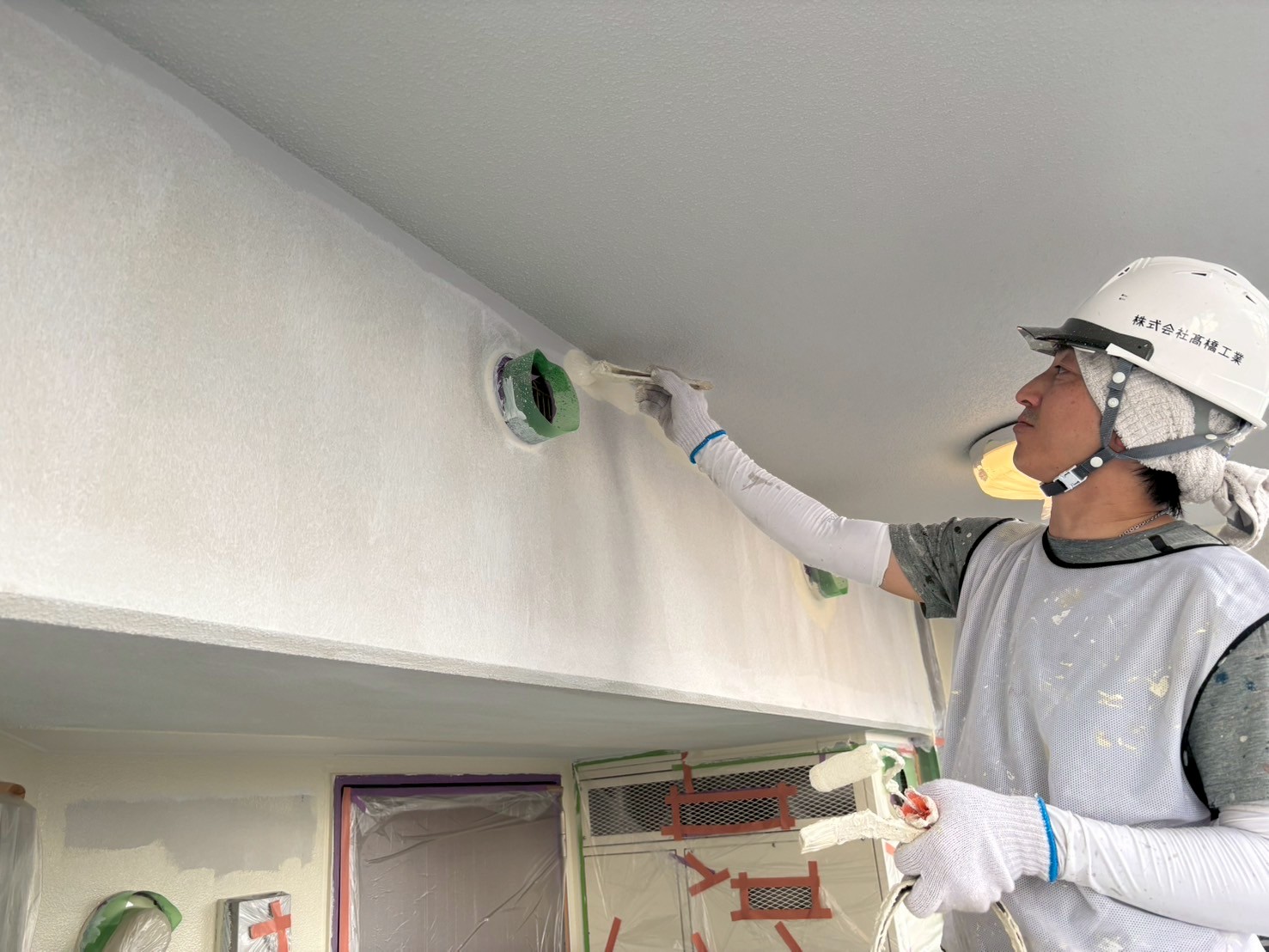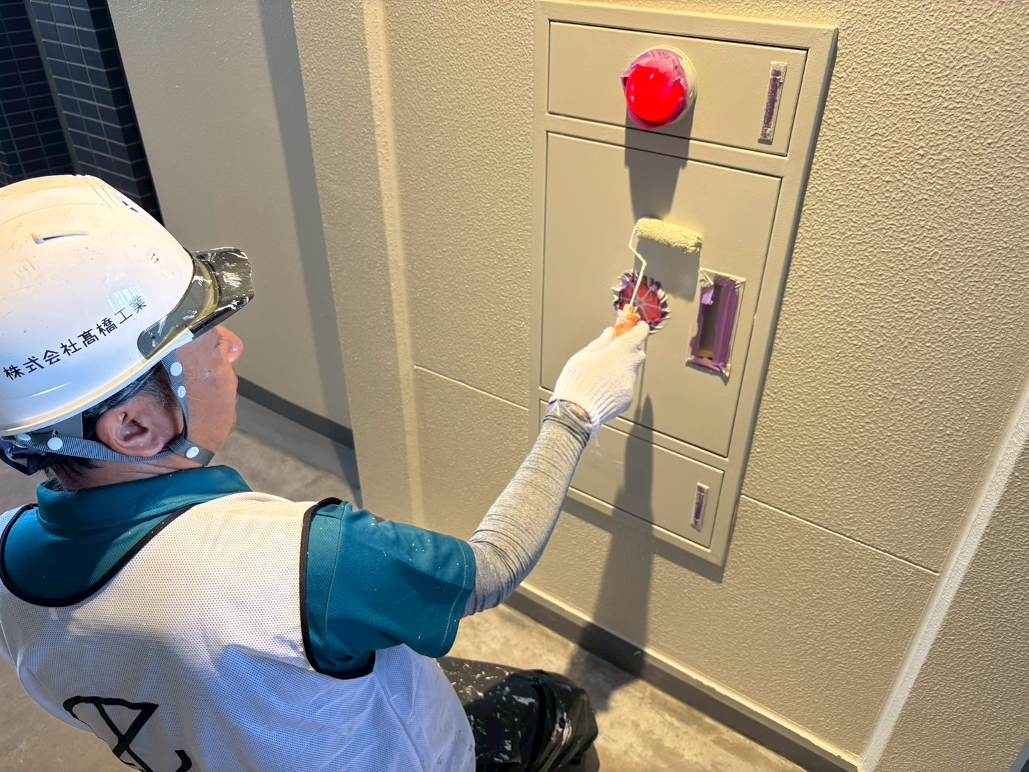 共用廊下8階から2階の壁、天井の塗装工事、15階から9階の足場側からの手直し工事をいたしました。