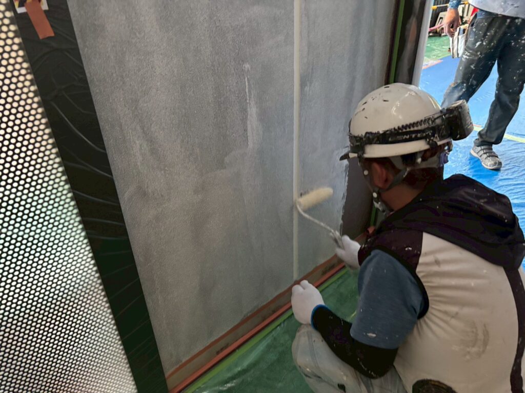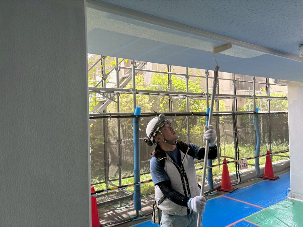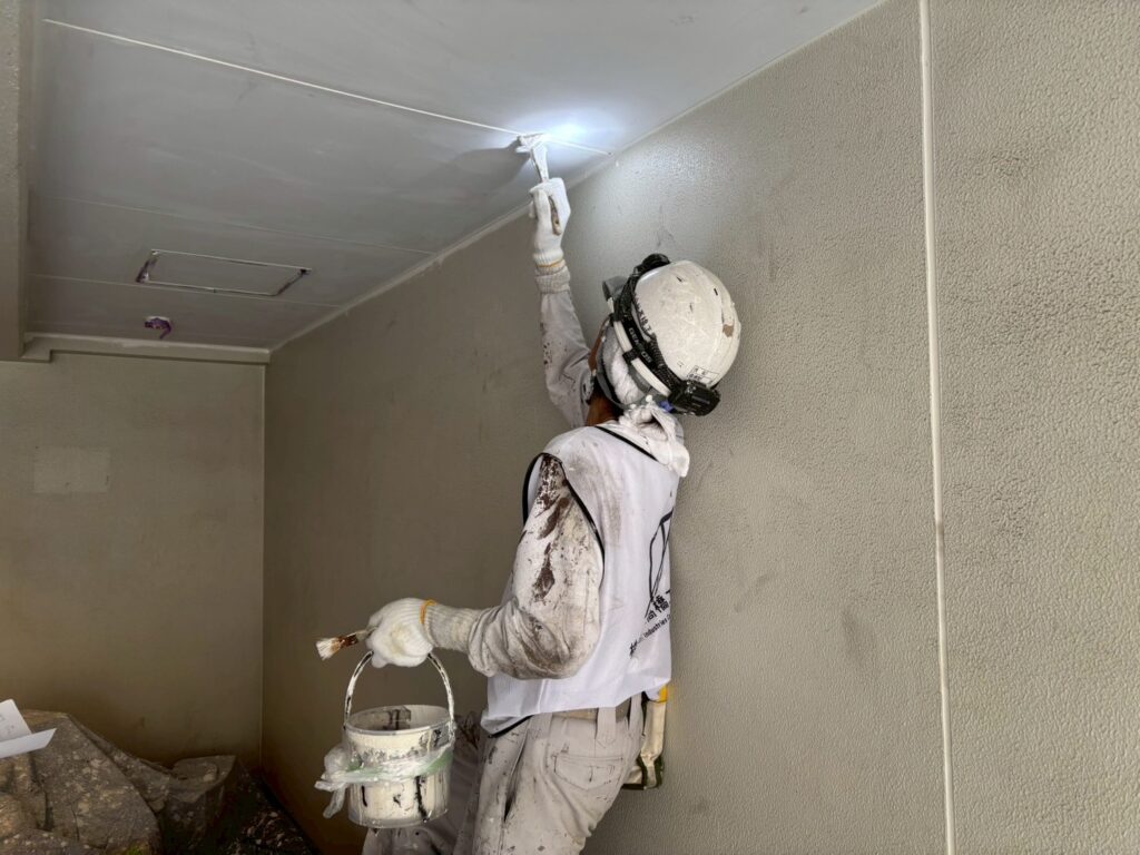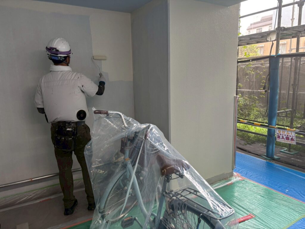 駐輪場の天井の塗装、駐輪場外壁の下塗りと中塗り塗装をおこないました。