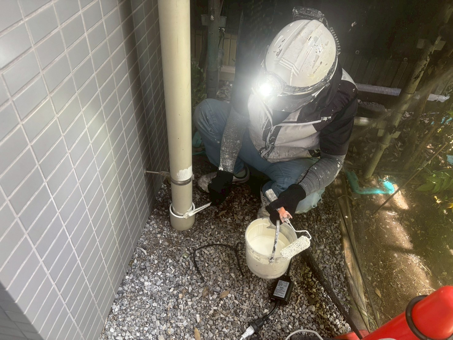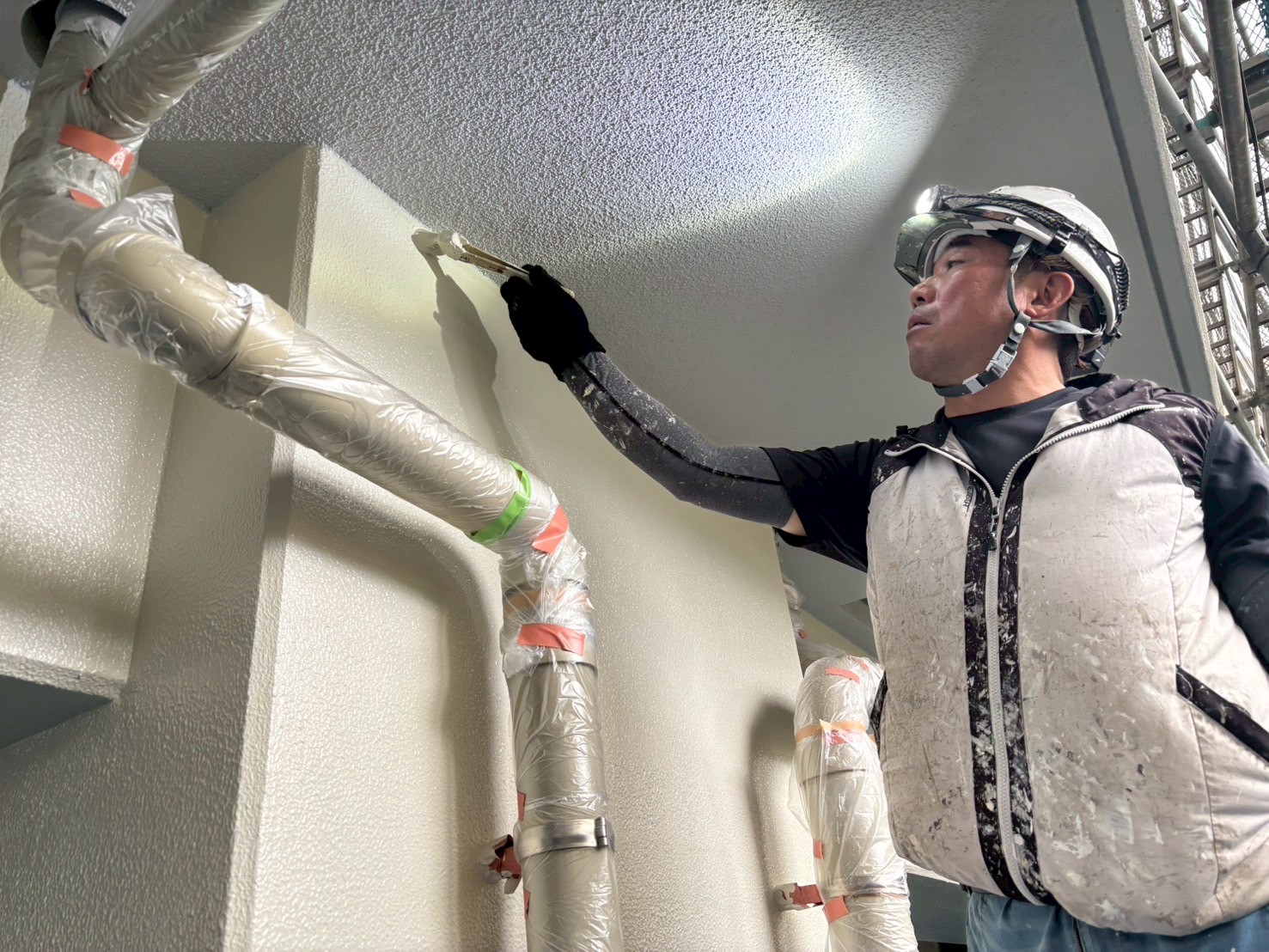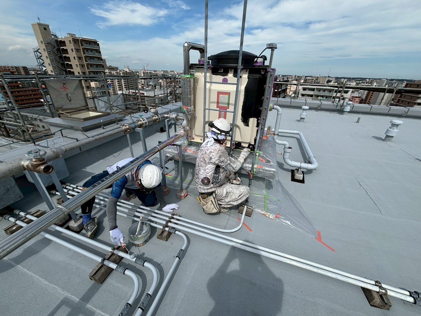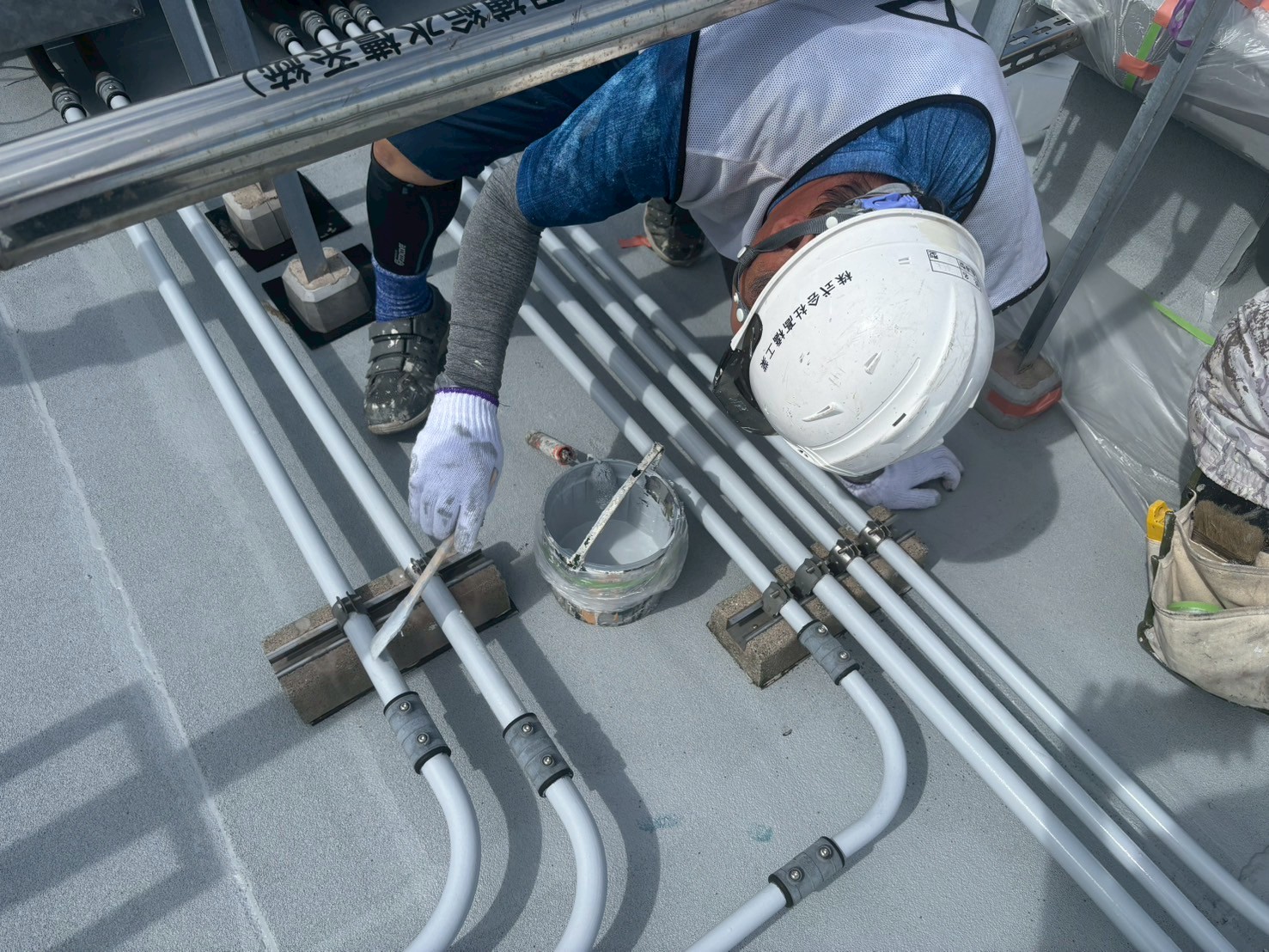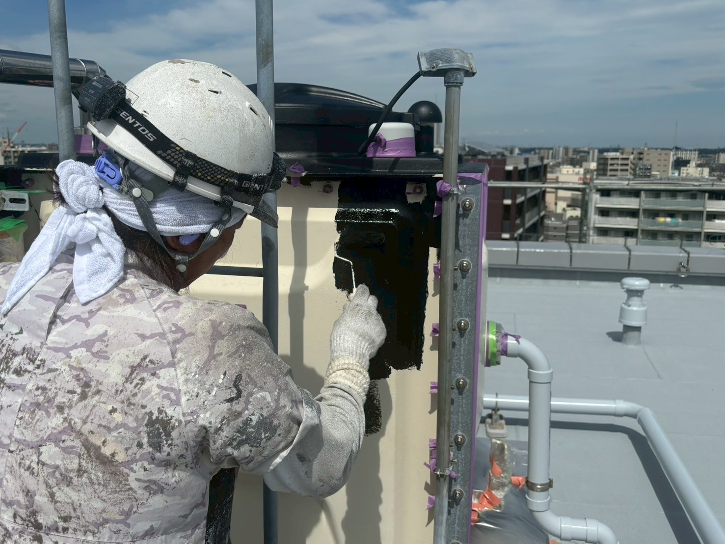 6月26日 木曜日 2025.06.28工事情報 HOME ブログ 工事情報 6月26日 木曜日 塗装工事 A棟屋上の鉄部塗装、共用部の雨樋塗装、駐輪場壁、車いす用駐車場の塗装をおこないました。 貯水タンク塗装の錆止めは貯水内の藻の発生や水質悪化防止、太陽光が入らないように黒色の下塗り(錆止め)塗装をしました。 中塗り、上塗りは白色になります。 ウレタン防水工事 8階から2階のウレタン防水工事、またぐ必要がある箇所の防水は完了し、壁際、側溝の防水を8階から始めました。 壁際に物を置く際は注意して下さい。また防水材の臭気が発生いたします。 工事情報 6月27日 金曜日 6月30日 月曜日 関連記事一覧 5月23日 金曜日 2025.05.26工事情報 6月5日 木曜日 2025.06.05工事情報 7月26日 土曜日 2025.07.28工事情報 7月5日 土曜日 2025.07.08工事情報