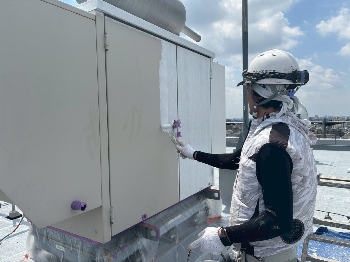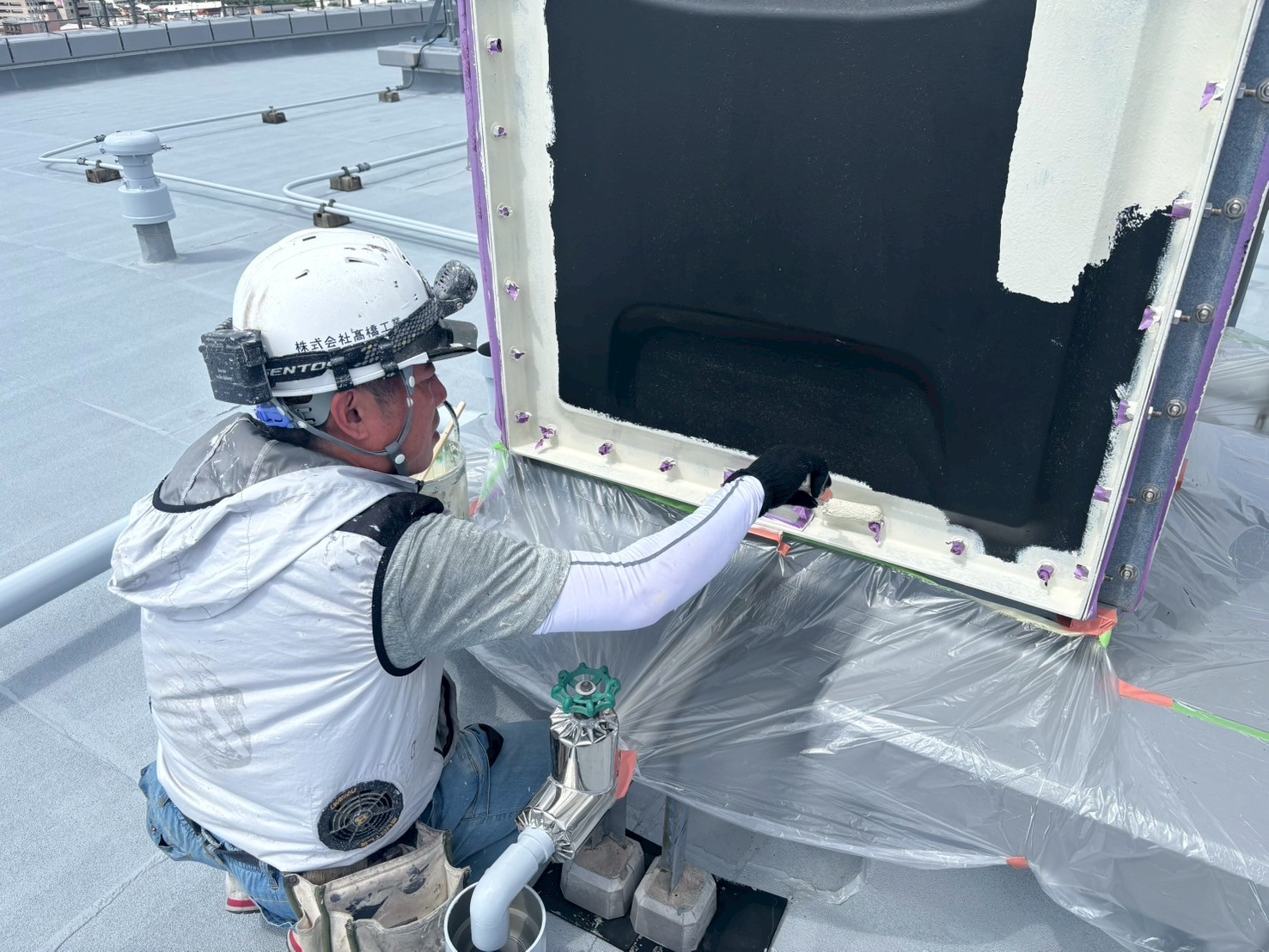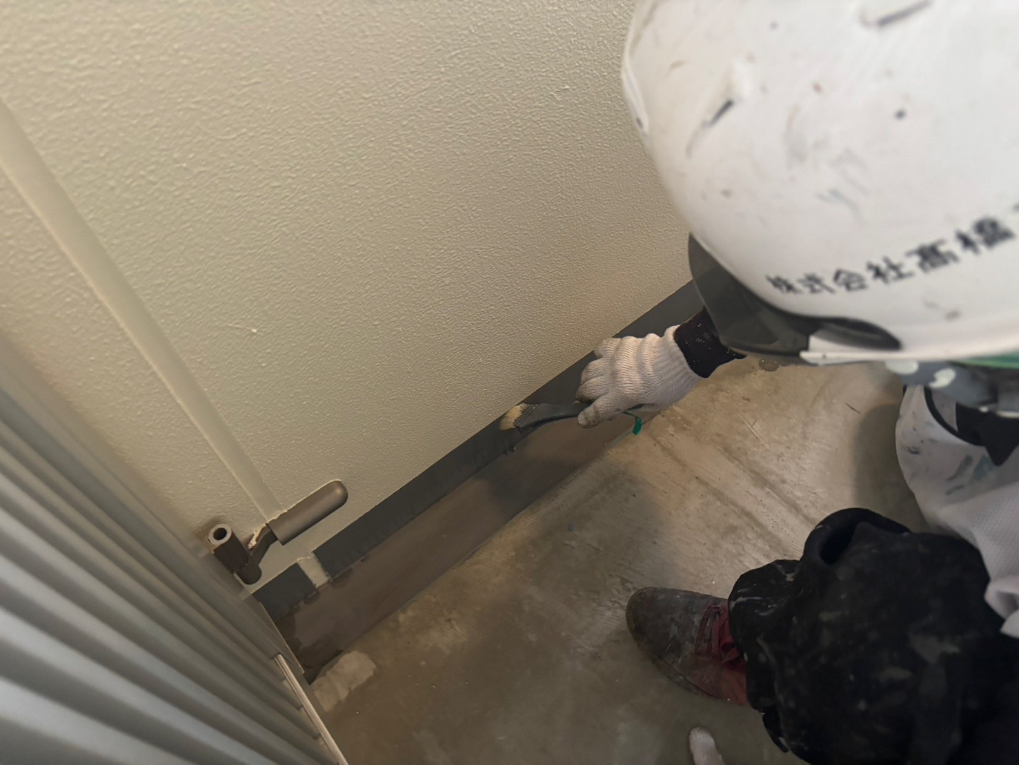 1階防災倉庫、RT室の外壁塗装、各ドアの錆止め、エキスパンションジョイントの裏の中塗り、A棟屋上の鉄部塗装を