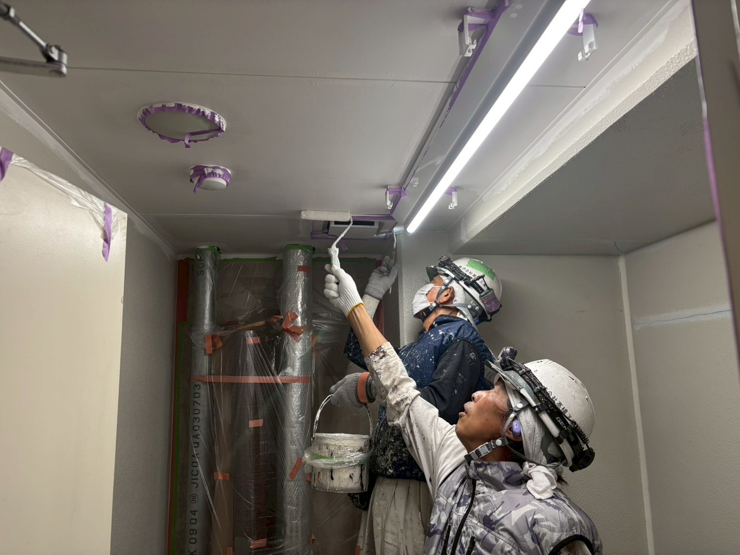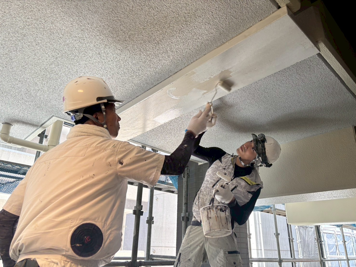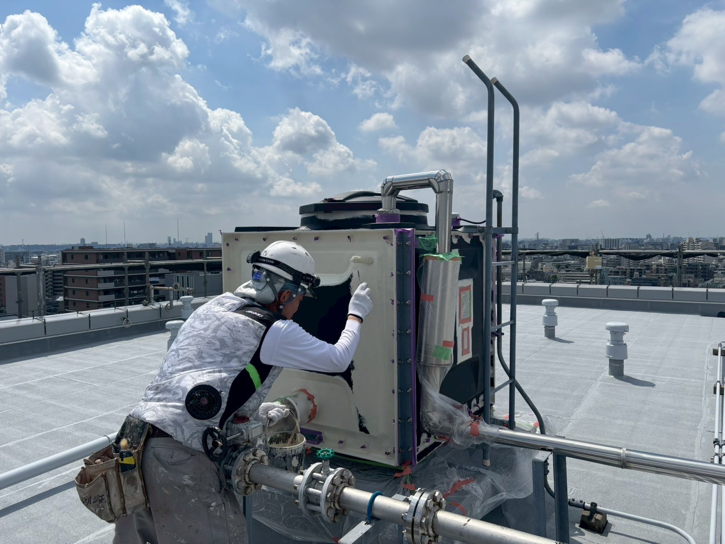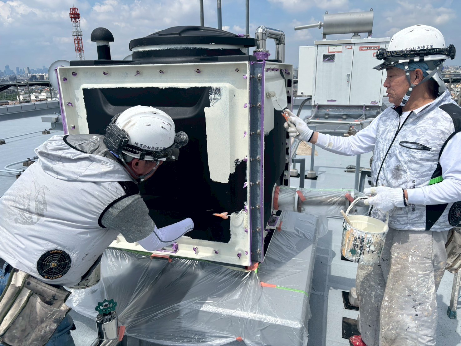 1階防災倉庫、RT室の外壁塗装、各ドアの錆止め、エキスパンションジョイントの裏の中塗り、A棟屋上の鉄部塗装を