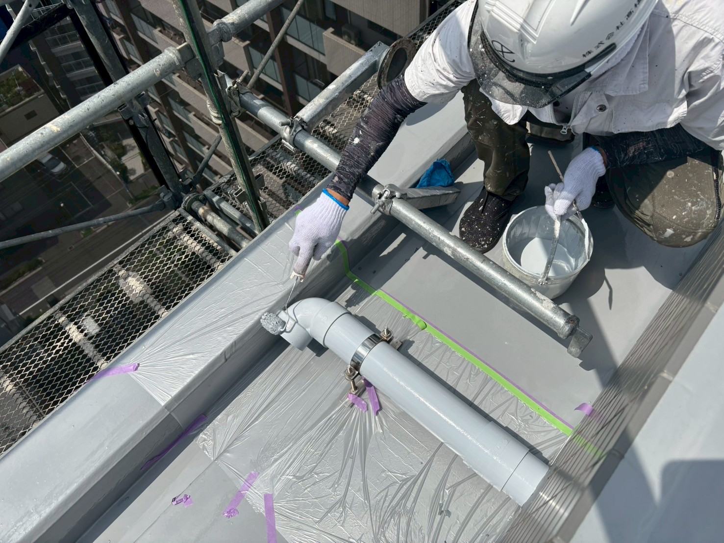 明日6月28日㈯は引き続き、8階から2階の側溝、壁際のトップコート塗布をおこないます。