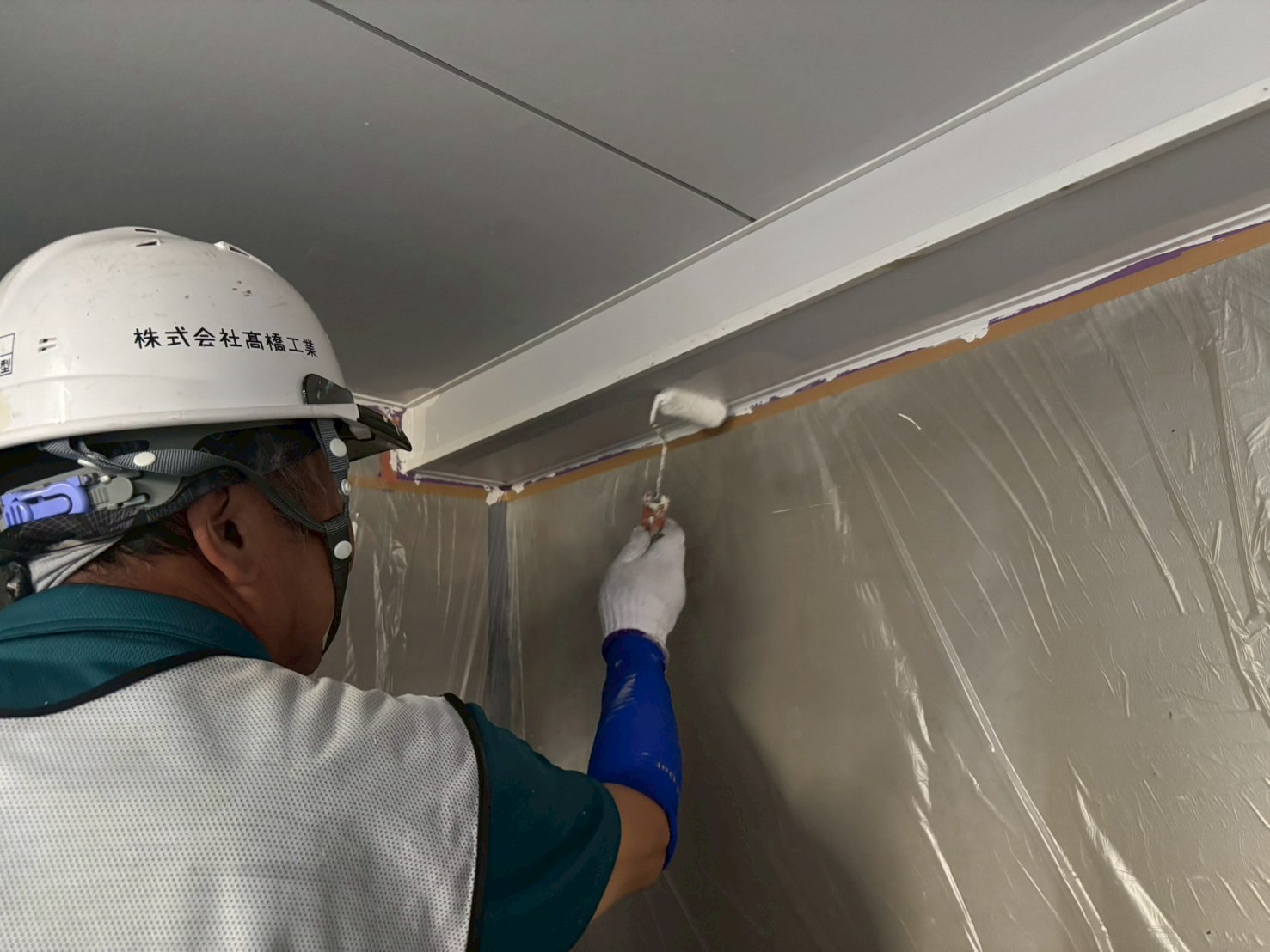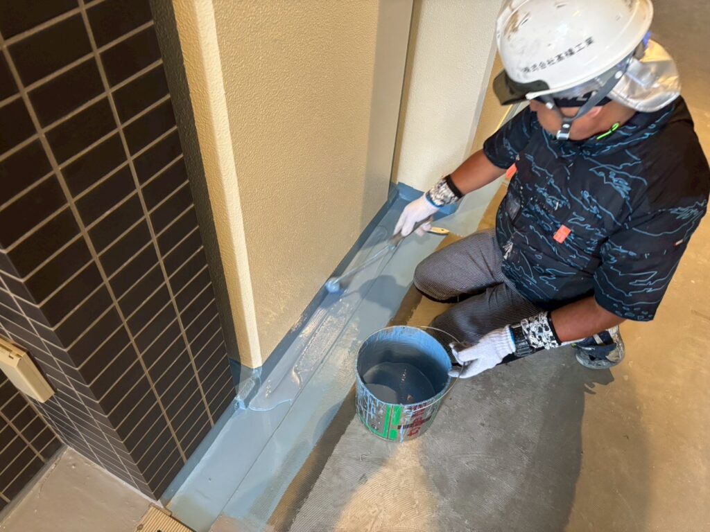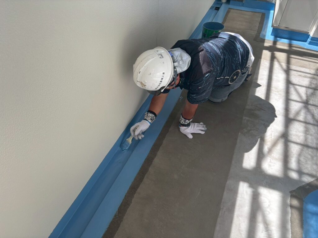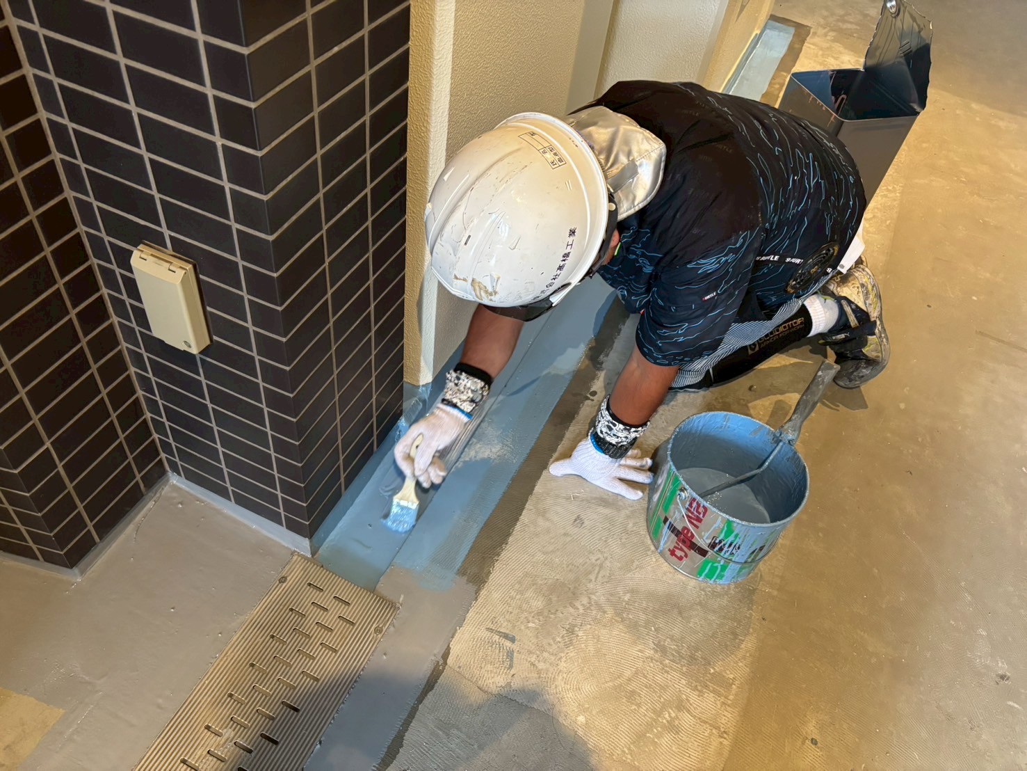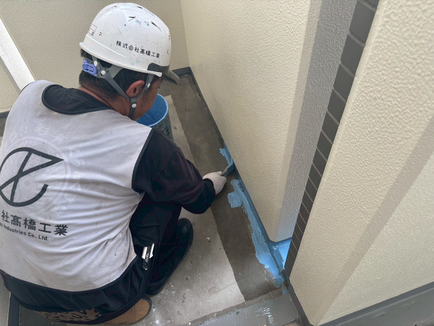 15階から2階の共用階段の踊り場と1段目のウレタン1層目作業、8階から5階の側溝の2層目をおこないました。