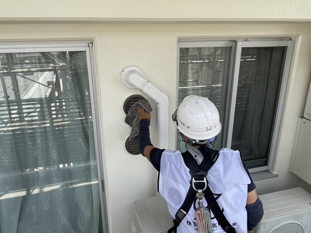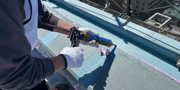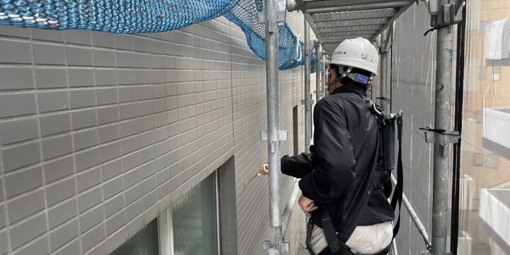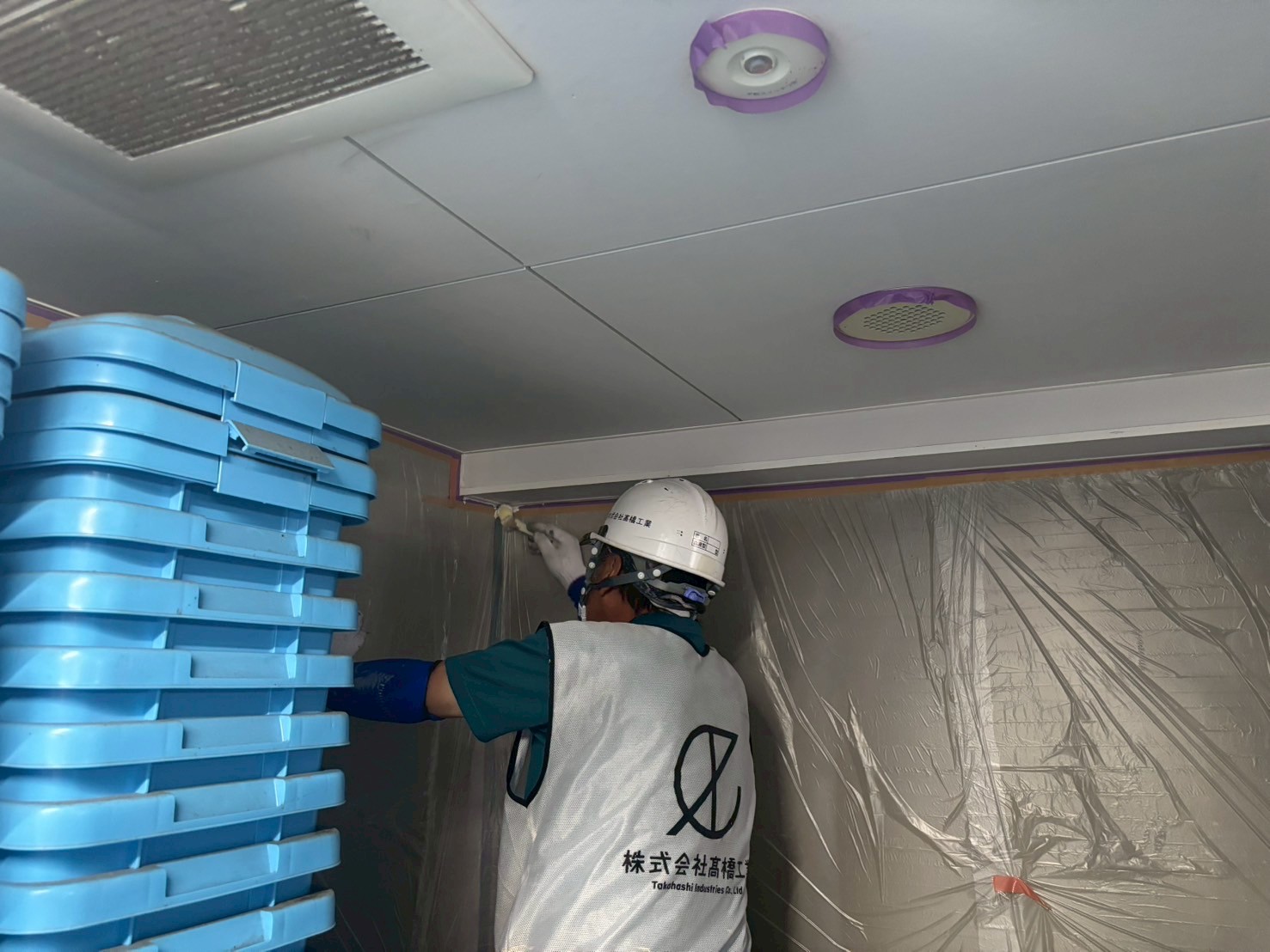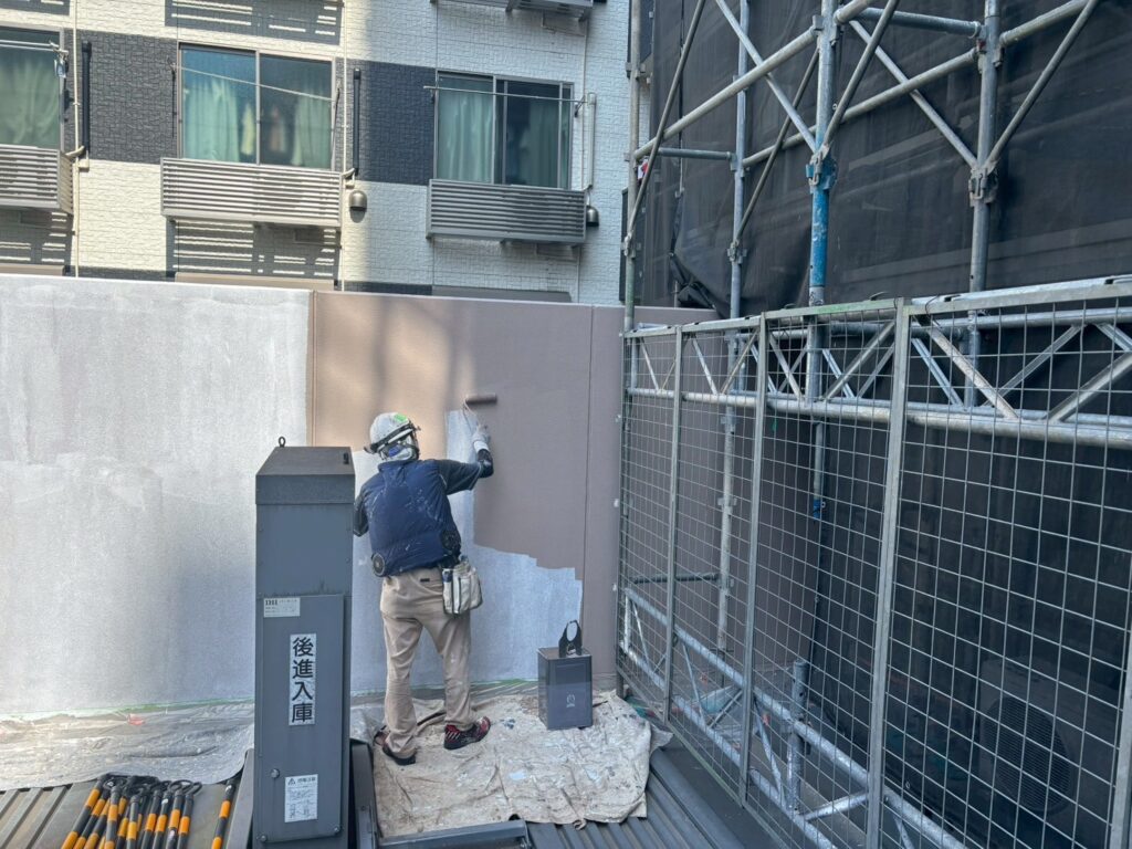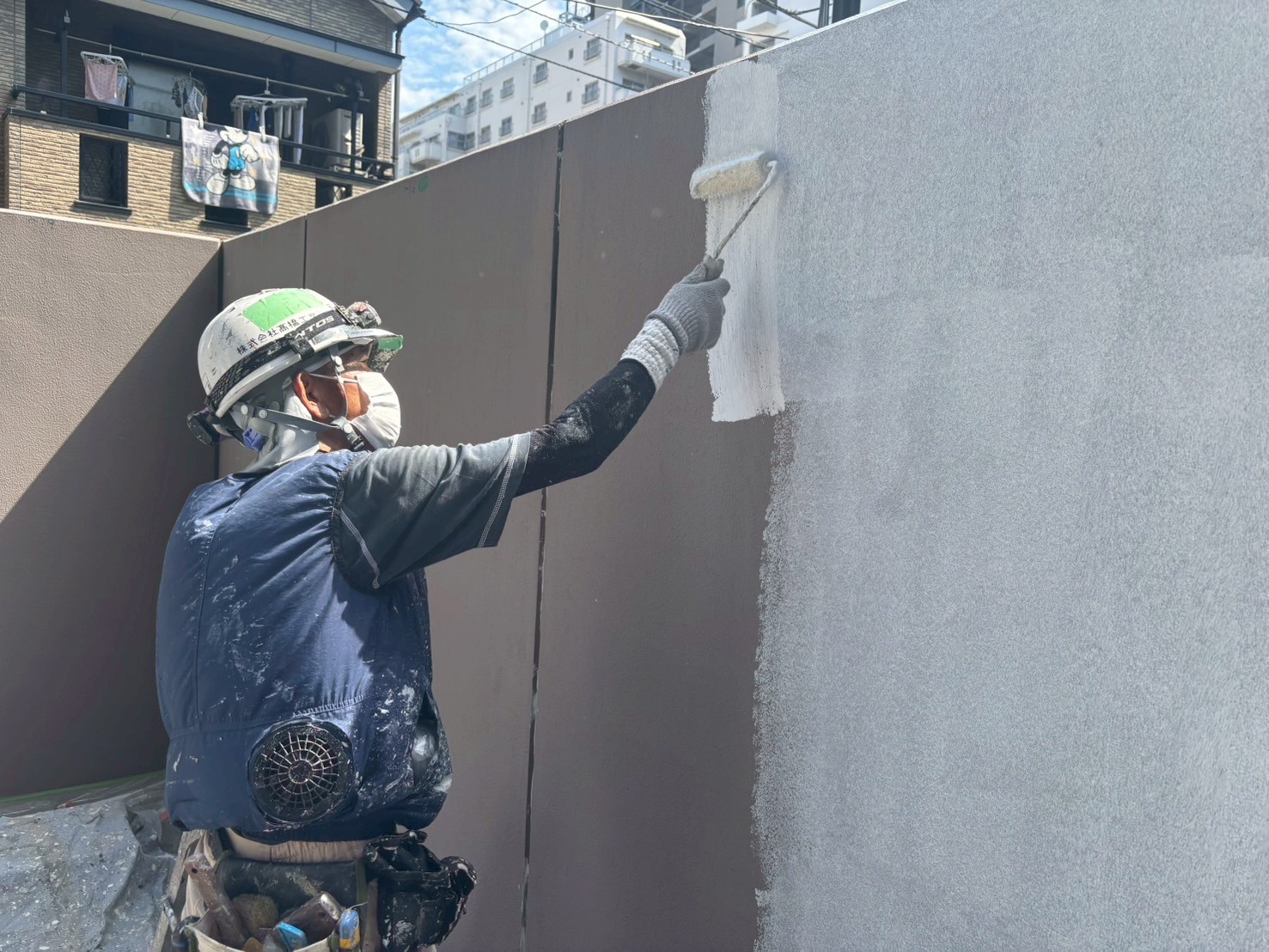 15階から2階の共用階段の踊り場と1段目のウレタン1層目作業、8階から5階の側溝の2層目をおこないました。