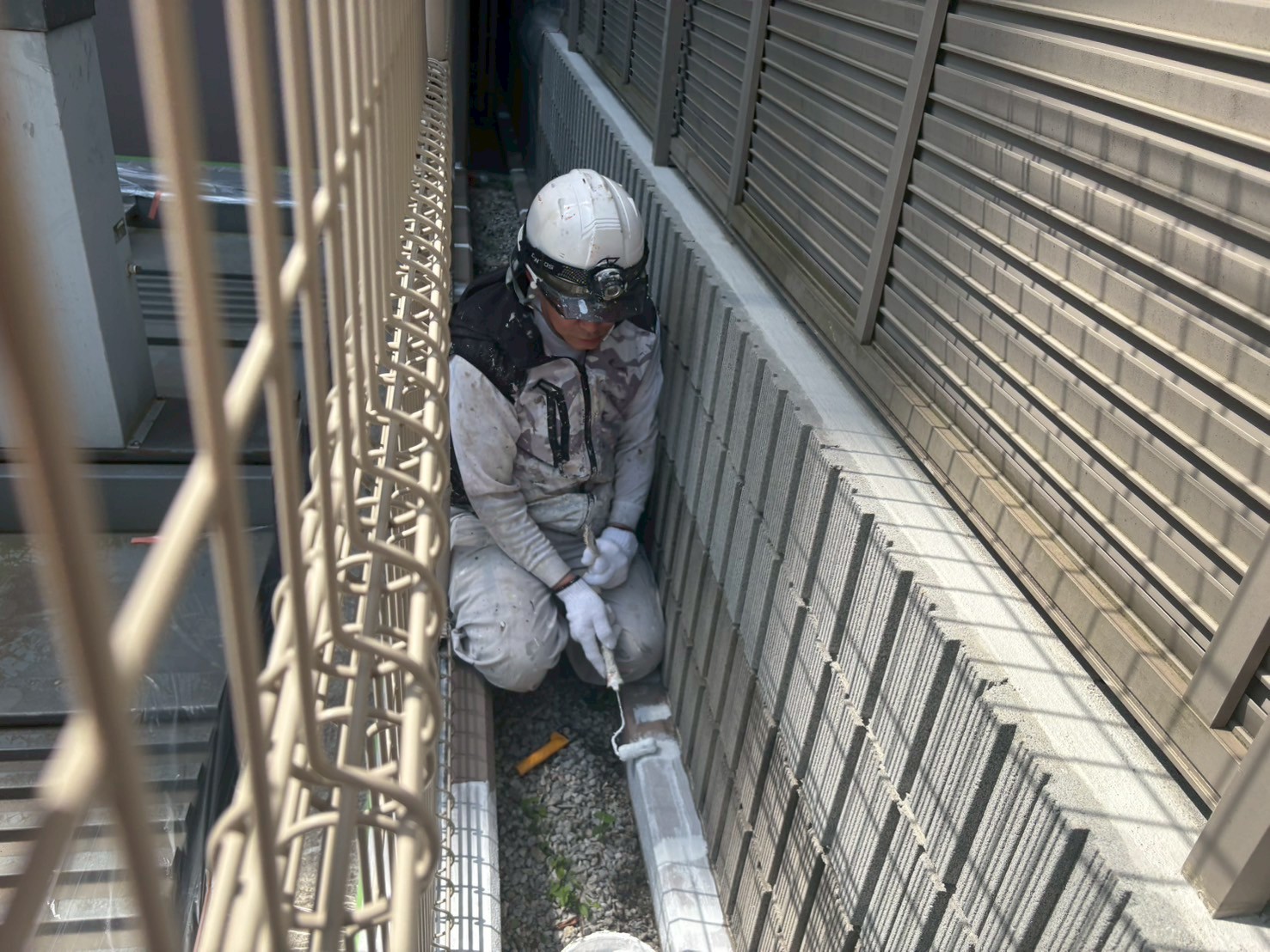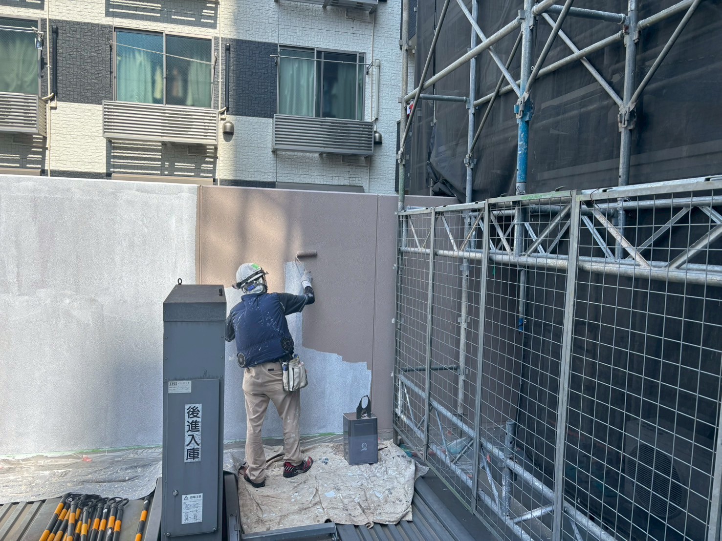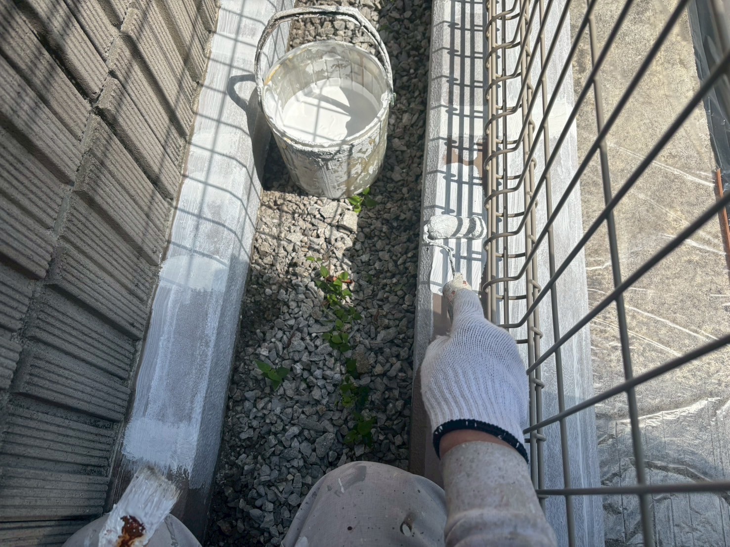 他ゴミ置き場内の天井の1回目の塗装を半分まで、外回り外構下塗りをいたしました。
