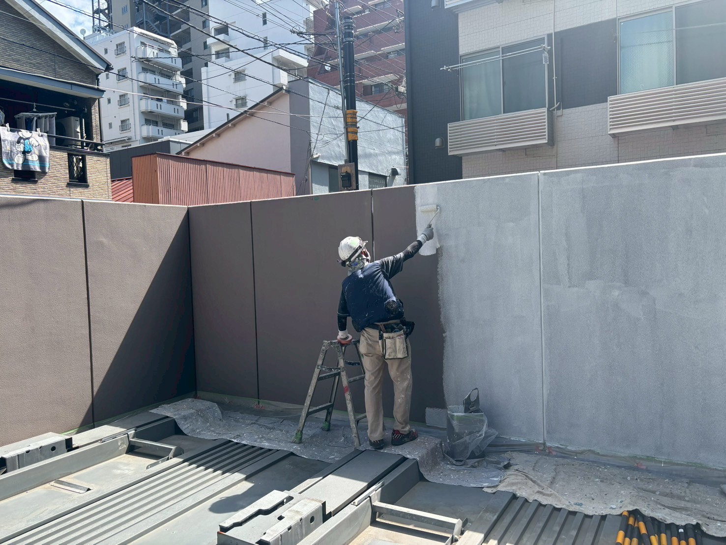 駐車場の内壁を下塗り・中塗りまで作業し、外壁を下塗り塗装をおこないました。