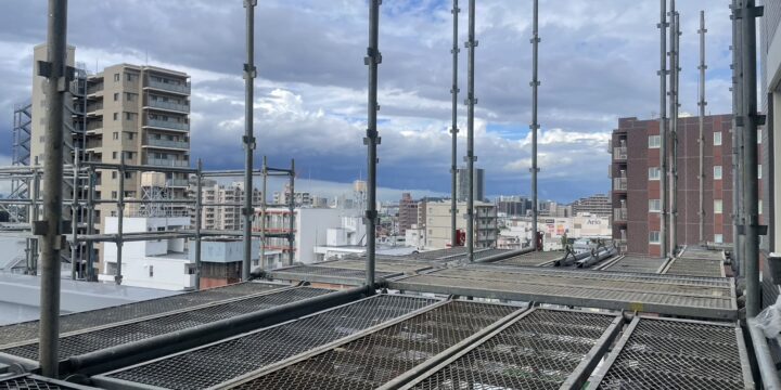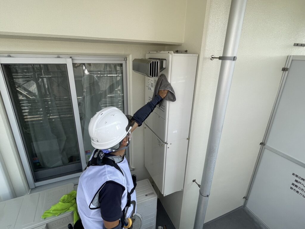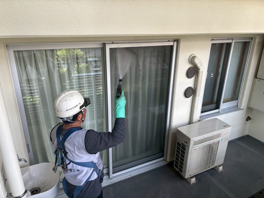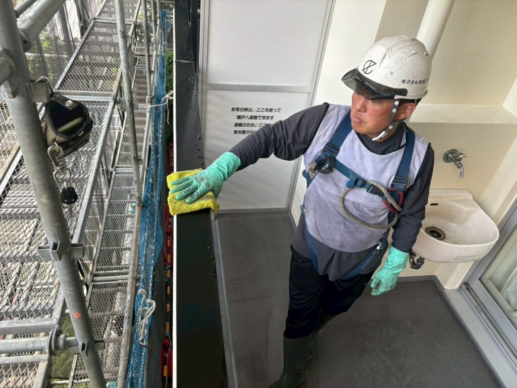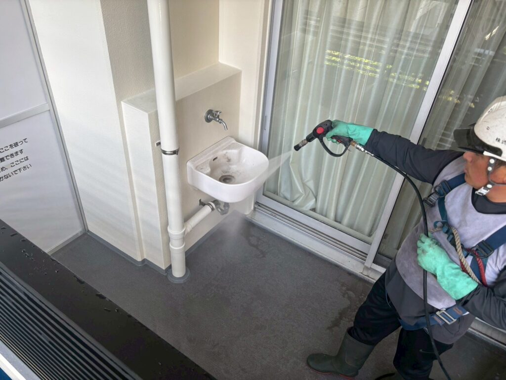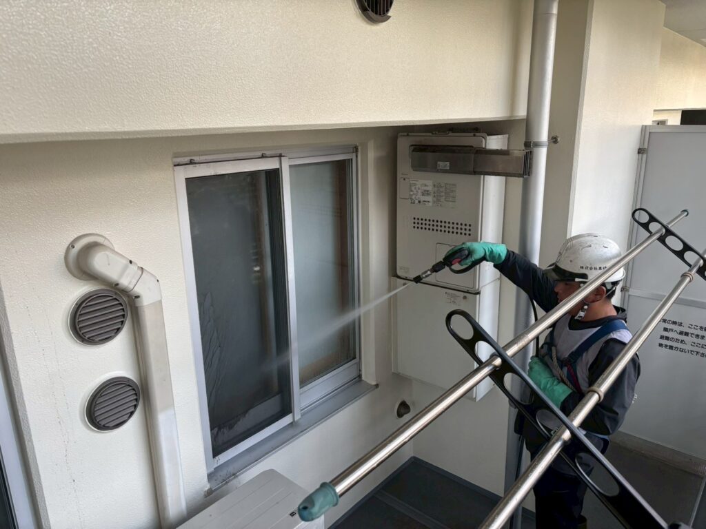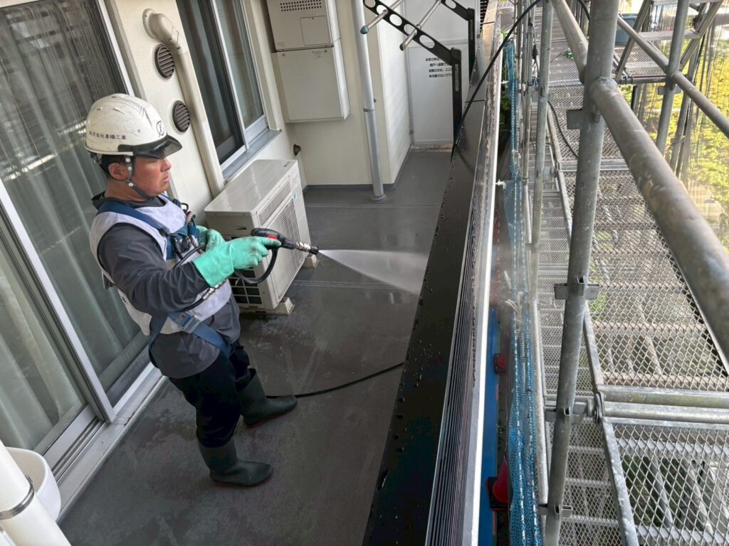 A棟15階から2階のバルコニー高圧洗浄工事、15階から5階のクリーニング工事、西側駐輪場ラックのの高圧洗浄を