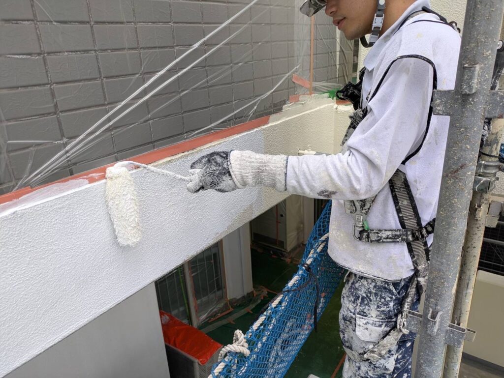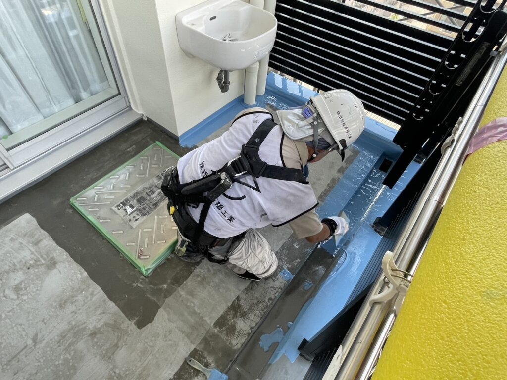 B棟バルコニーのケレン・清掃作業、プライマー塗布をおこない、12階から5階のバルコニーのウレタン防水1層目まで