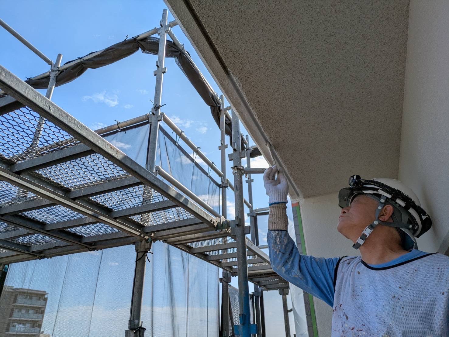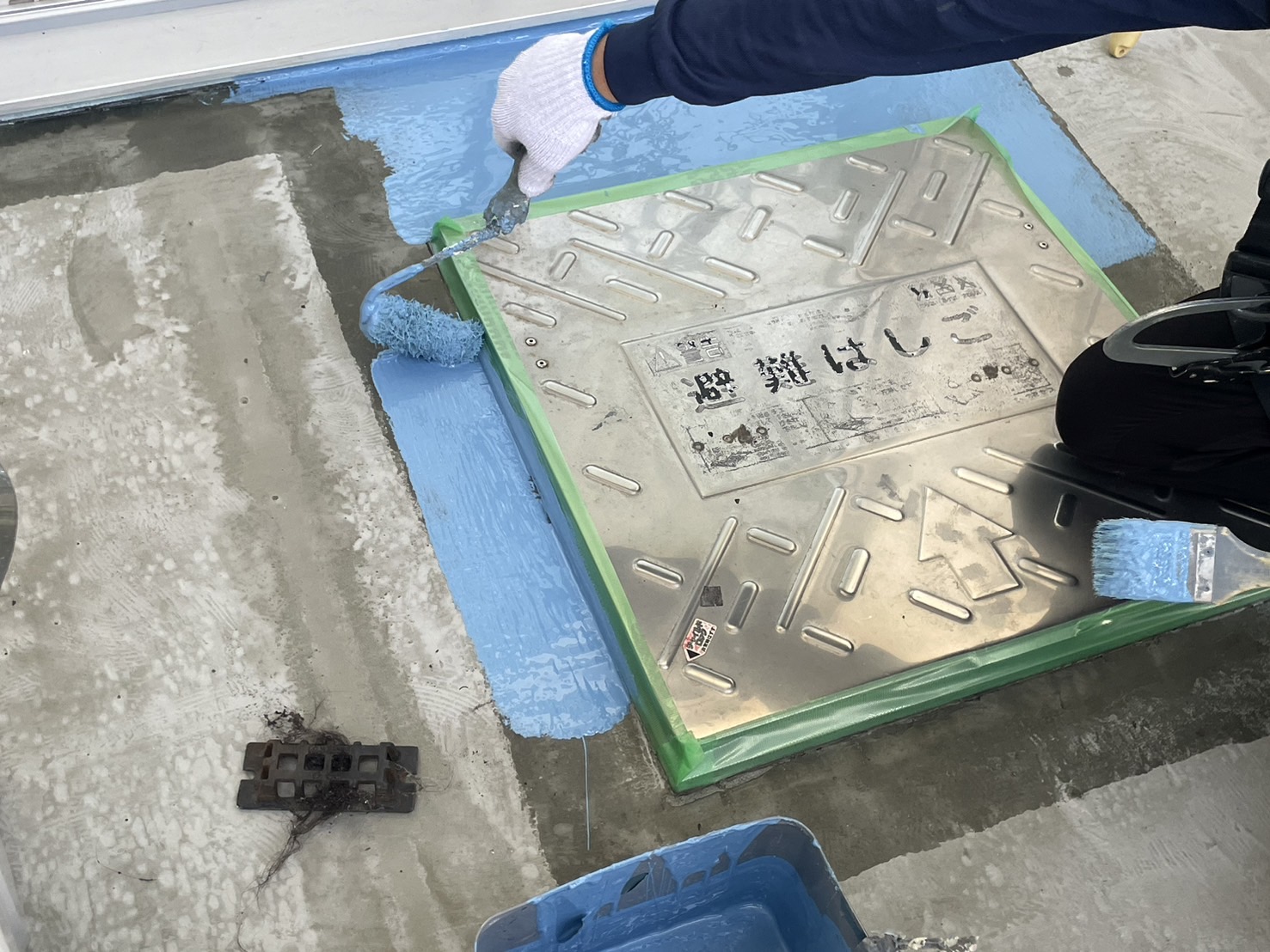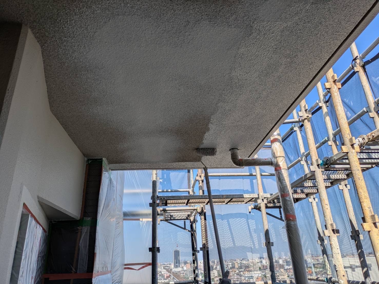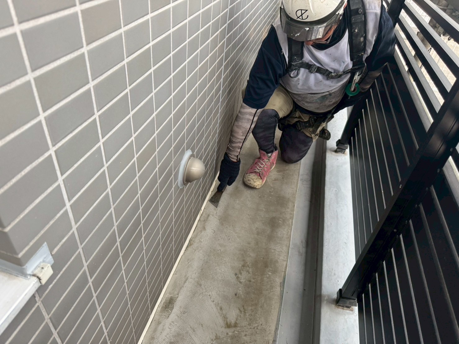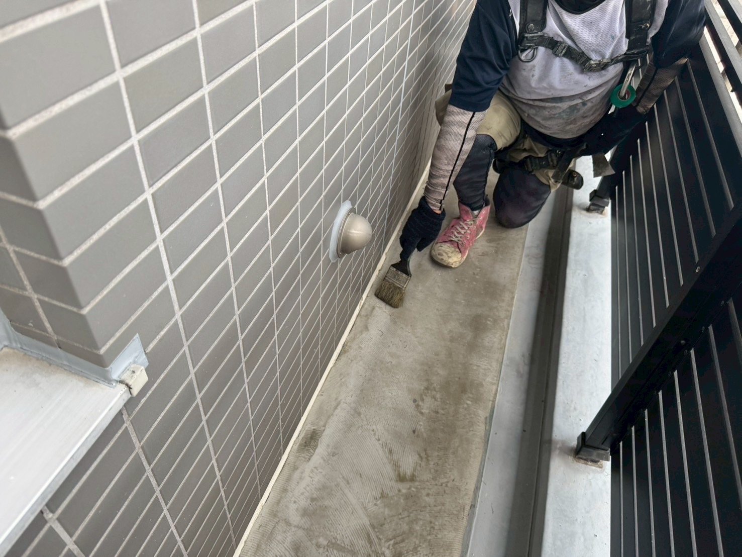 B棟バルコニーのケレン・清掃作業、プライマー塗布をおこない、12階から5階のバルコニーのウレタン防水1層目まで